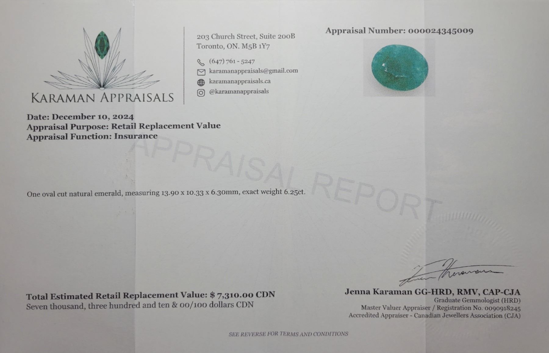 One oval cut natural emerald, measuring 13.90 x 10.33 x 6.30mm, exact weight 6.25ct. Estimated Retail Replacement Value: $ 7,310.00 CDN
