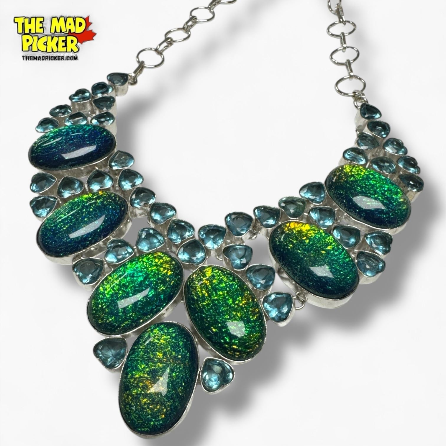 Opal Triplet & Heart Shaped Blue Crystal Gemstone Collar Necklace in Silver Setting Center of collar has a 2.5" drop