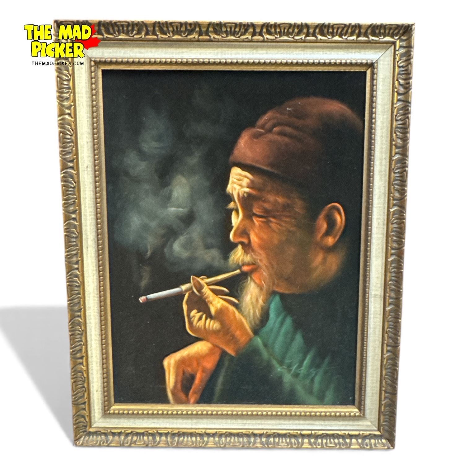 Original Painting on Velvet of Man Smoking Opium Artist Signed 23x29"
