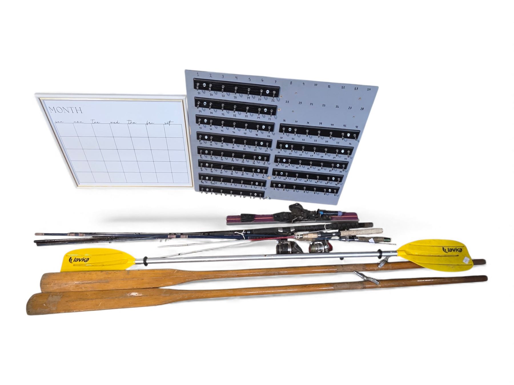 Outdoor Sports Equipment Bundle: Fishing Rods, Paddles, and Dry Erase Board