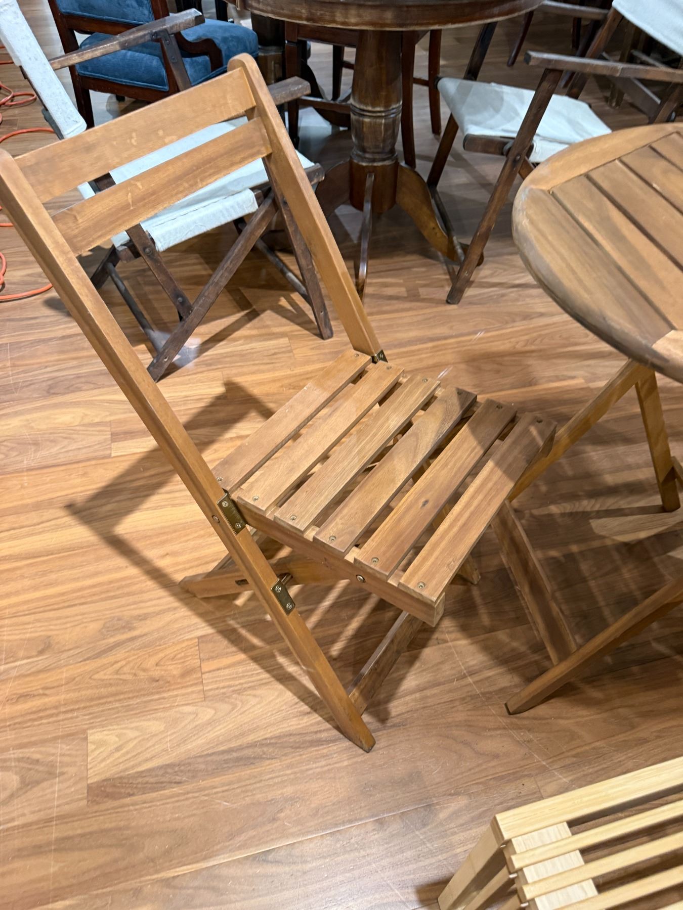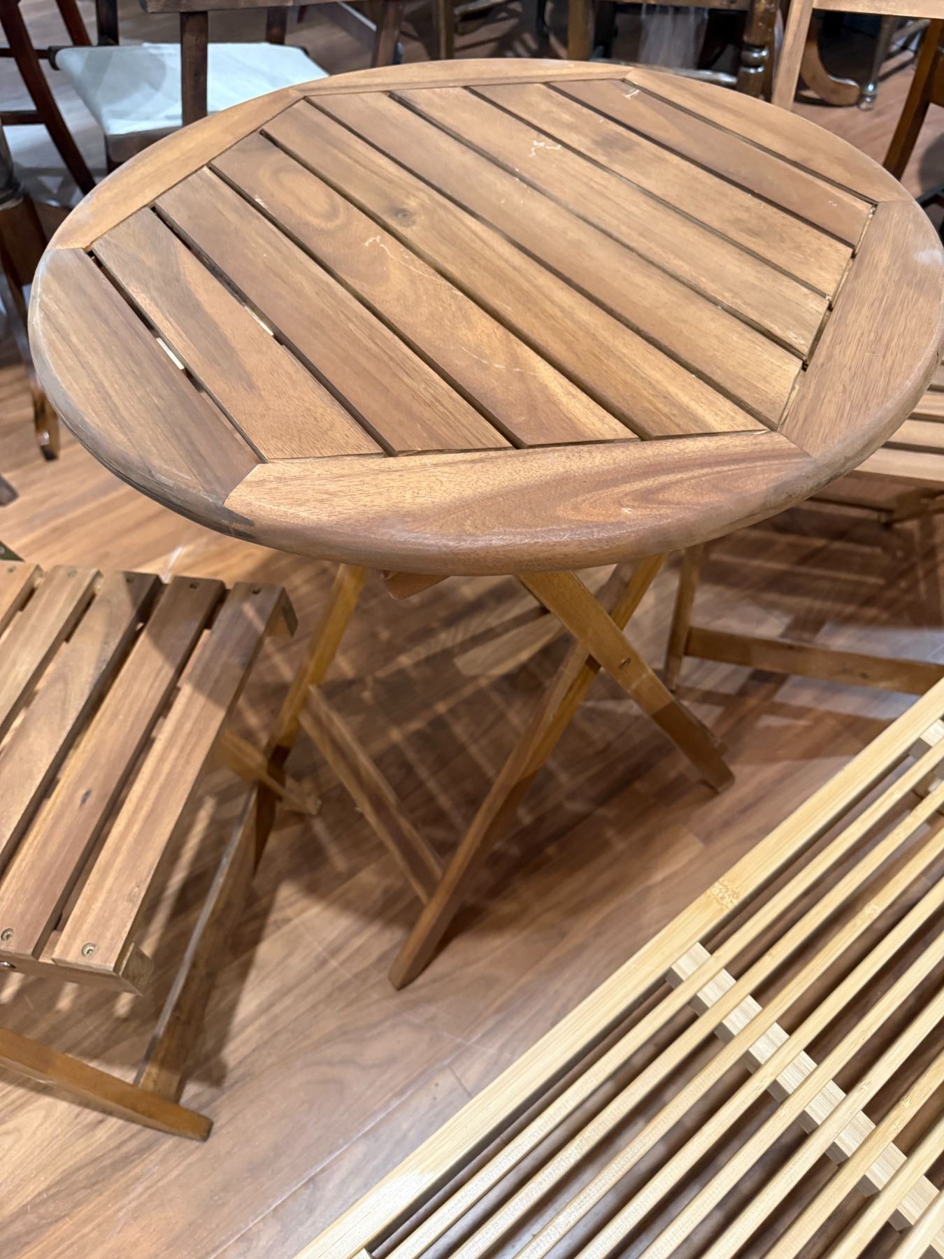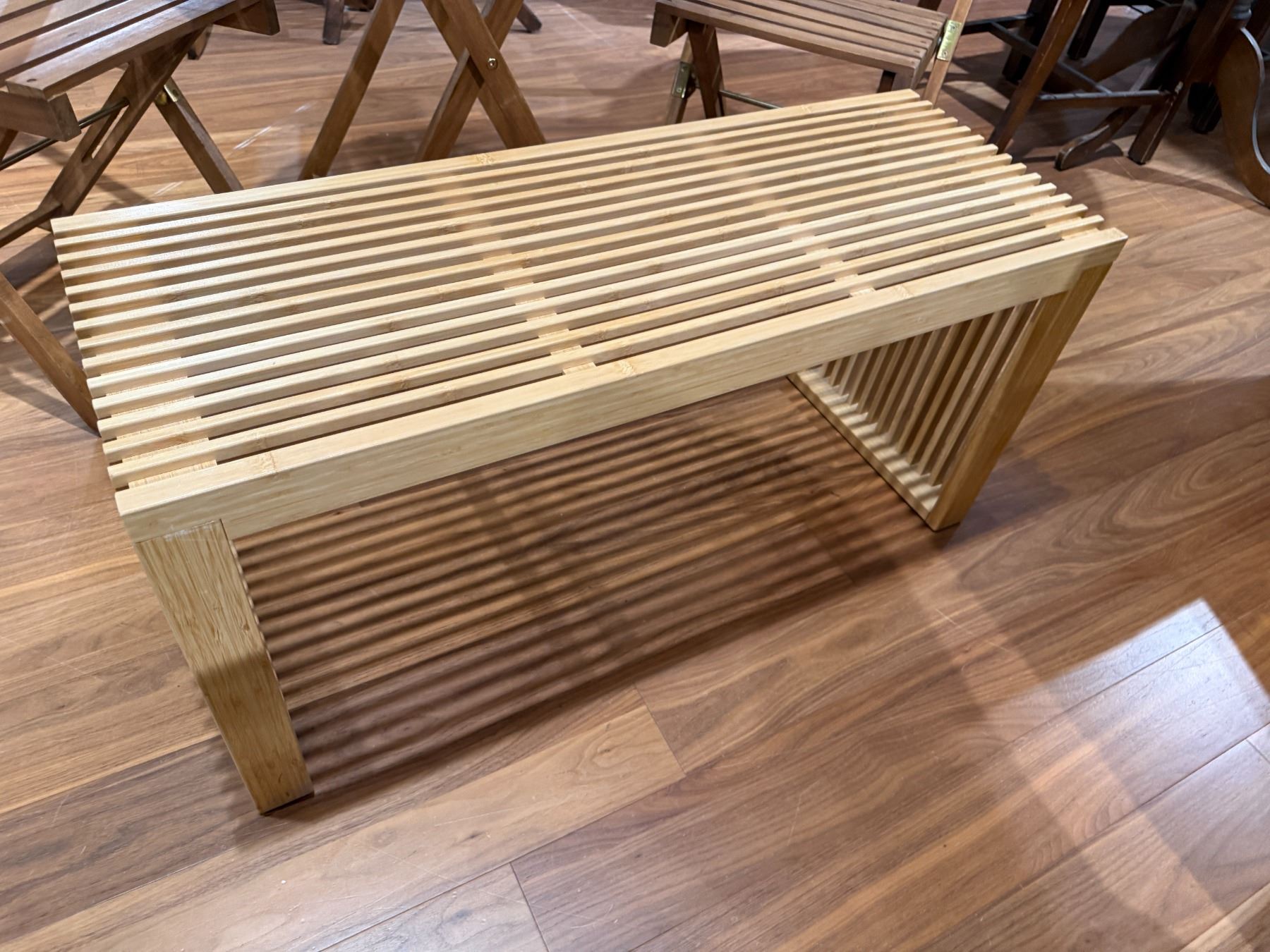 Set includes an outdoor teak table measuring 23x23x28-Inch with two matching chairs, and a modern slatted bamboo bench measuring 35.5x13x17-Inch. The teak table and chairs feature durable construction suitable for outdoor use, and the bamboo bench adds a contemporary touch. Items are as pictured.