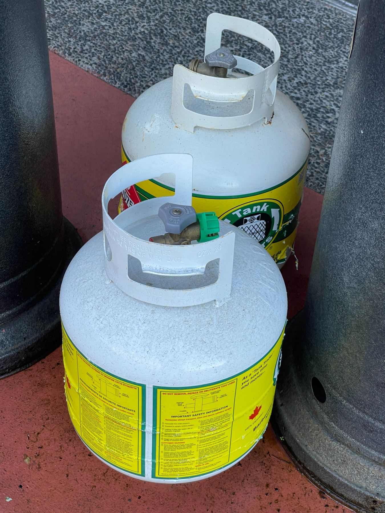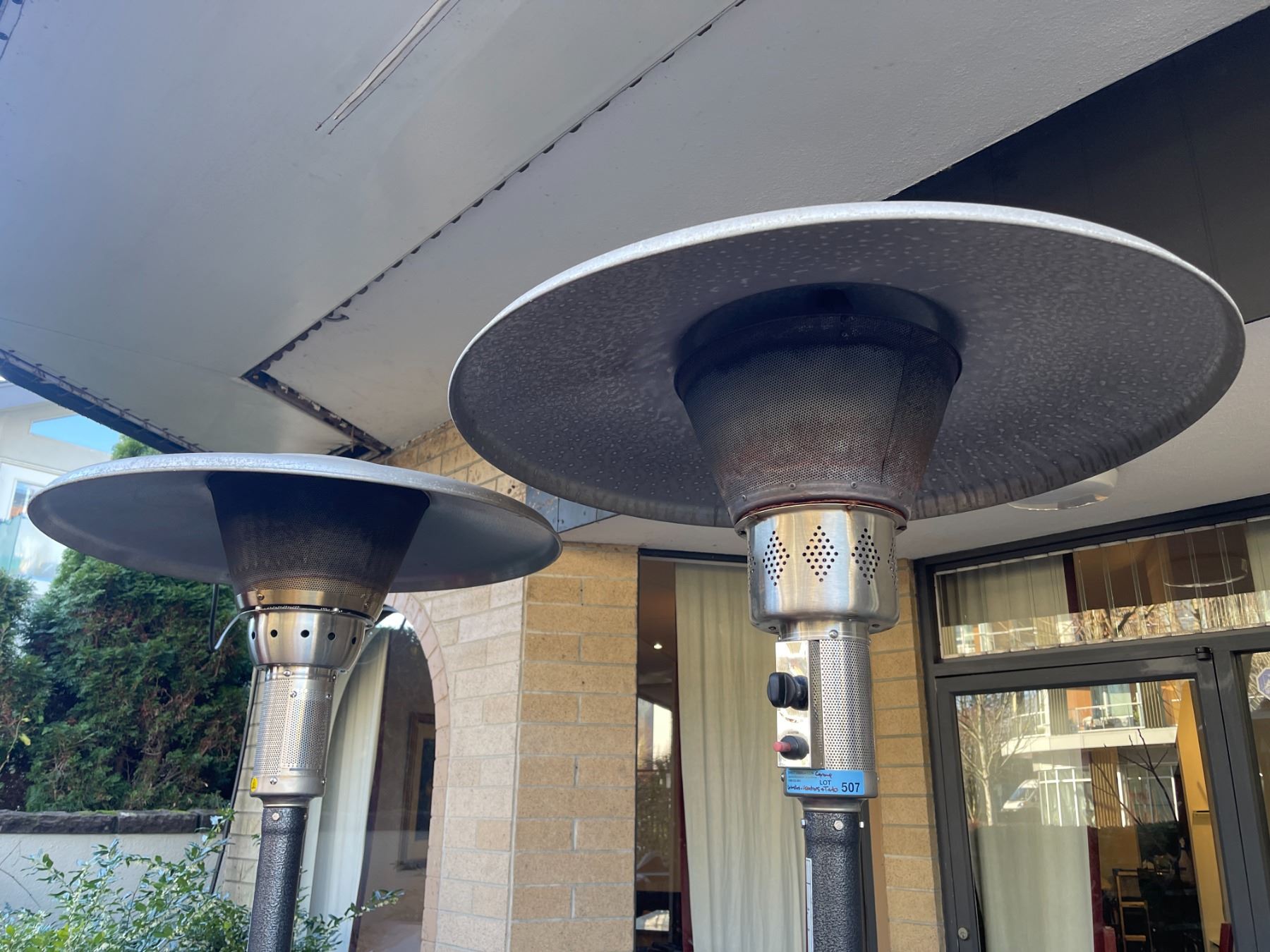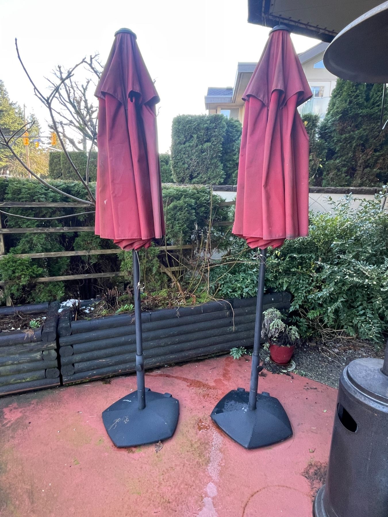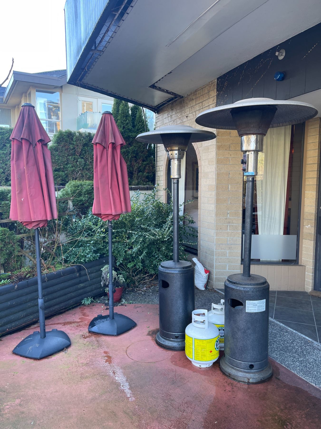 Outdoor gas heaters (x2) w/ propane tanks & extra tanks & (x2) Outdoor umbrellas - Tested & working