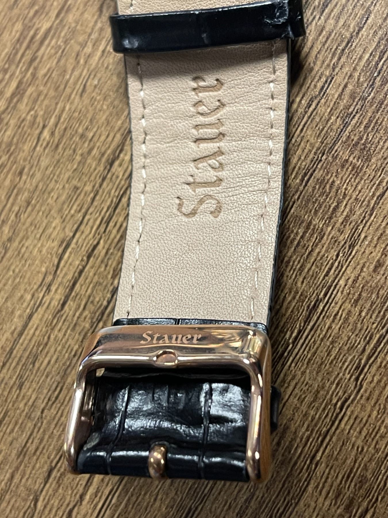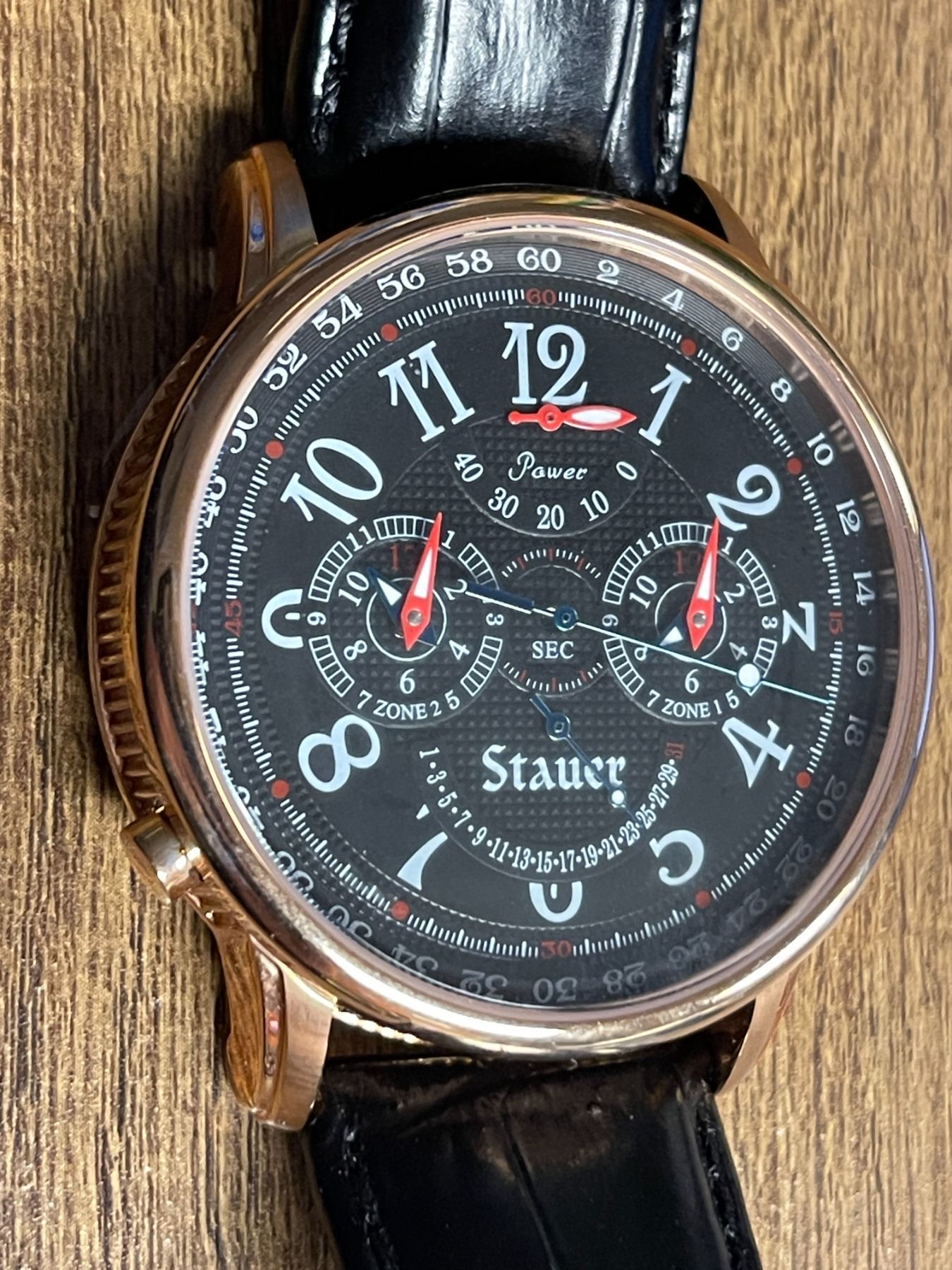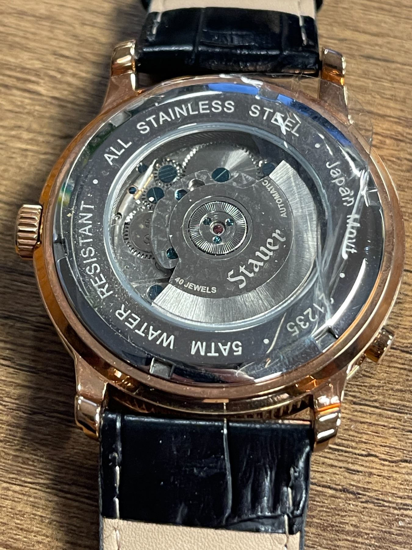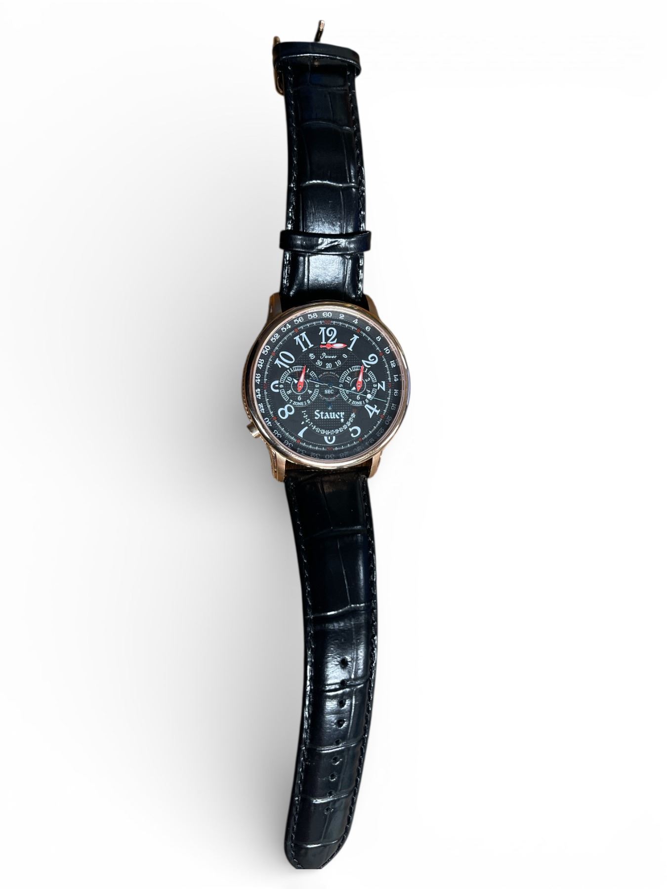 Oversize rose gold-plated stainless steel Stauer automatic watch with 40 jewels, black dial with 4 sub dials, Japanese movement on a black leather strap with a rose gold-plated tang buckle. - Appraised Value $125