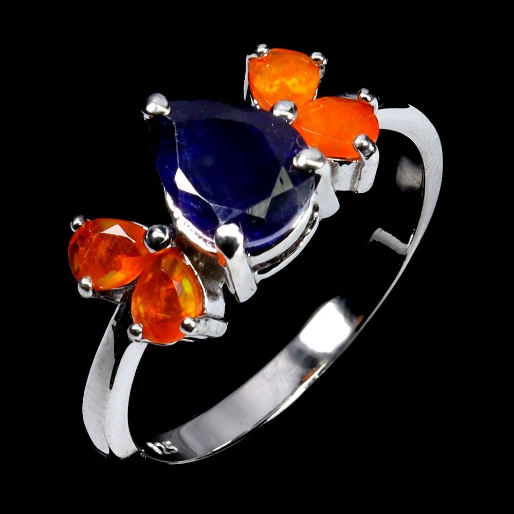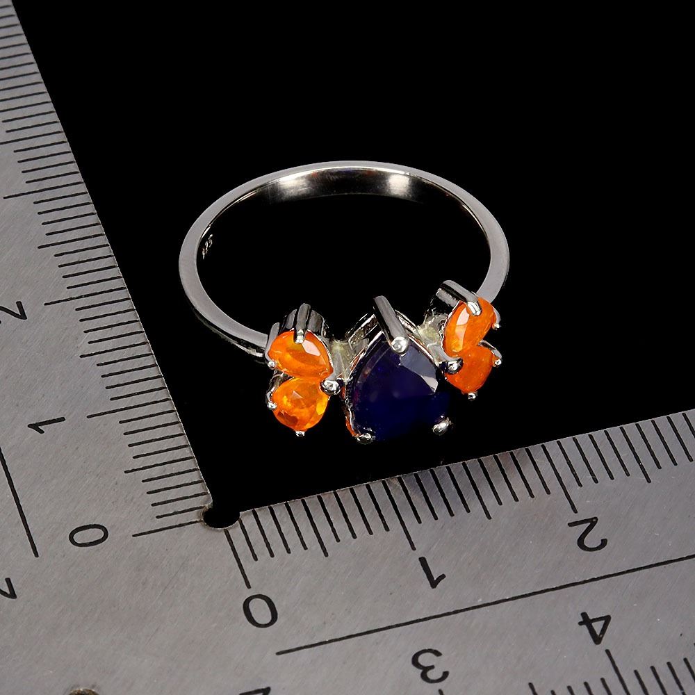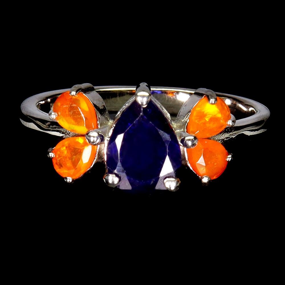 PEAR CUT 8X6 DARK BLUE SAPPHIRE AND ORANGE OPAL RING IN 14K WHITE GOLD PLATED OVER 925 STERLING SILVER - SIZE 8 - APPRAISED REPLACEMENT VALUE CAD 710