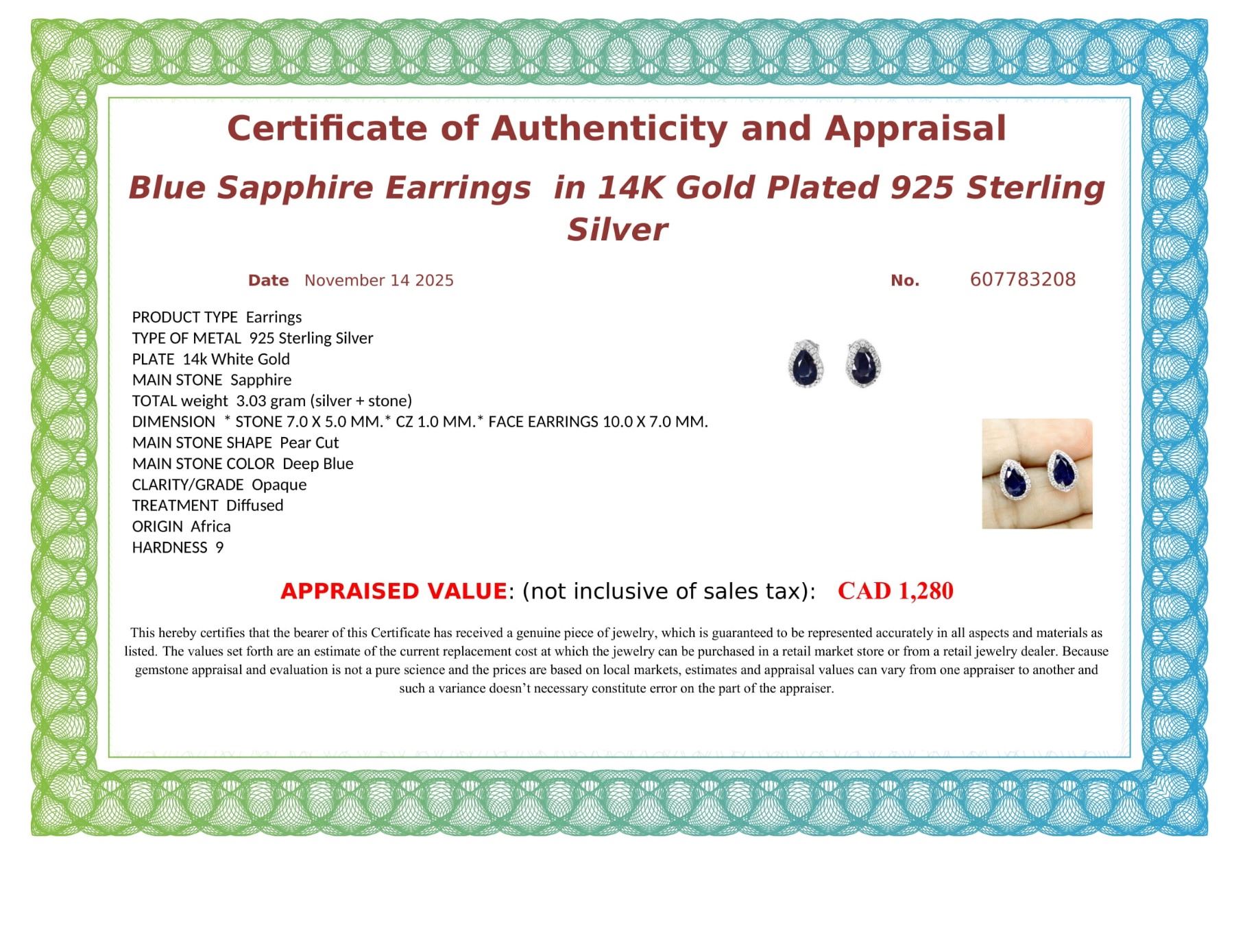 PEAR CUT BLUE SAPPHIRE EARRINGS IN 14K WHITE PLATED GOLD OVER 925 STERLING SILVER - APPRAISED REPLACEMENT VALUE $ 1,280
