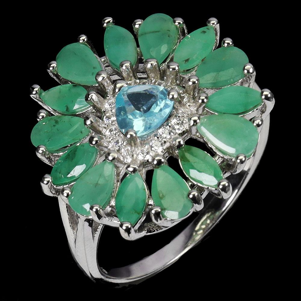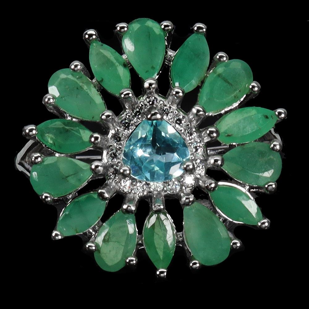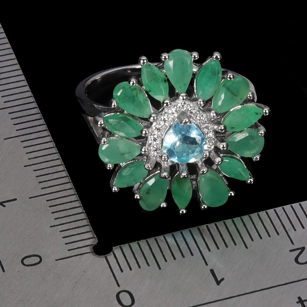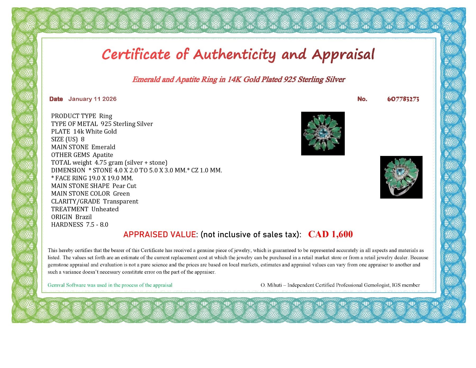 PEAR CUT EMEERALD AND APATITE RING IN 14K WHITE GOLD PLATED OVER 925 STERLING SILVER - SIZE 8 - APPRAISED REPLACEMENT VALUE CAD 1,600