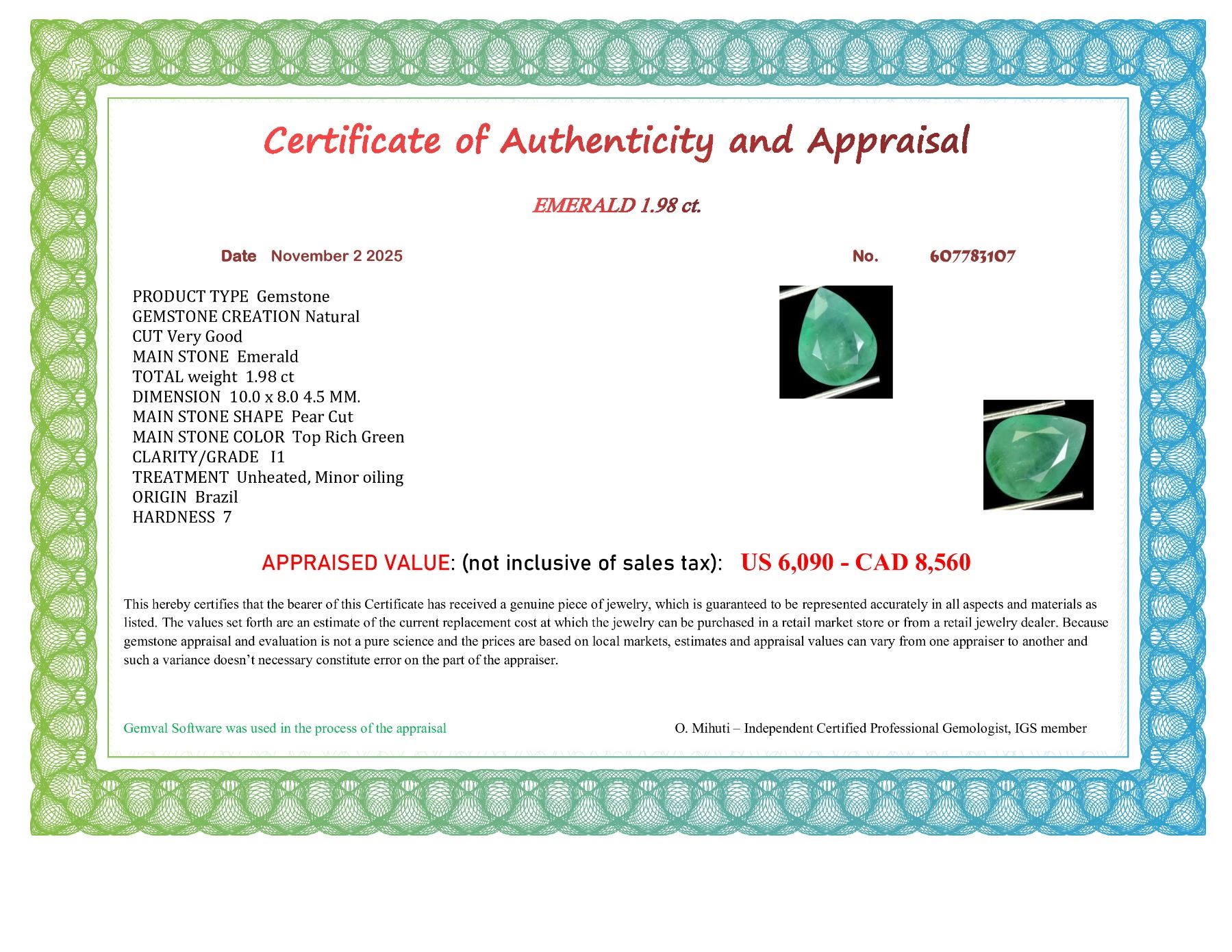 PEAR CUT UNTREATED EMERALD - Appraised Value - CAD 8,560