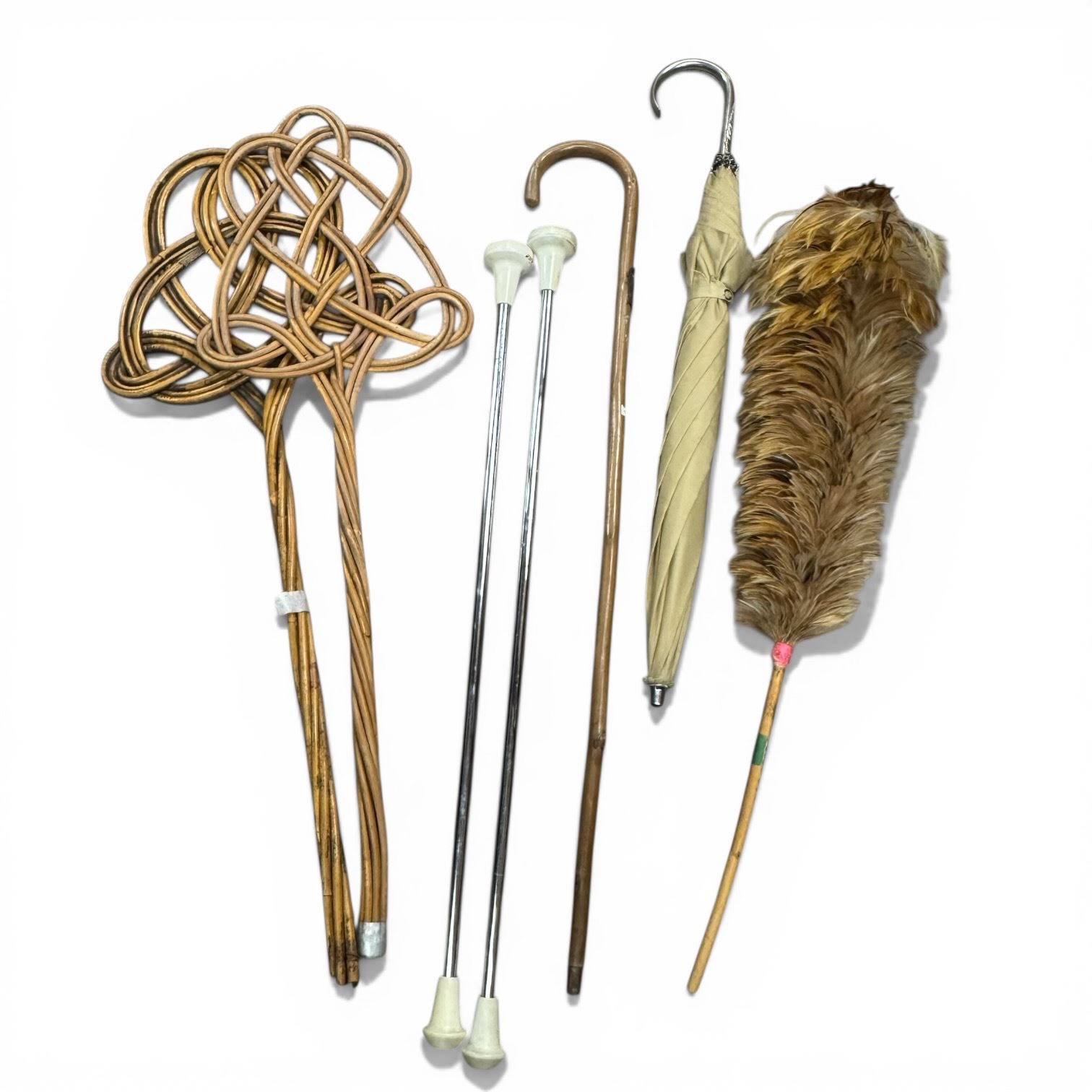Painted Wood Umbrella Stand with Contents (Batons, wicker rug beater, feather duster and more)