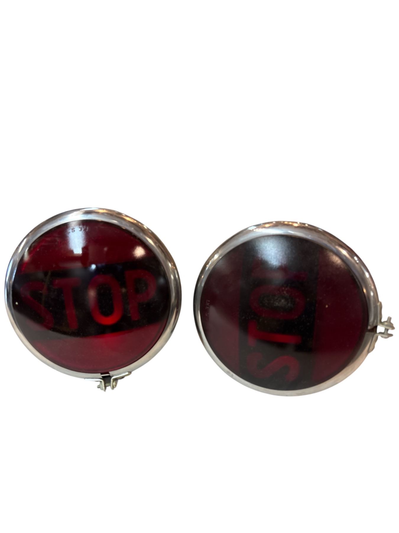 Pair of KD model 254VRS-12 jumbo stoplight red stop lenses with 7-Inch diameter. New old stock condition with original brackets included. Designed for automotive or industrial stoplight applications. Preserved as pictured, unused with no visible wear.