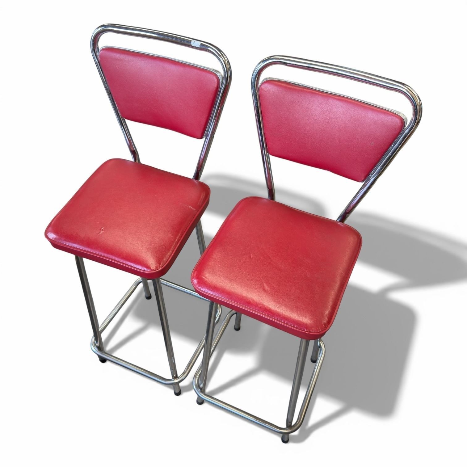 Pair of vintage mid-century bar stools featuring red vinyl upholstered seats and chrome frames. Each stool measures 38-Inch tall. Designed in a classic mid-century style, the stools showcase a combination of vibrant color and sleek chrome detailing. Item is as pictured.