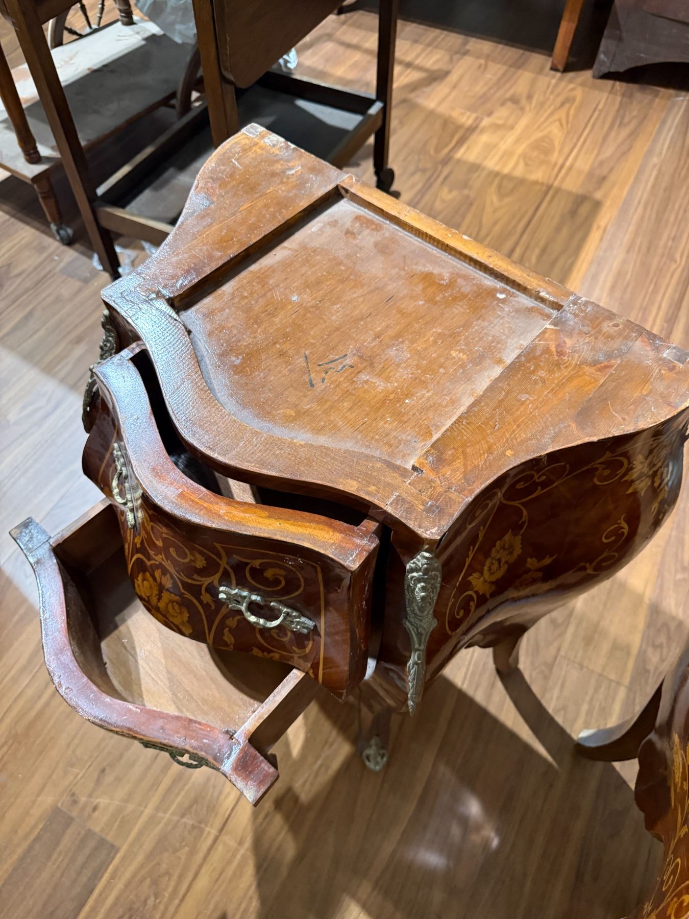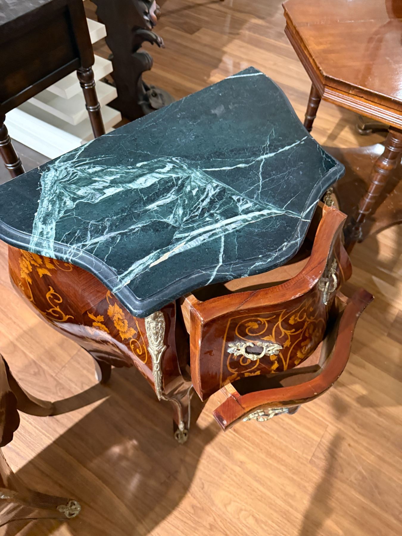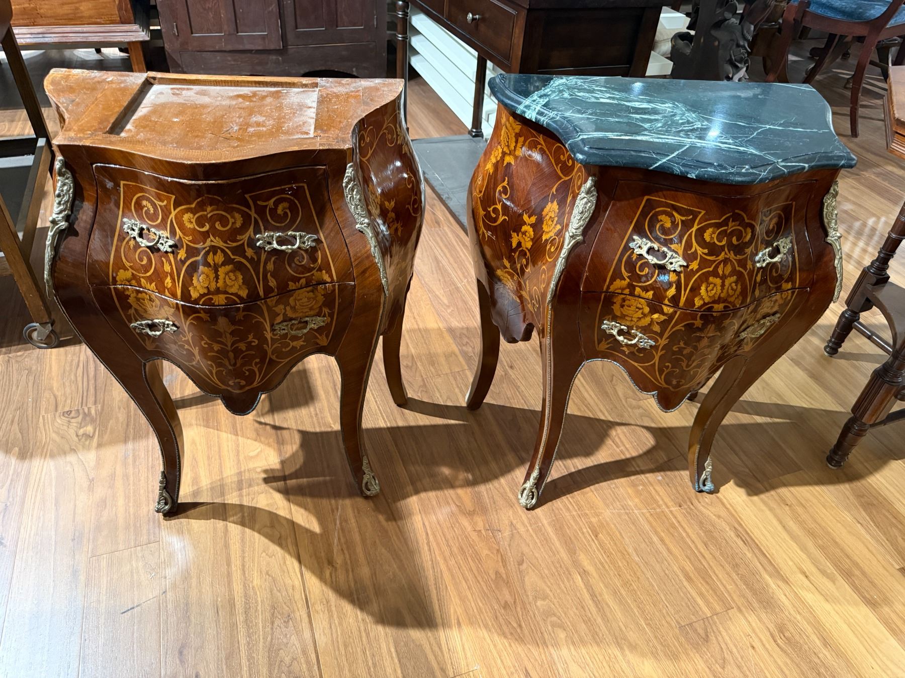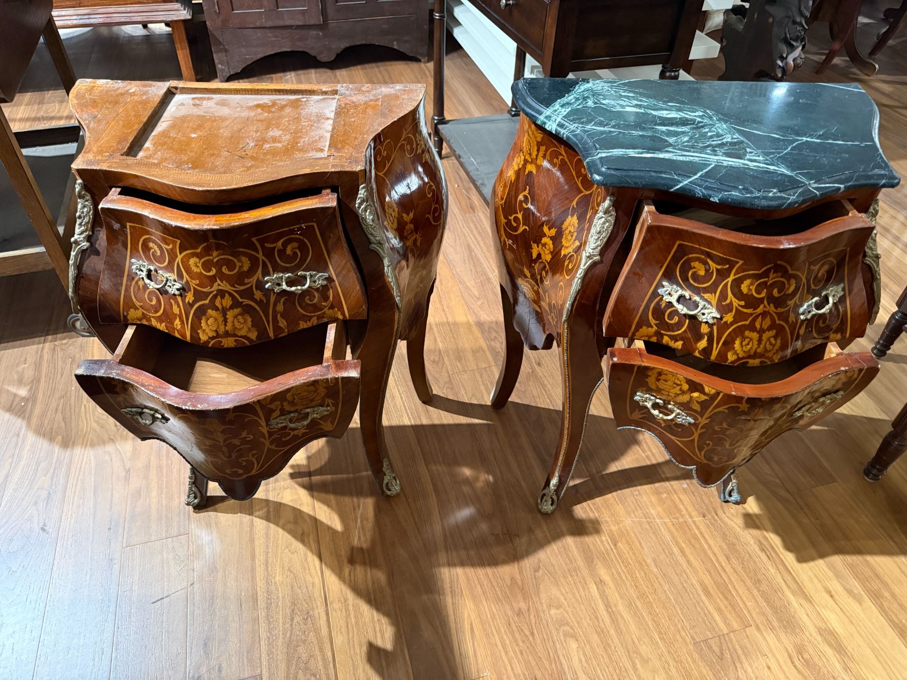 Pair of Baroque style bedside cabinets with dimensions of Length: 22.5 In, Width: 15 In, Height: 28.5 In. One cabinet retains its marble top, while the other is missing the marble top. Both feature ornamented design details consistent with the Baroque style. Item is as pictured.