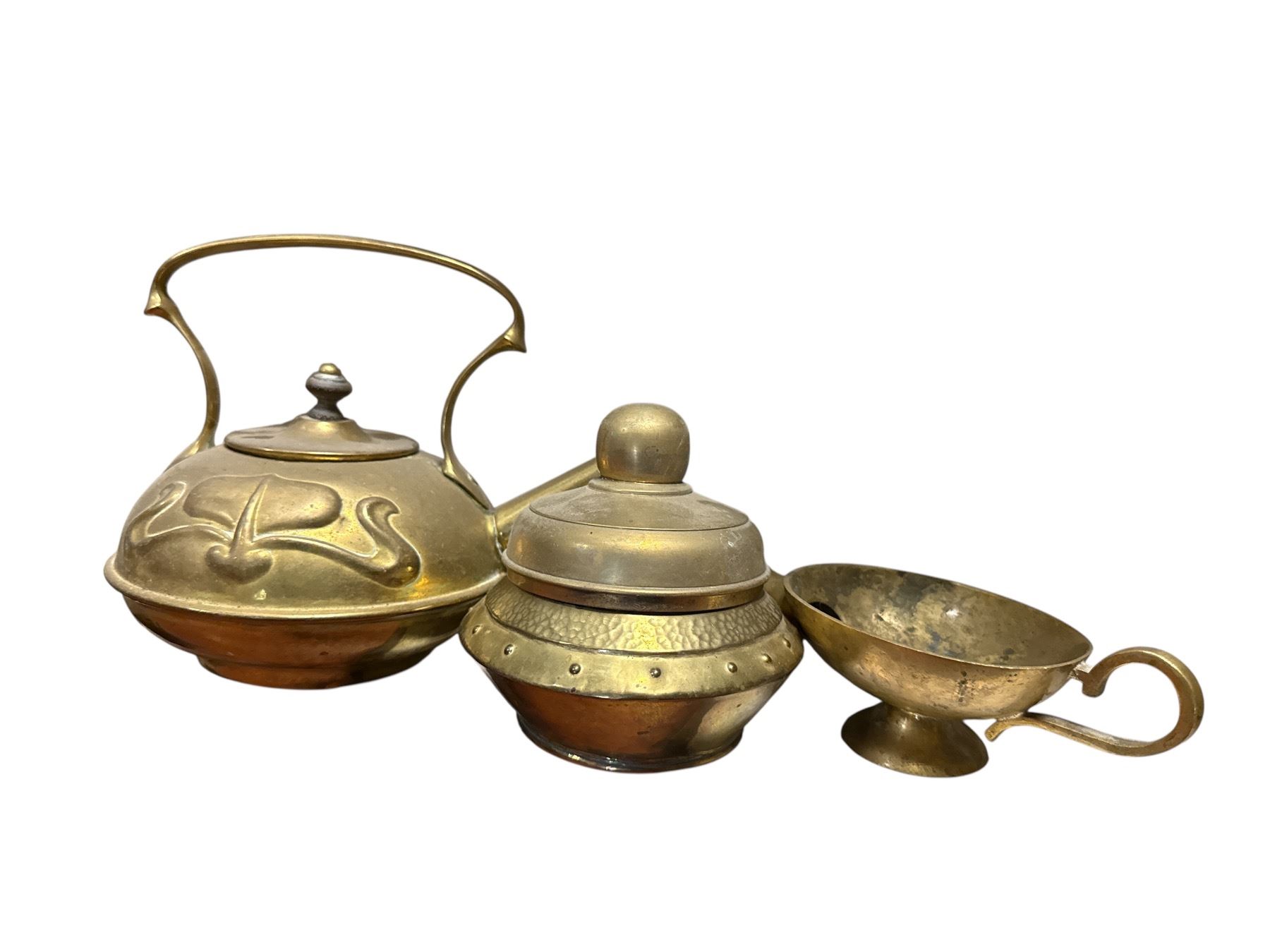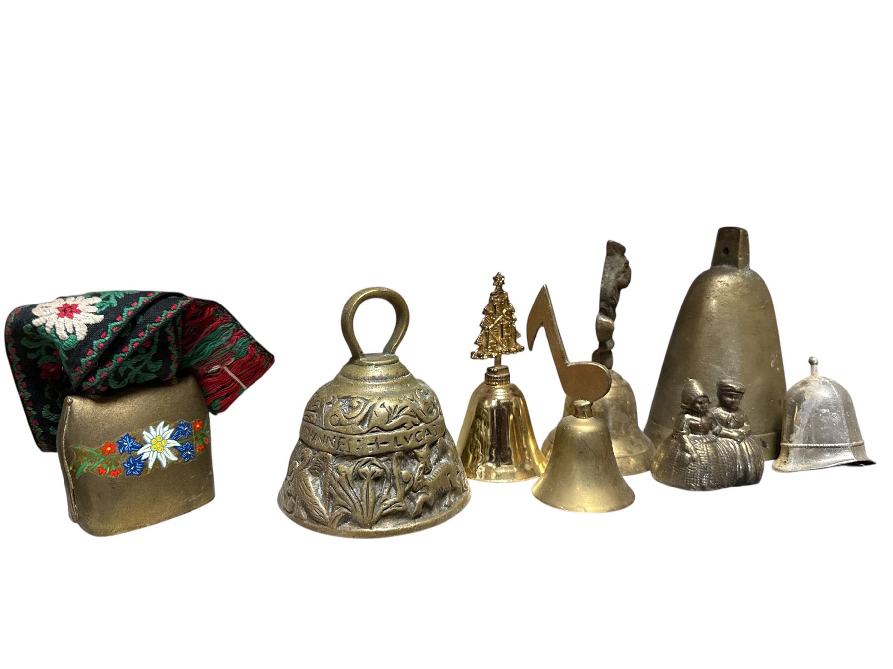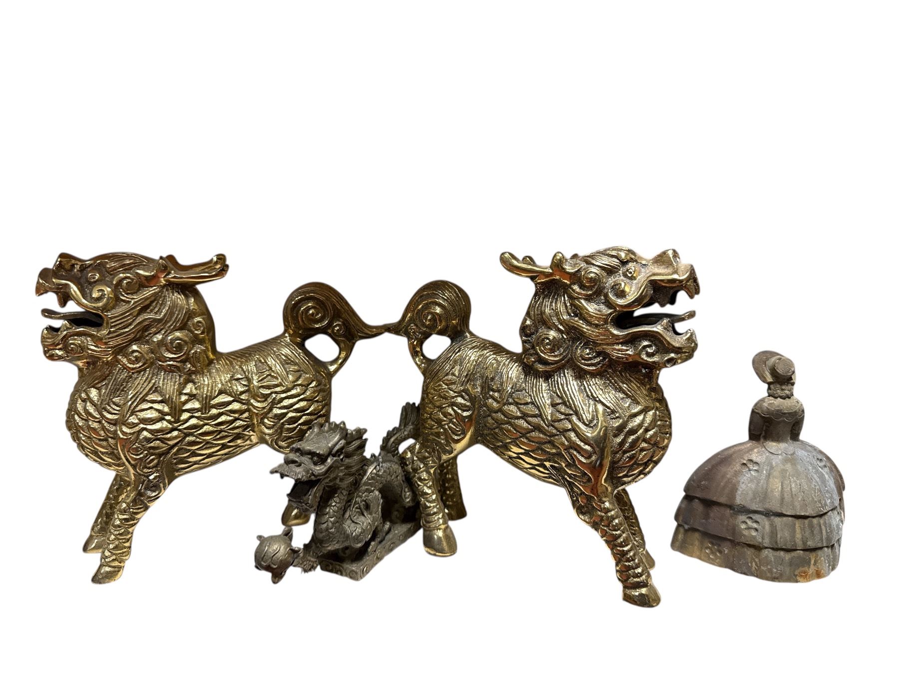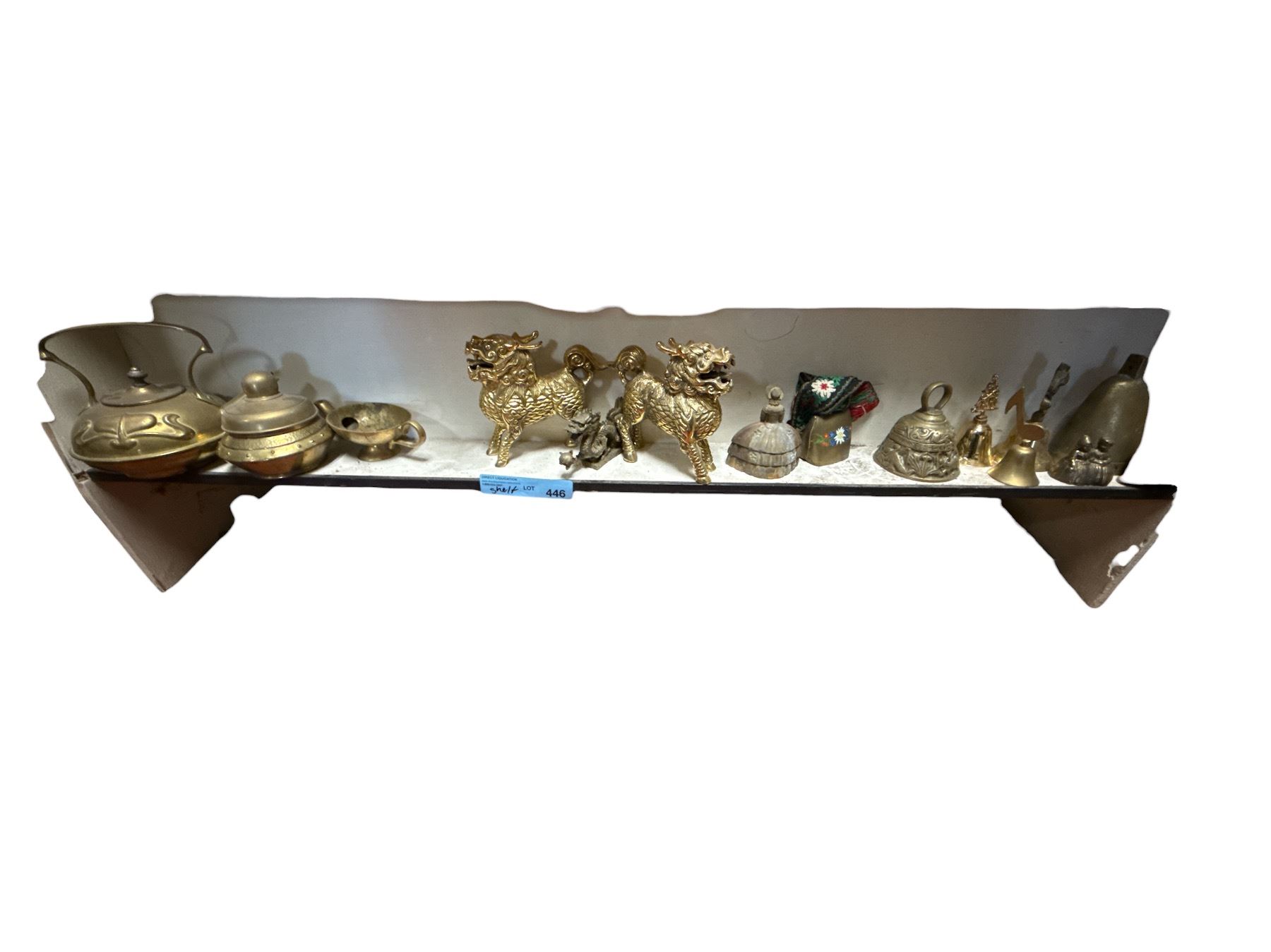 Pair of Brass Foo Dogs with Assorted Vintage Bells & Small Metalware Items