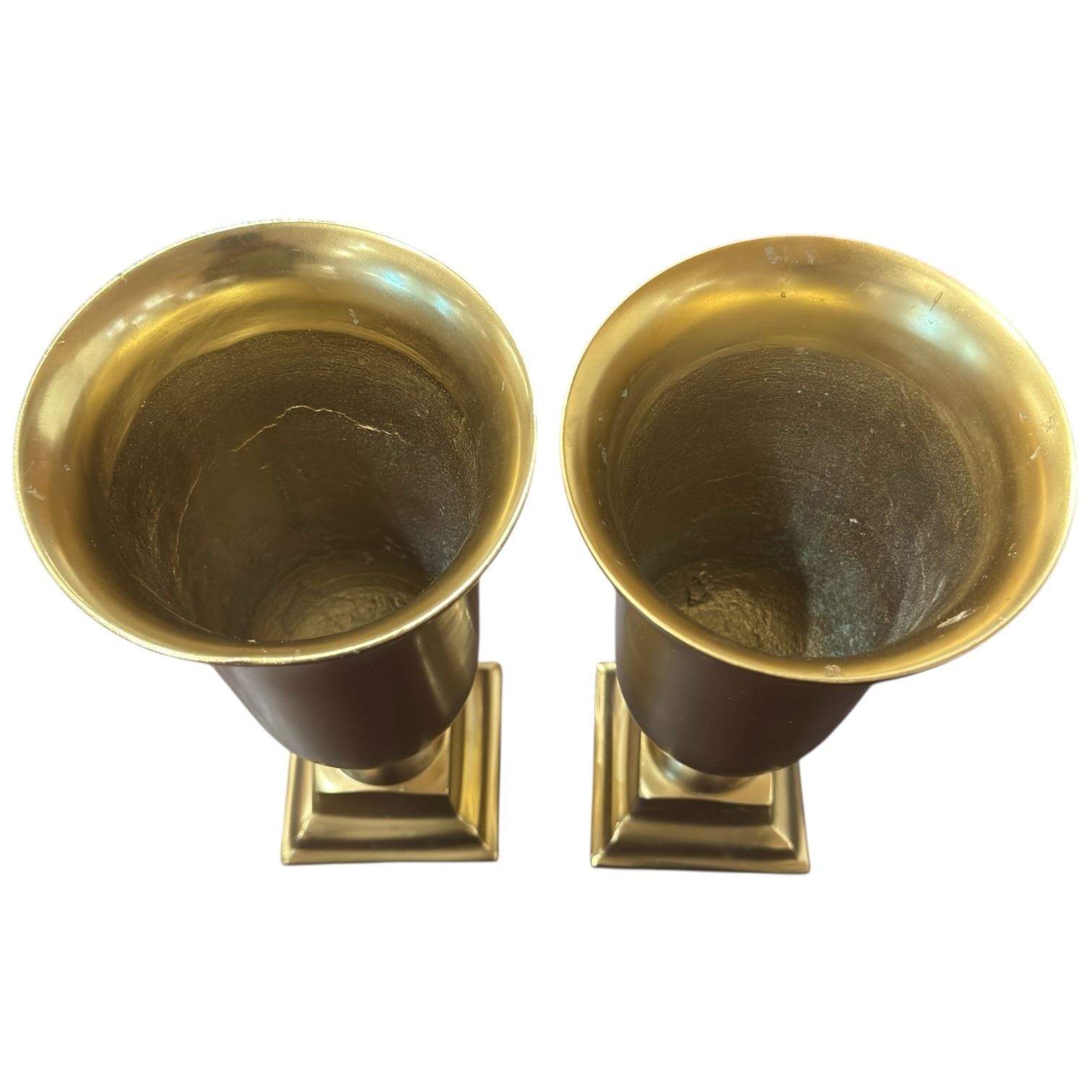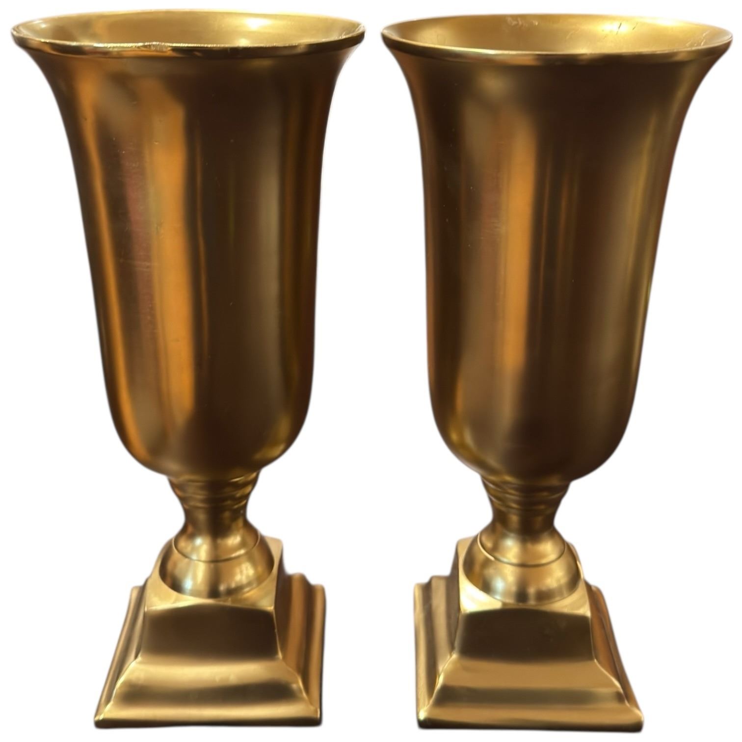 Pair of vases in a brass tone finish made from cast metal material. Each vase measures 11-Inch tall. Item is as pictured.