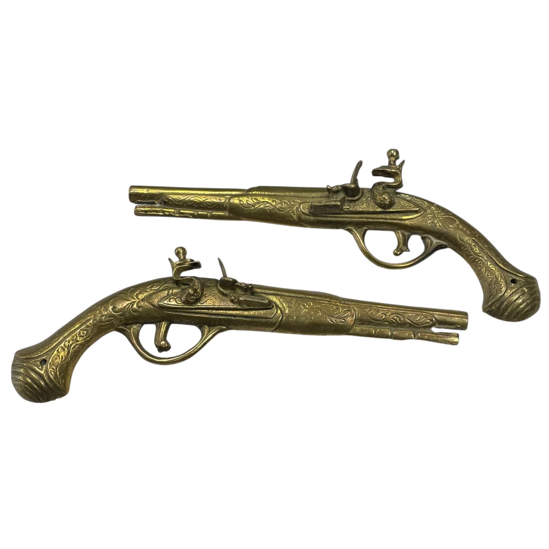 Pair of decorative brass wall-hanging black powder pistols measuring 13-Inch long. These vintage-style pieces feature intricate detailing and are designed to resemble historic black powder pistols. They are intended for display purposes and come as pictured.