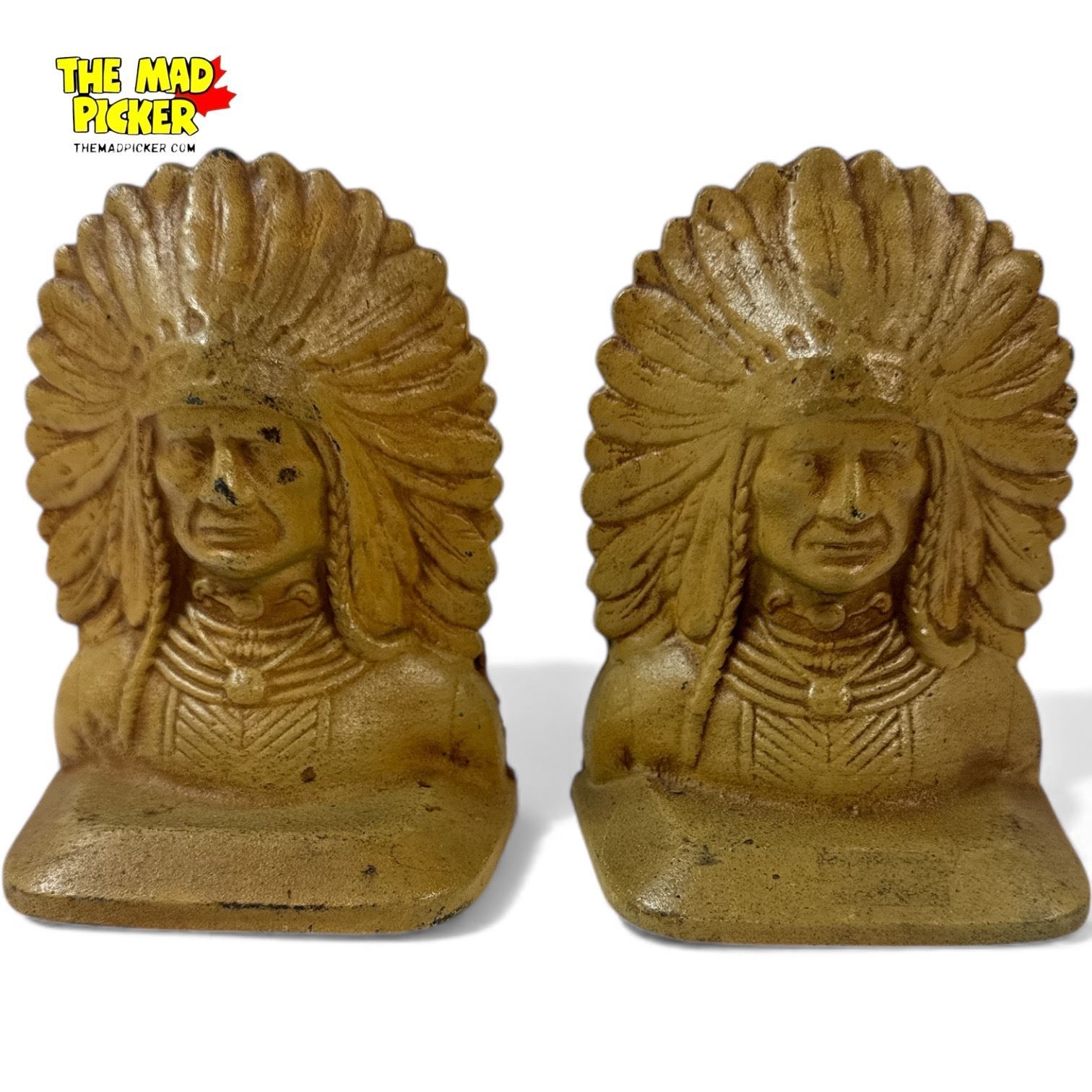 Pair of Cast Iron Native American Indian Chief Bookends 6" Tall Stamped 802 Early - Mid 20th Century