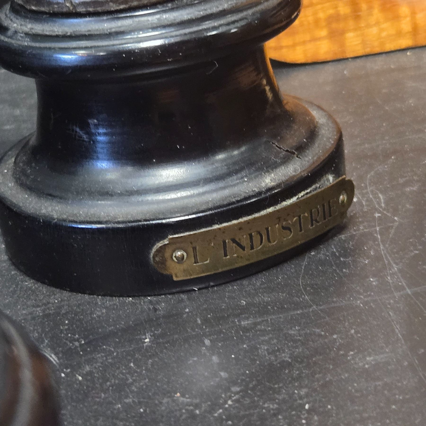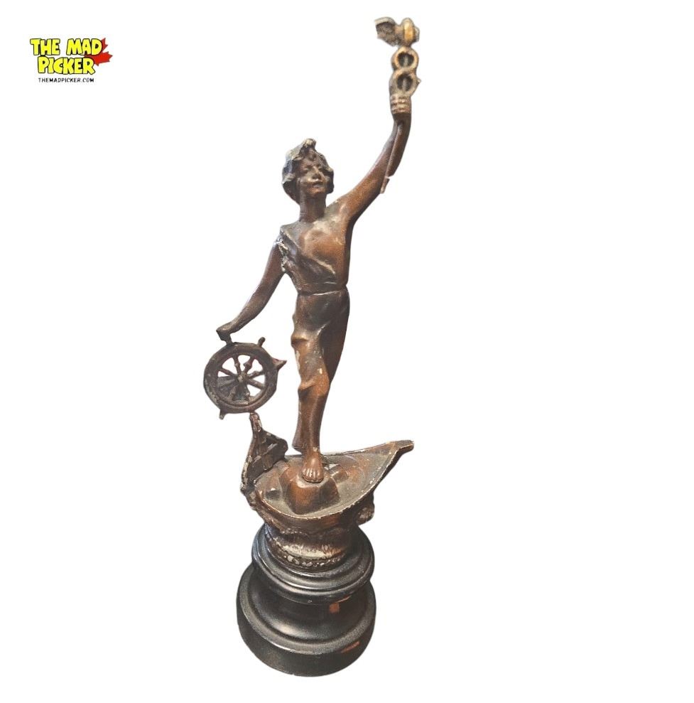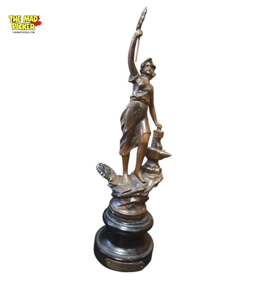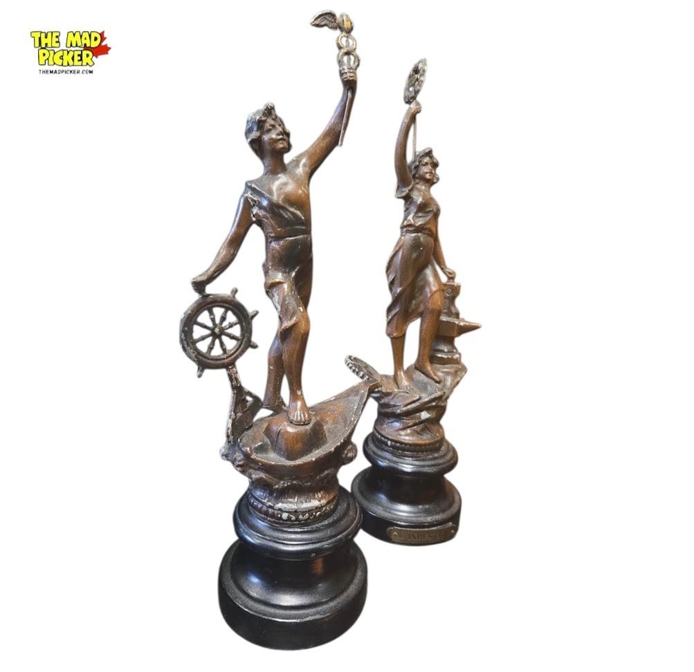 Pair of 19th-century cast metal statues titled 'Le Commerce' and 'Industrie,' each measuring 13 inches in height. Depicting allegorical figures representing commerce and industry. Demonstrates wear consistent with age, adding to their historical character. Intricately detailed castings with a classic antique finish.