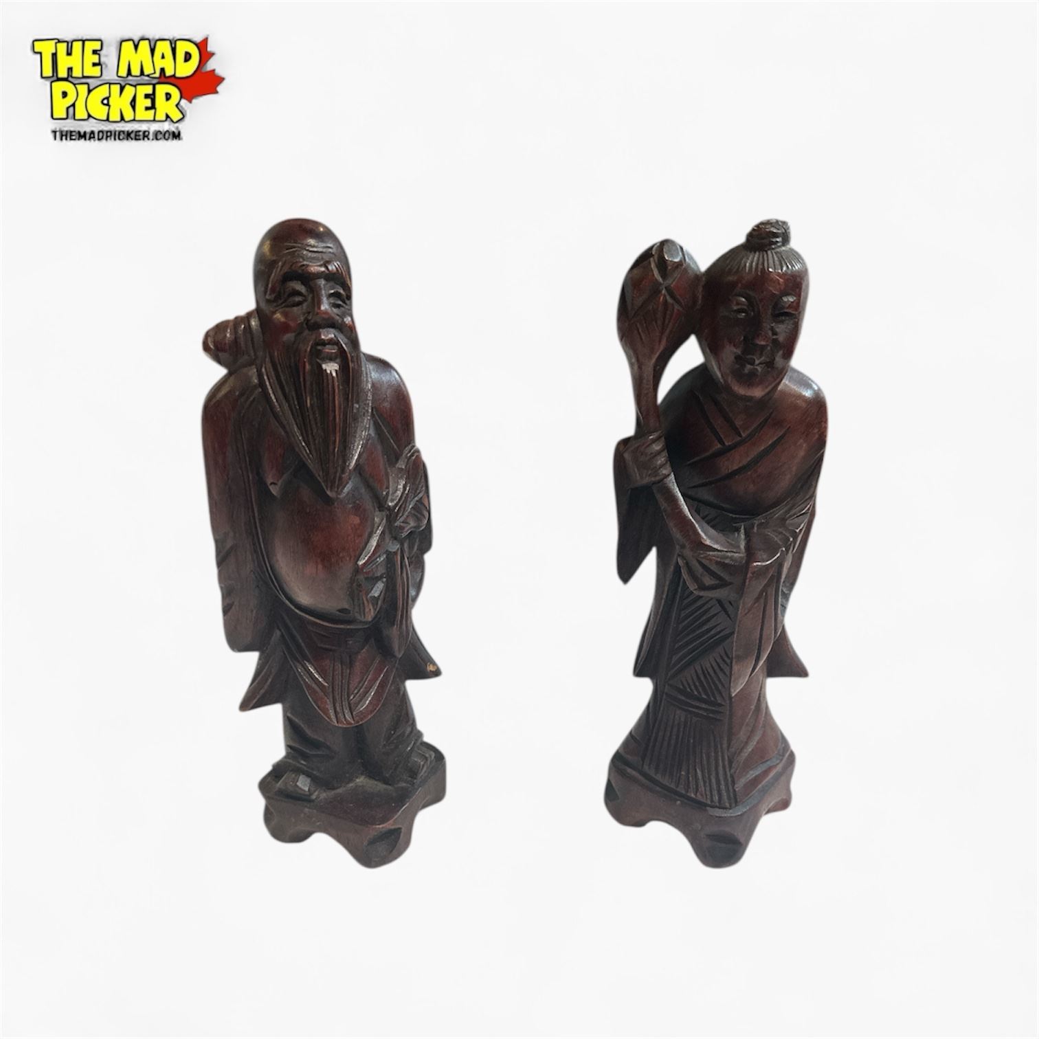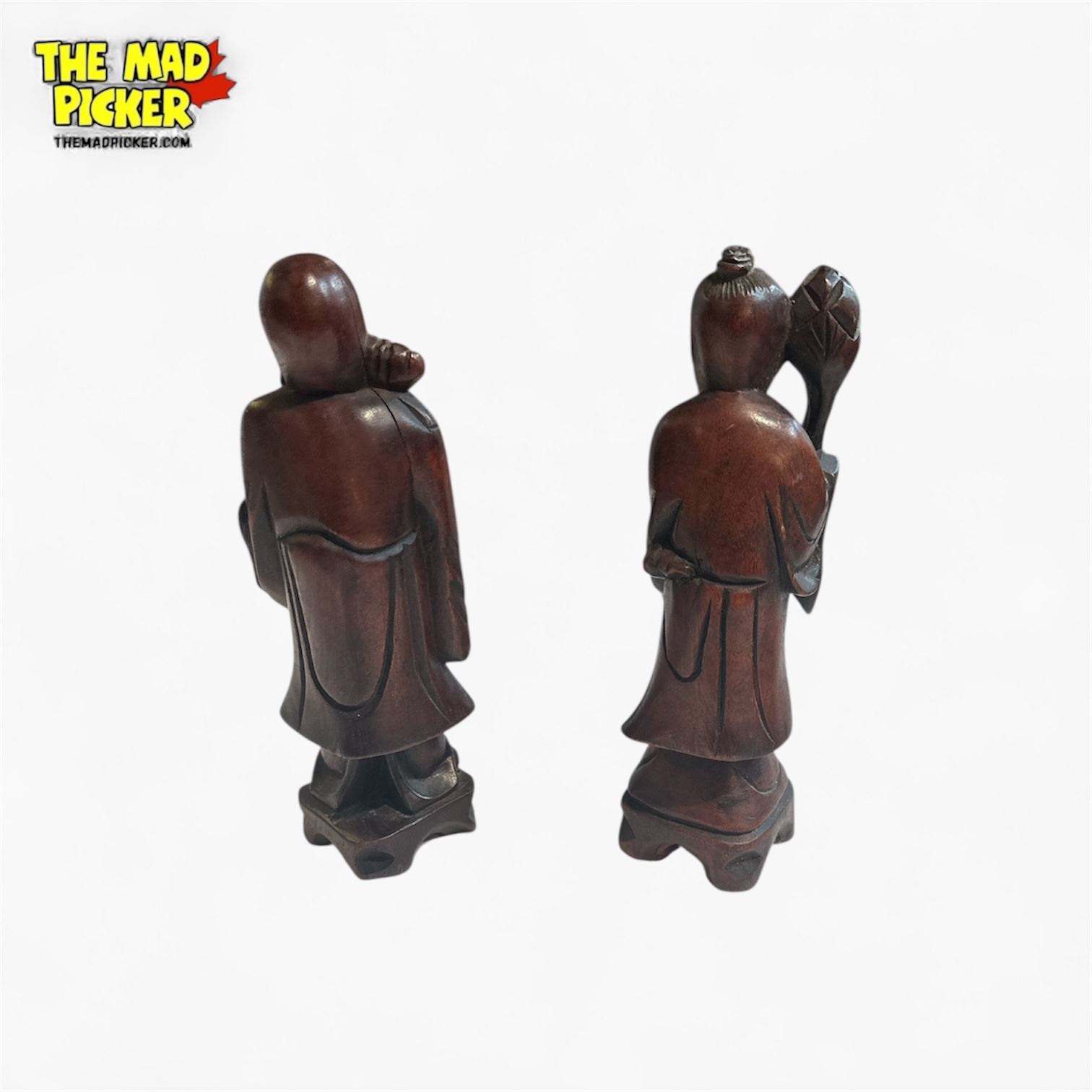 Set of two Chinese hand-carved wooden sculptures, showcasing traditional craftsmanship. Each piece exhibits intricate detailing, likely representing cultural or symbolic motifs. Origin and specific age not confirmed. Medium to dark wood tones with smooth finish. No additional markings visible.