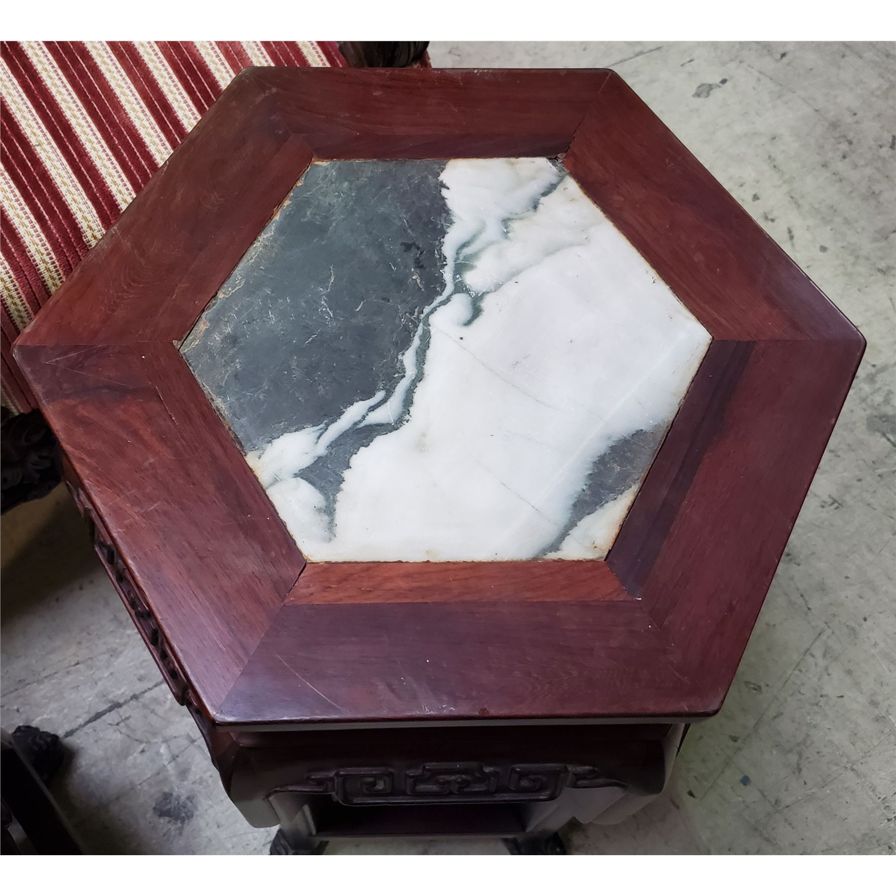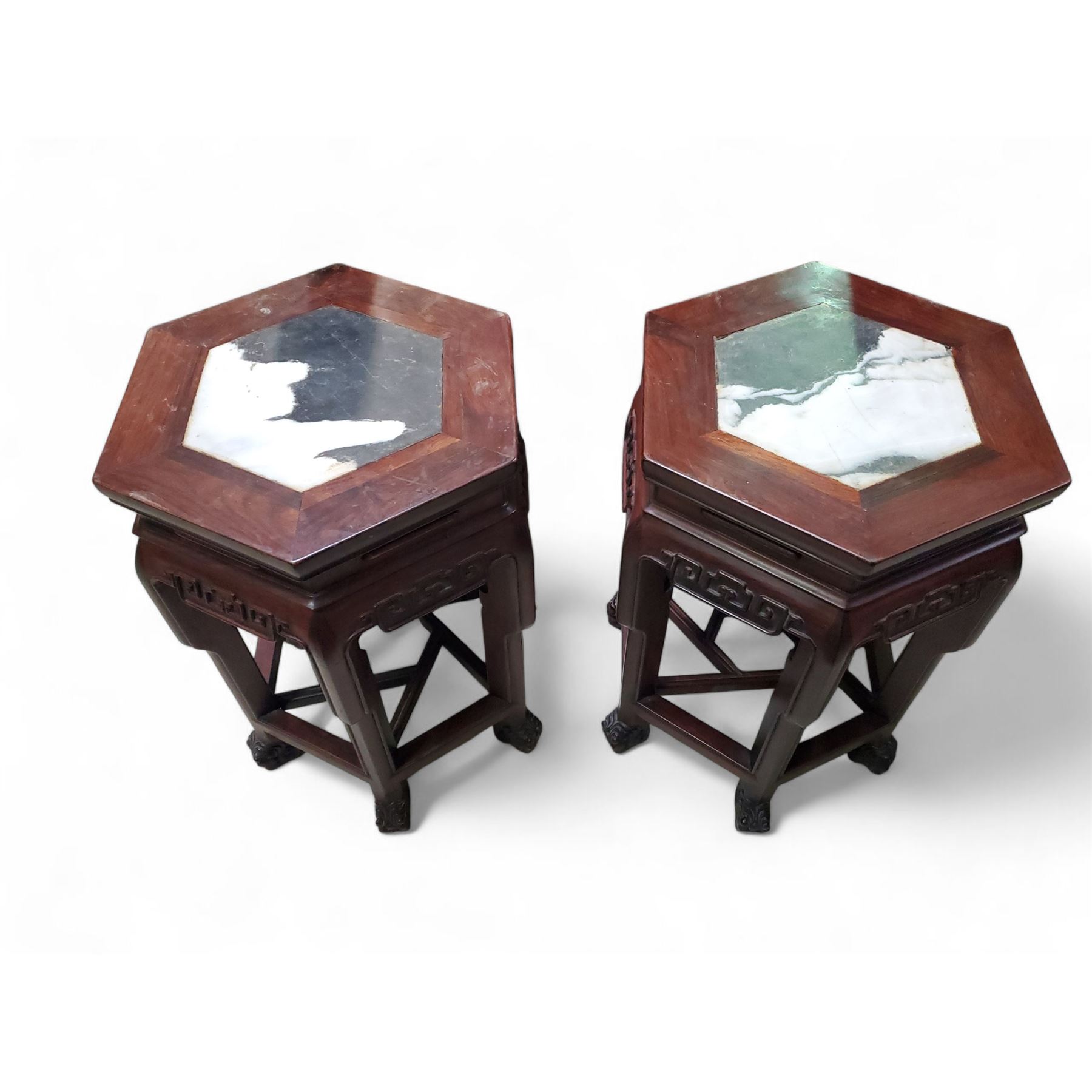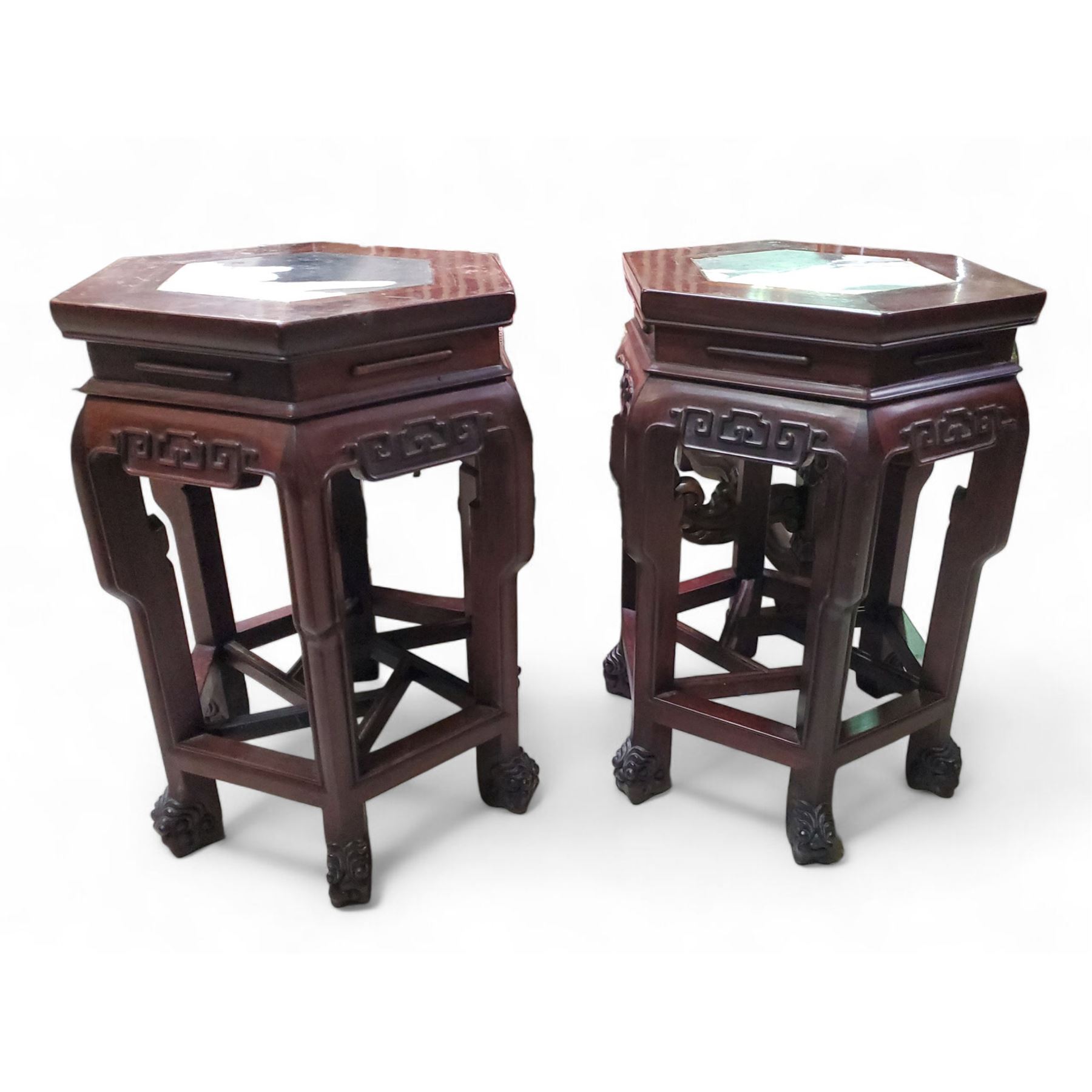 Pair of Chinese Hexagonal Hardwood Marble-Top Side Tables - Approx. H19.5" x W13" x 14.5" Each