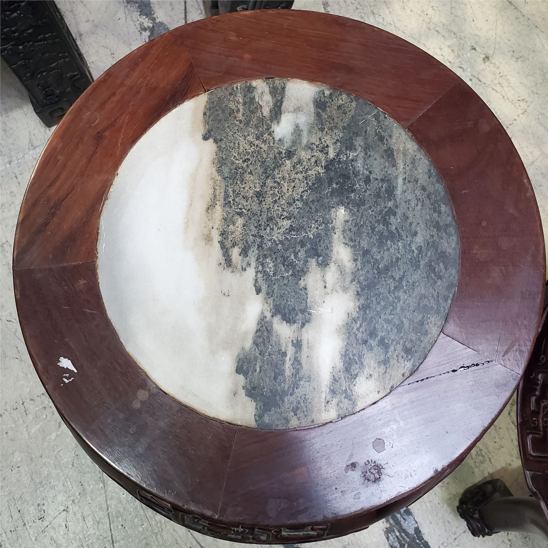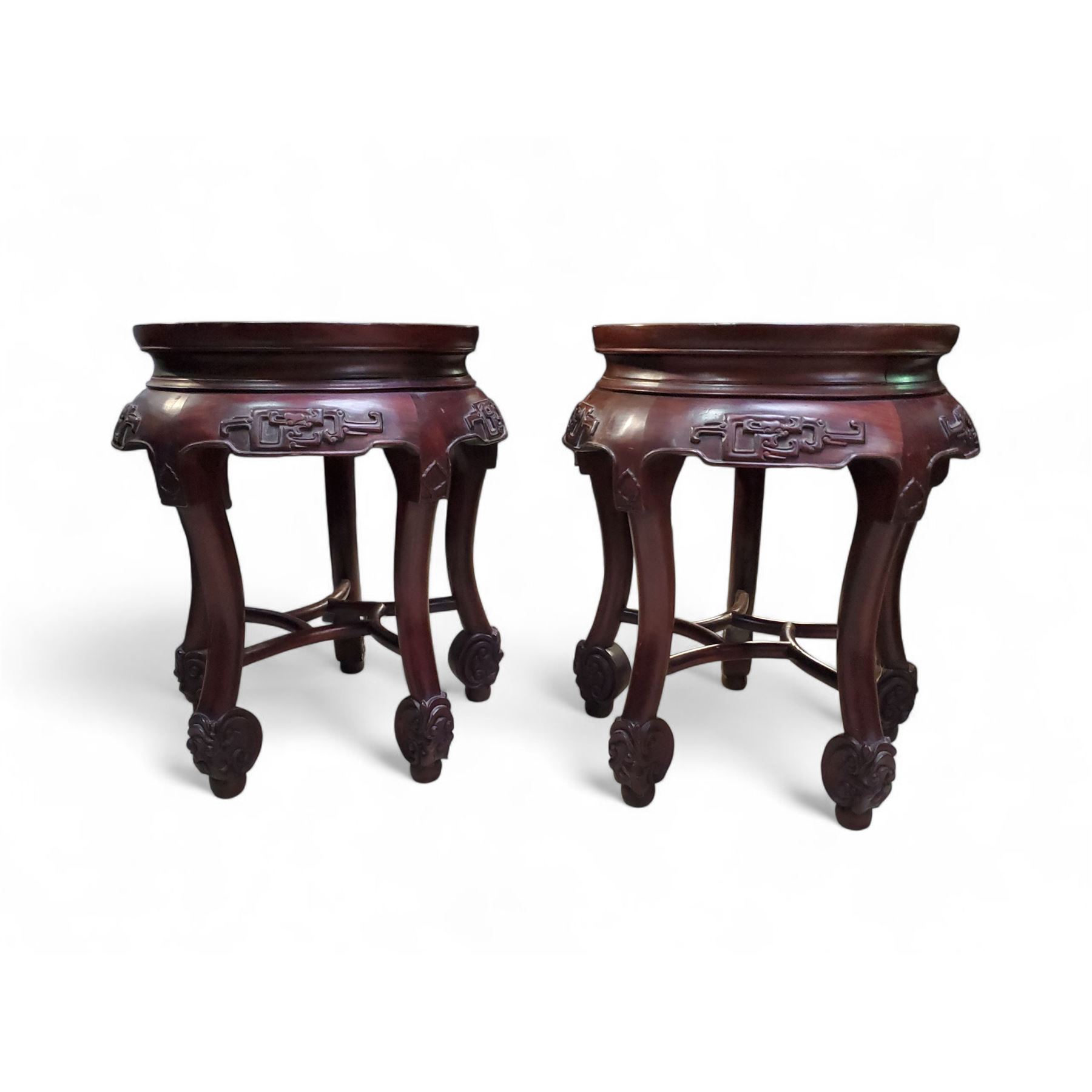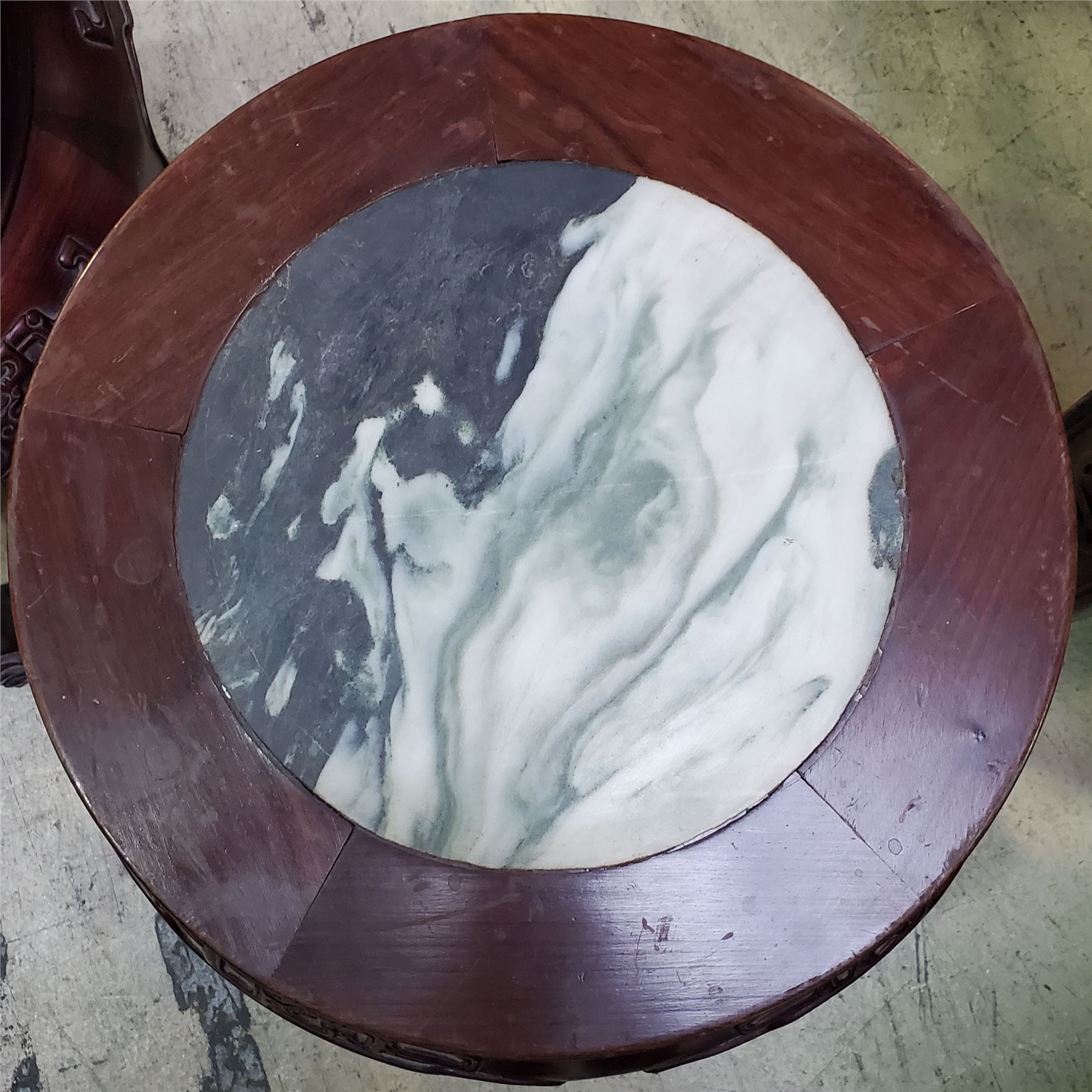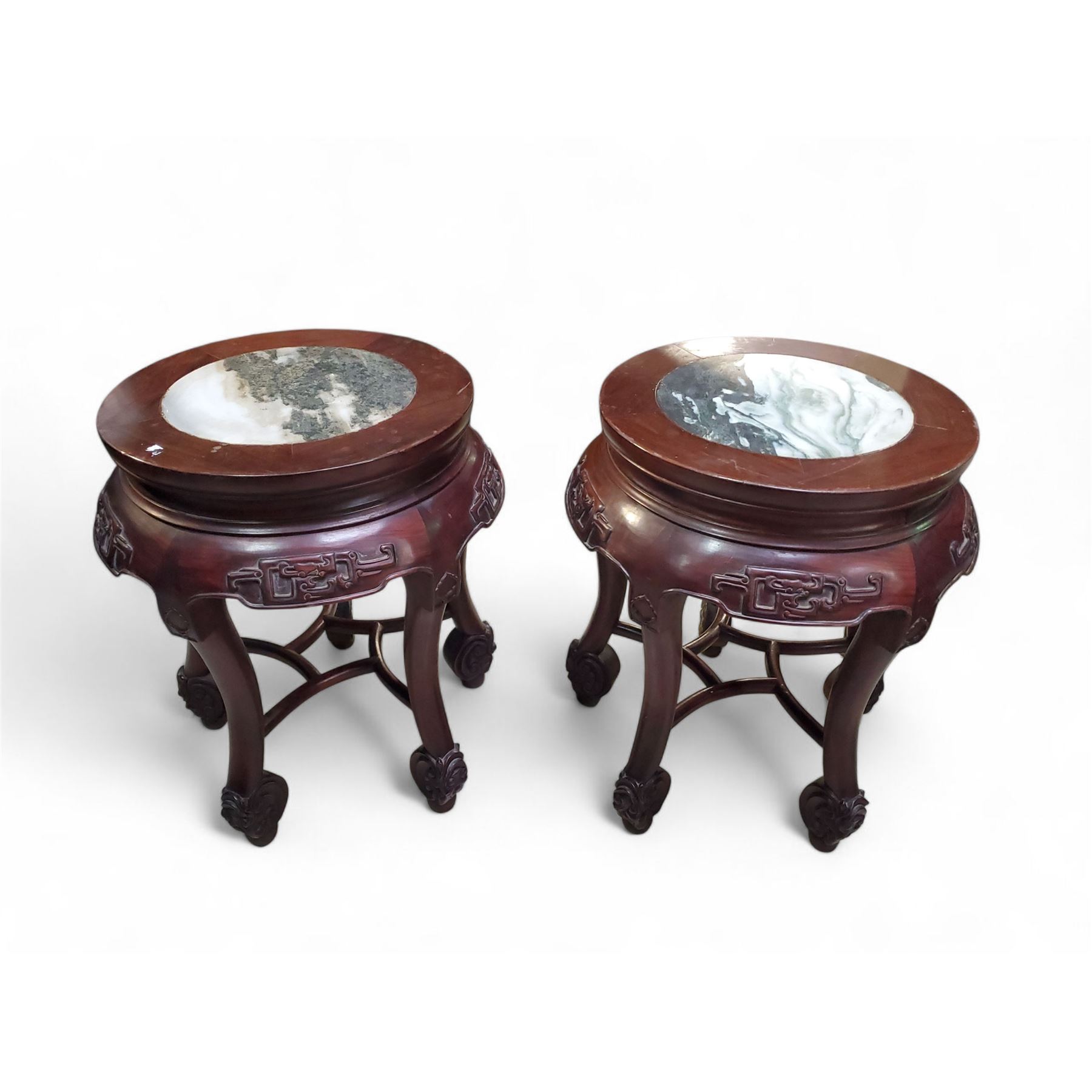 Pair of Chinese Round Hardwood Marble-Top Stands - Approx. H20" x Dia. 16" Each