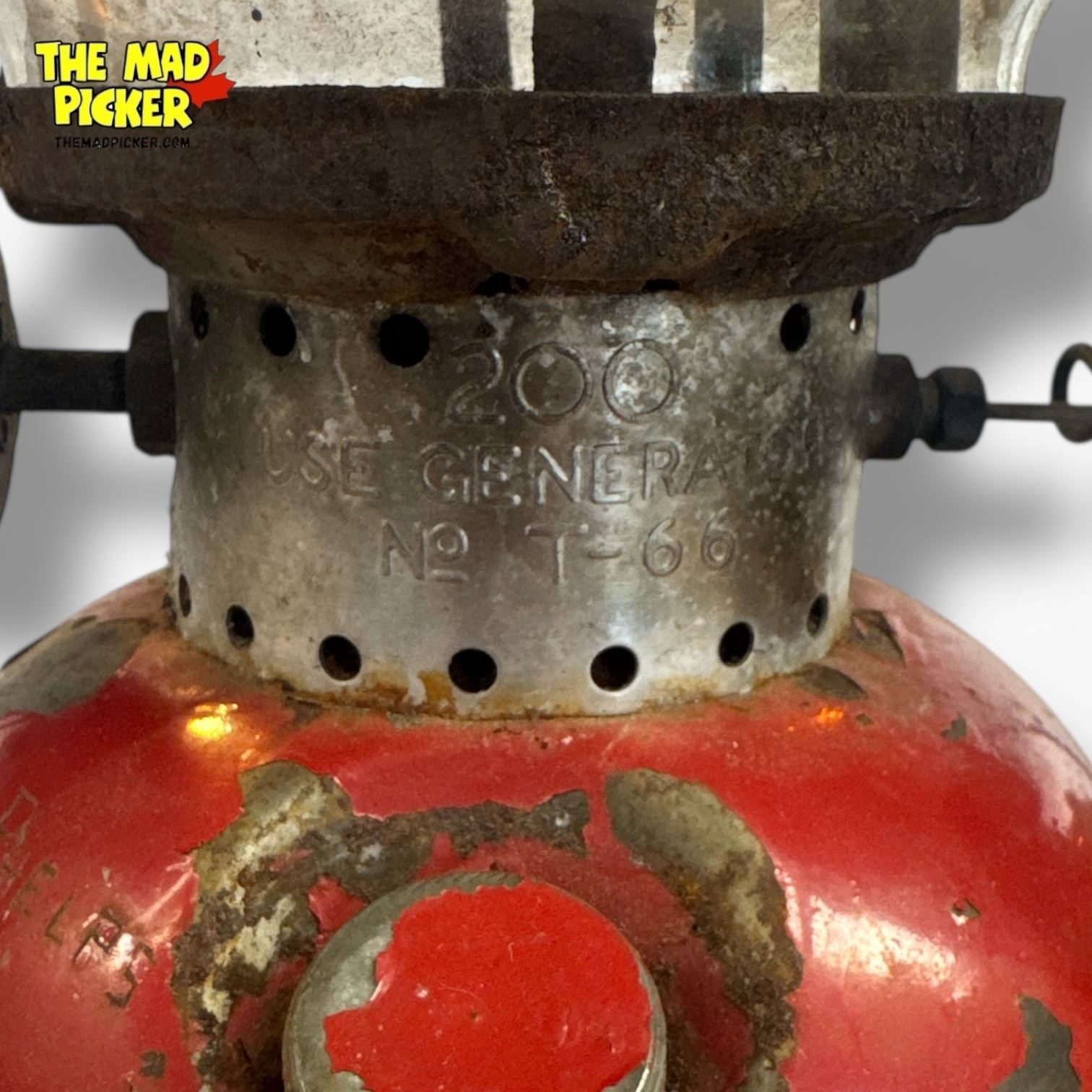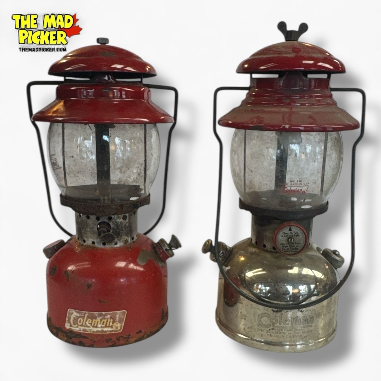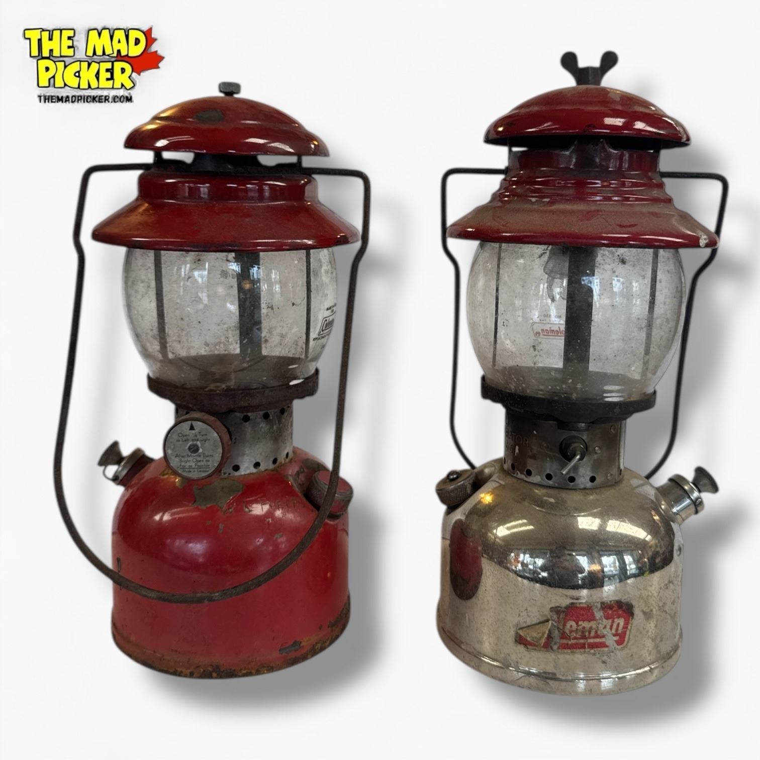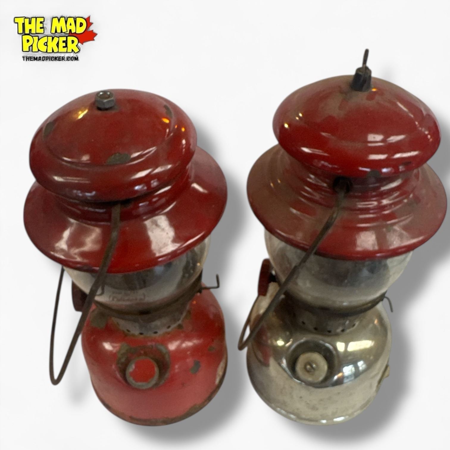 Pair of Coleman Model 200 lanterns, manufactured in 1957. Features one with a red top and one with nickel finish. Single-mantle design, kerosene-powered with adjustable brightness. Classic mid-century camping lanterns highly regarded for durability and functionality.