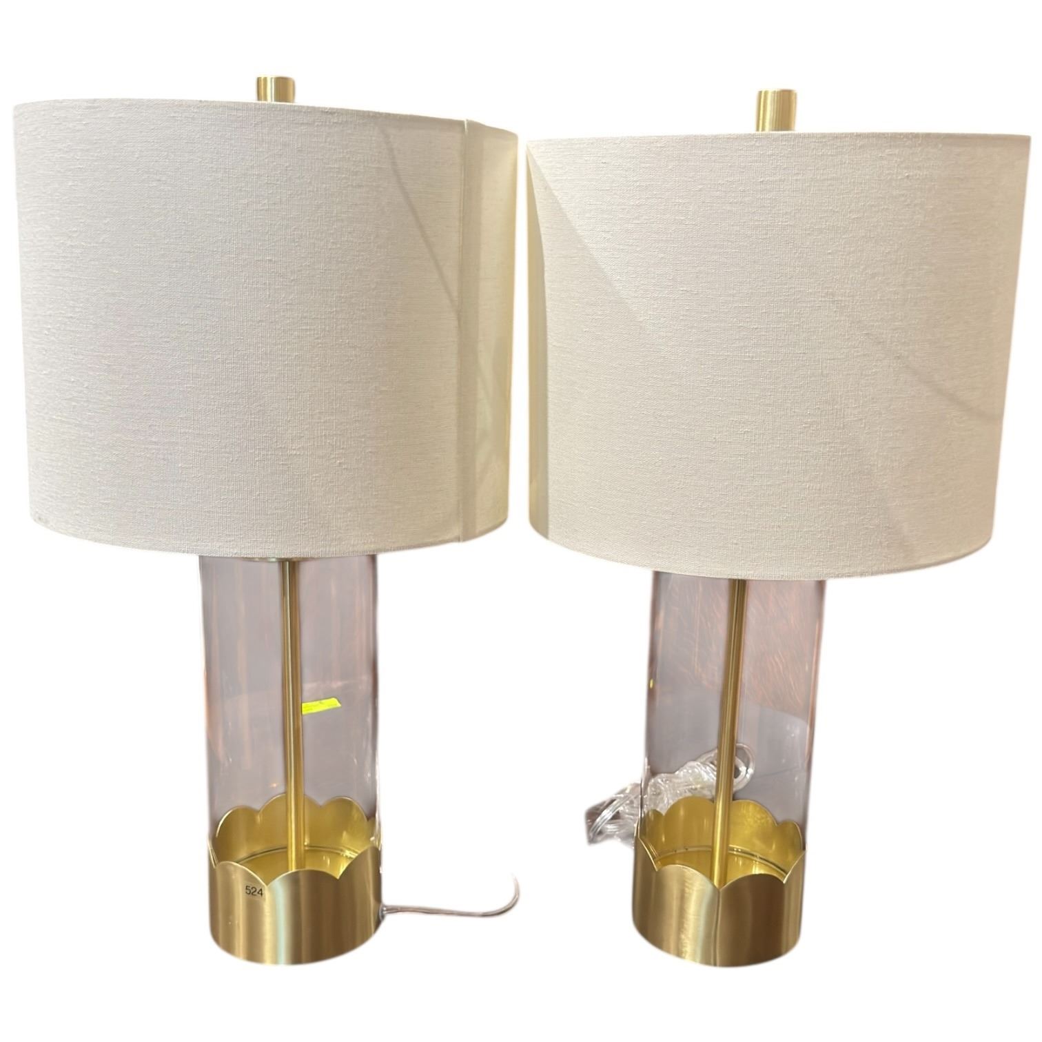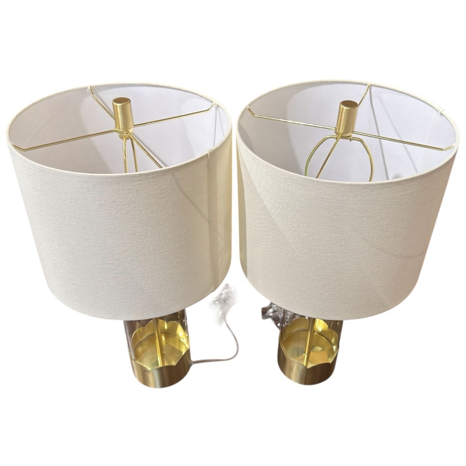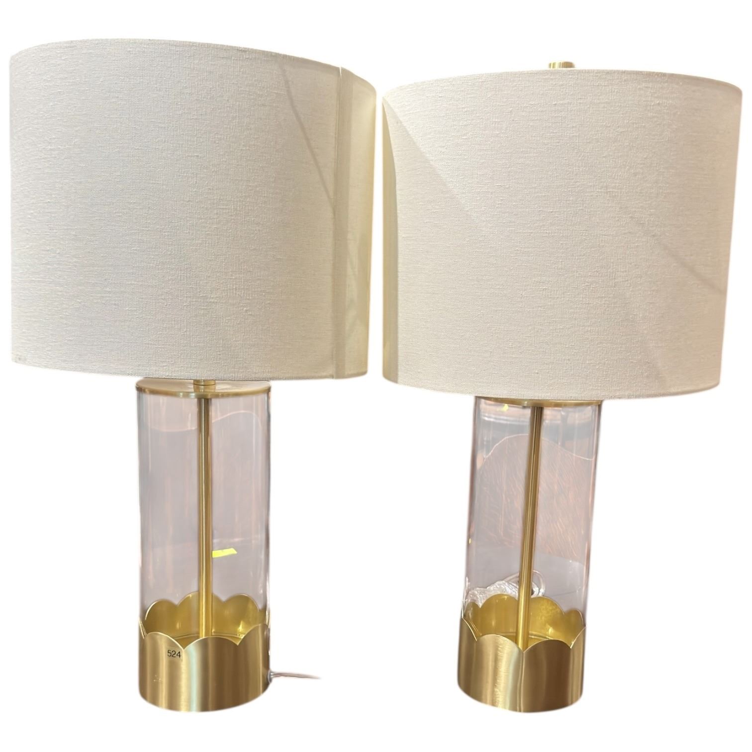 Pair of contemporary table lamps featuring brass bases paired with glass elements. Each lamp stands 22-Inch tall, offering a design suitable for various interior styles. Item is as pictured.