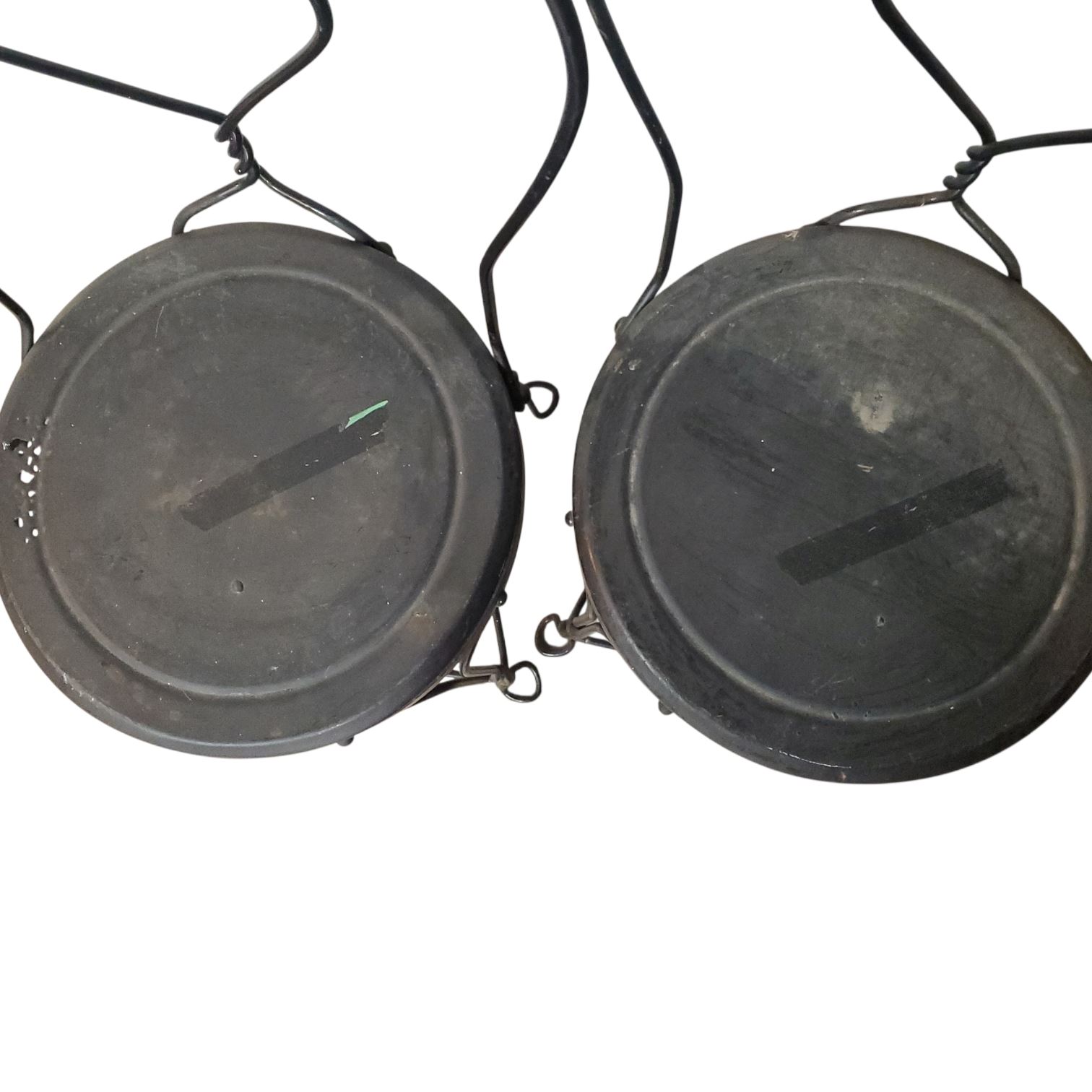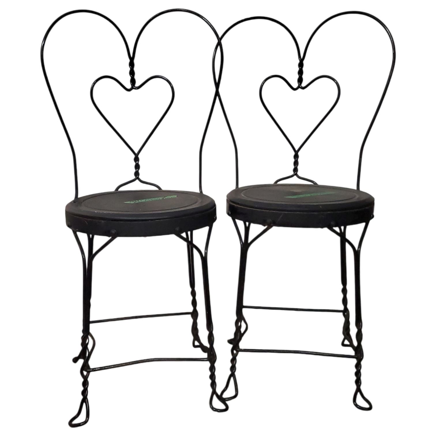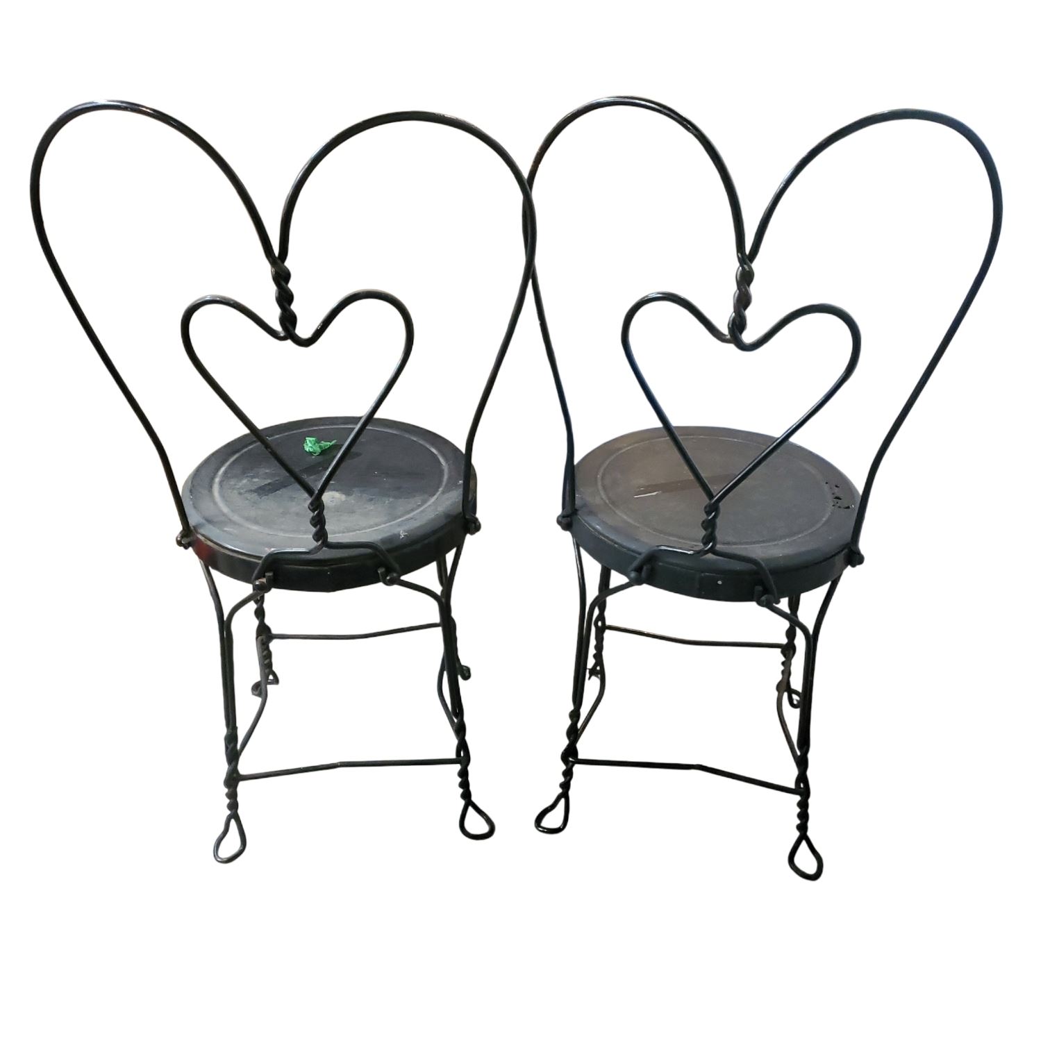 Pair of early 20th-century Victorian-style twisted wrought iron ice cream parlor chairs. Black finish with heart-shaped backrest design. Chairs stand 36 inches tall, showcasing traditional craftsmanship. Ideal representation of period-specific furniture design.