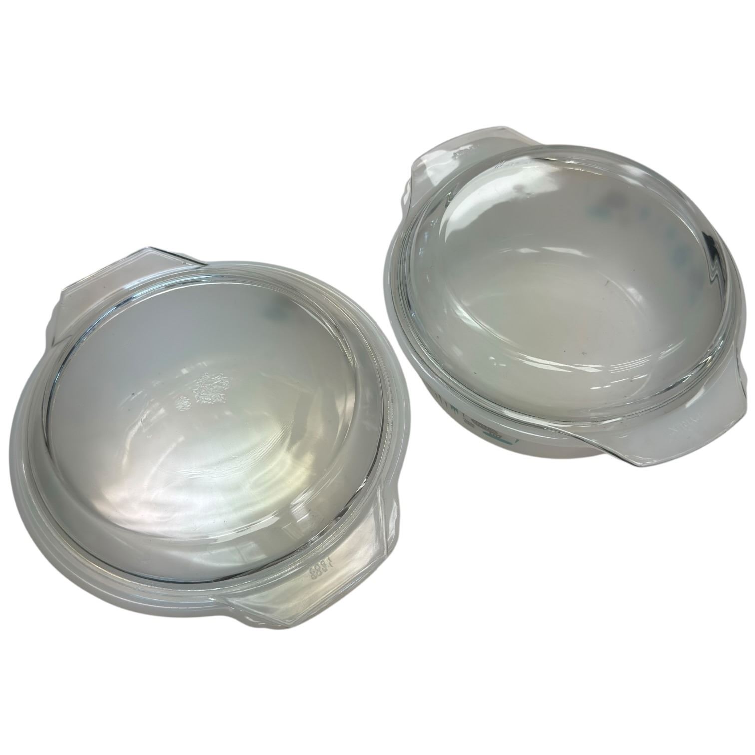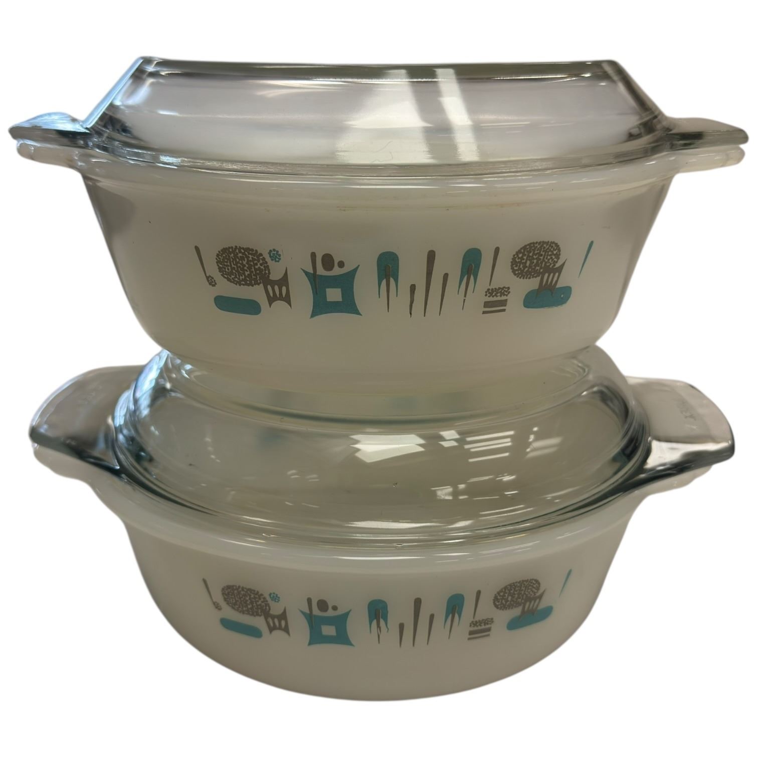 Pair of Fire-King Blue Heaven casserole dishes in white milk glass with turquoise & gray atomic geometric design. Produced circa 1950s-1970s. Includes one Pyrex lid & one JAJ lid. Each dish measures 9-Inch diameter. Popular example of mid-century modern design. No chips