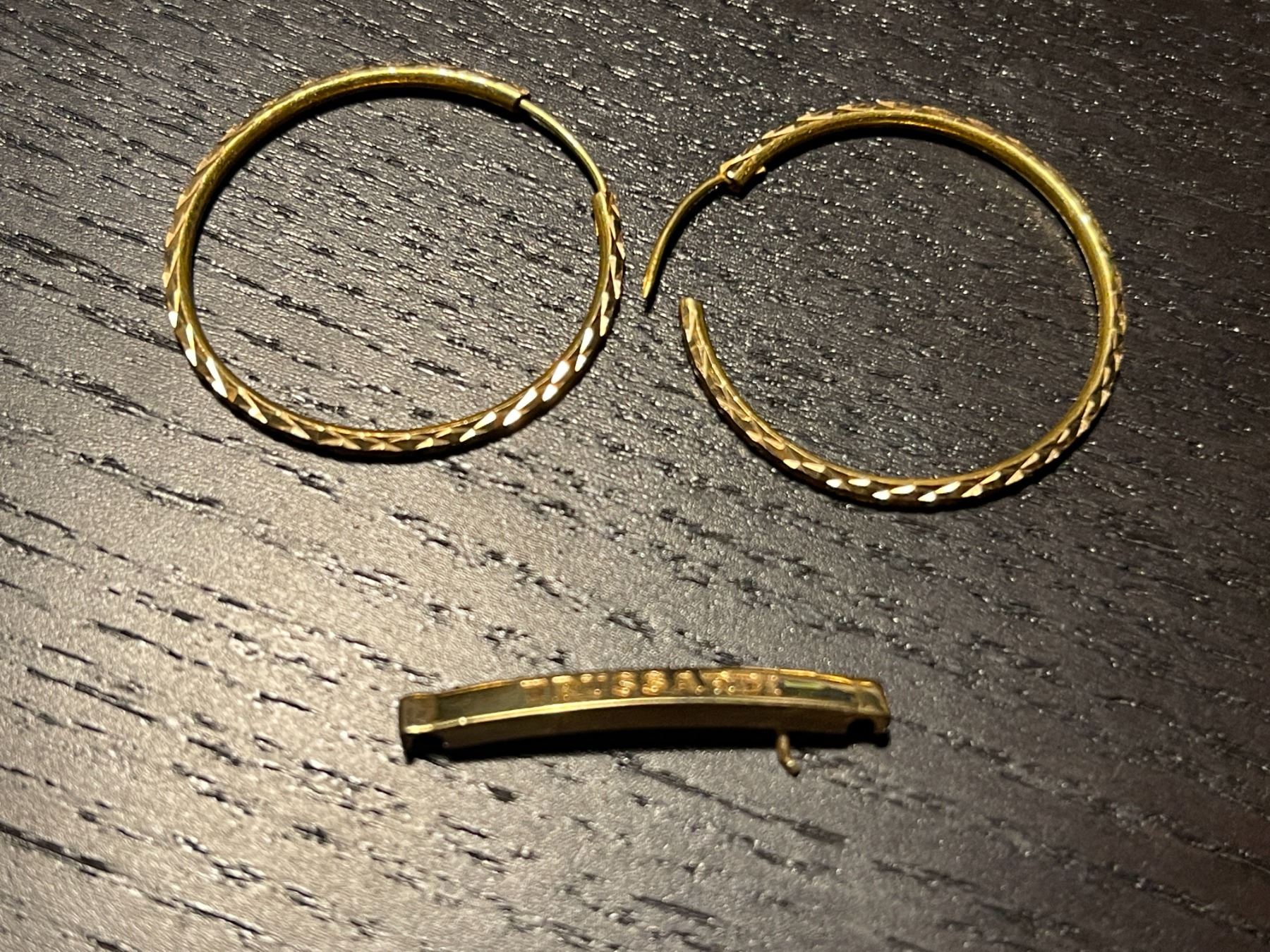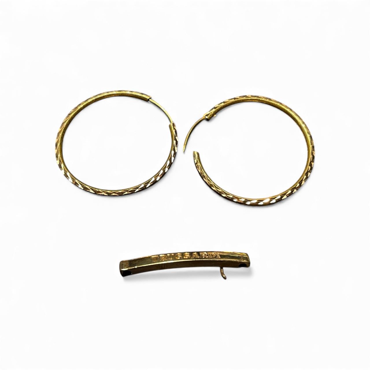 Pair of Gold Hoop Earrings and a Trussardi L Part - Said to be 18KT - Unstamped - Earrings are 1.25" diameter - Total Weight: 4.3 grams
