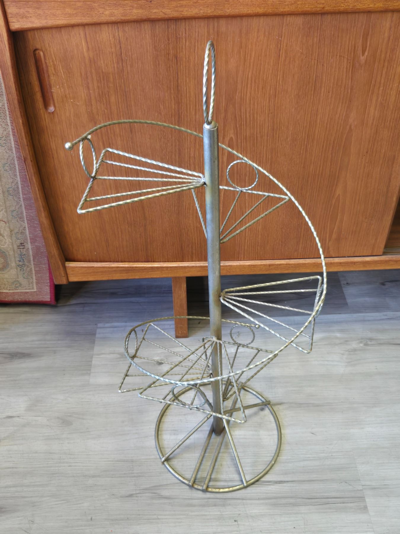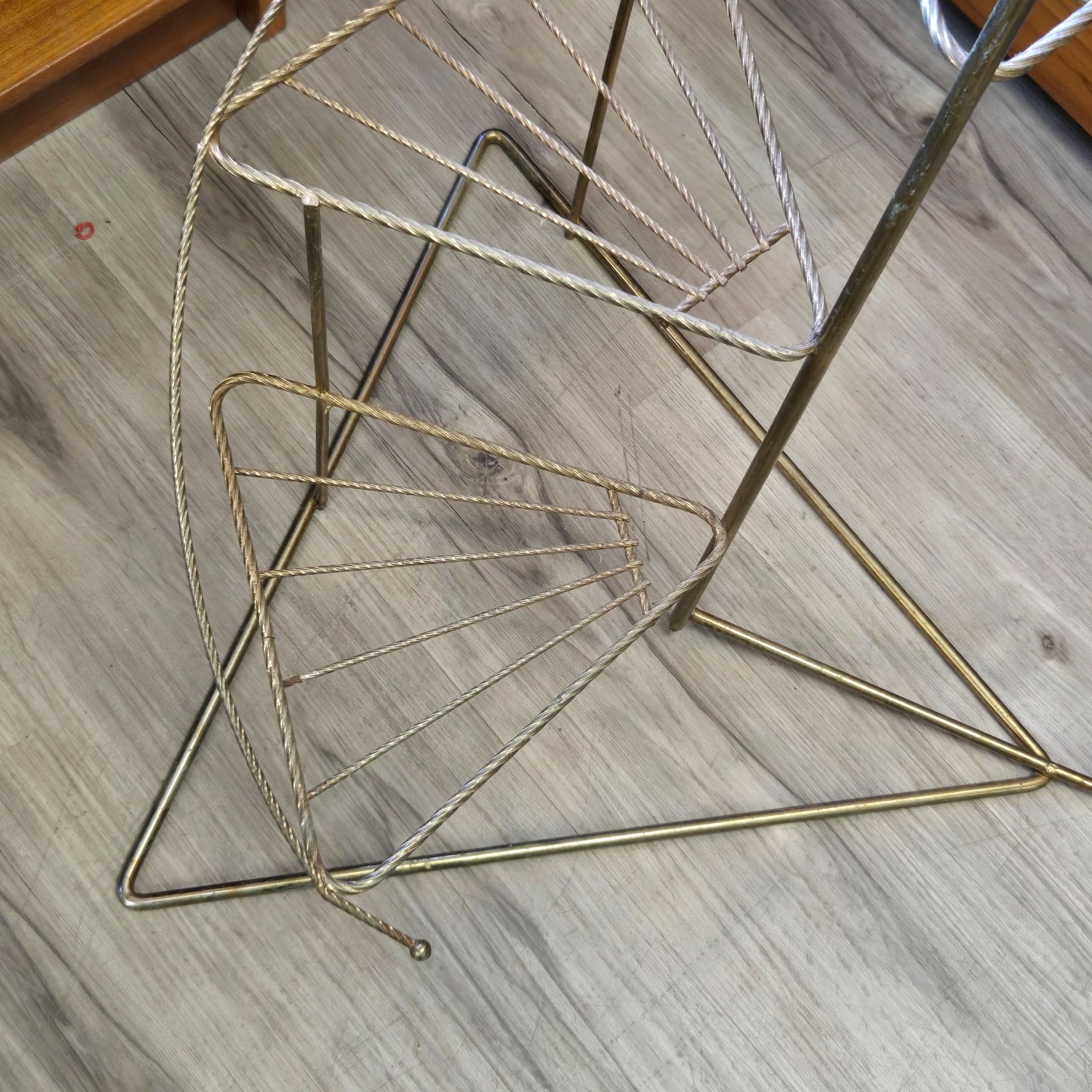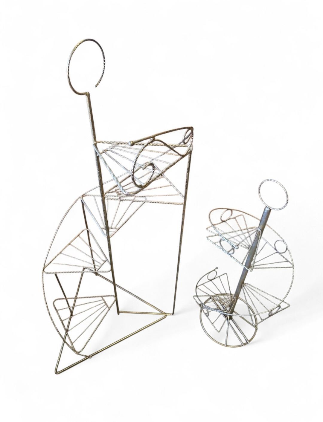 Pair of Mid Century Modern plant stands in gold tone wire staircase design. Tallest stand measures 43.5-Inch, and shorter one measures 31-Inch. Suitable for interior decor or functional plant display. Item is as pictured.
