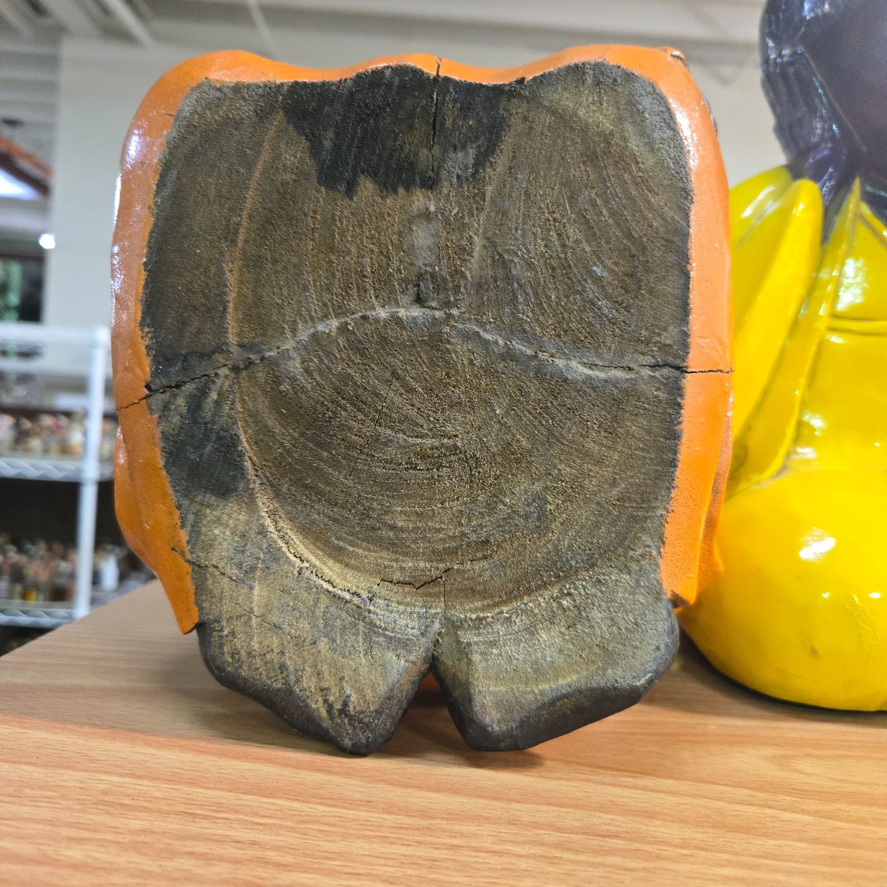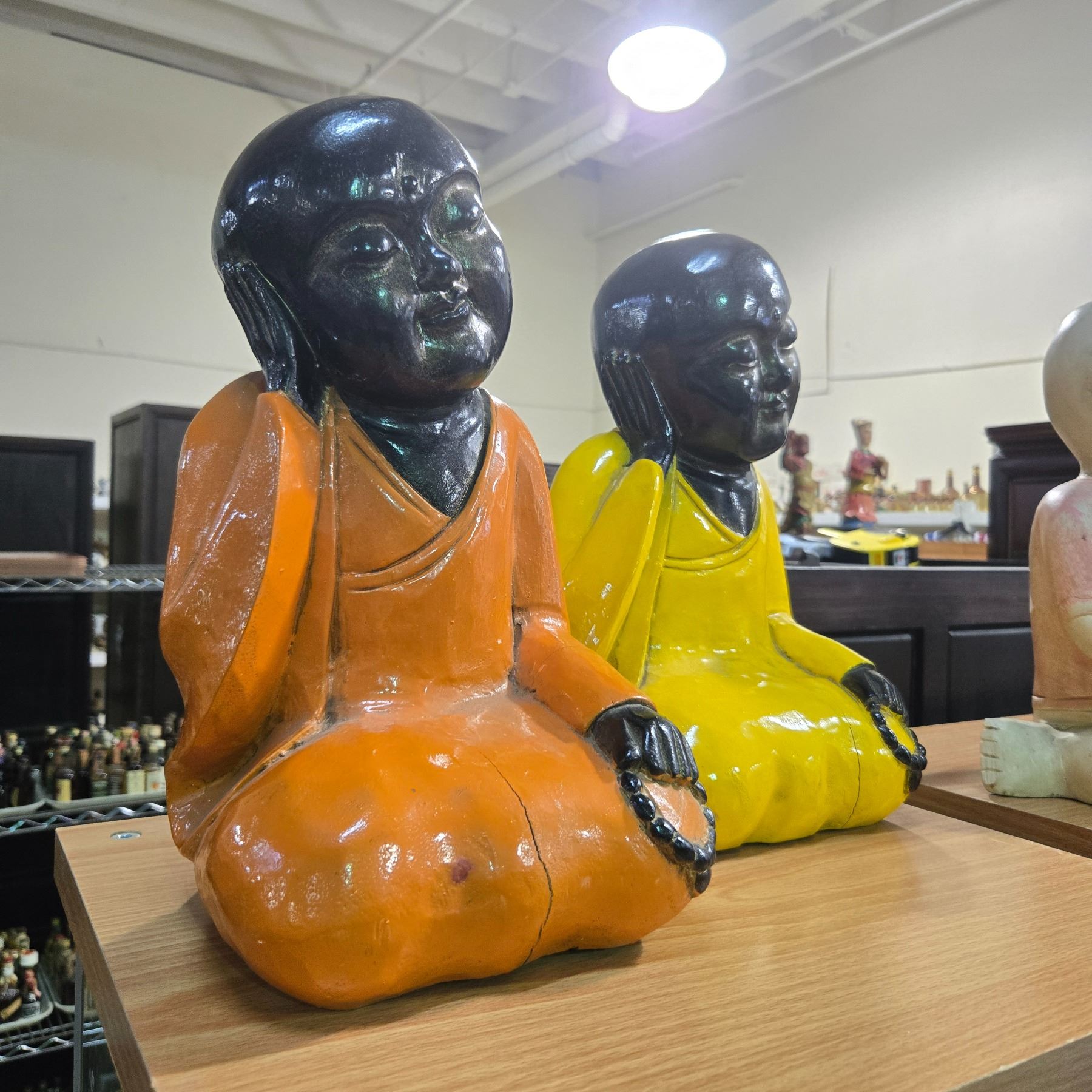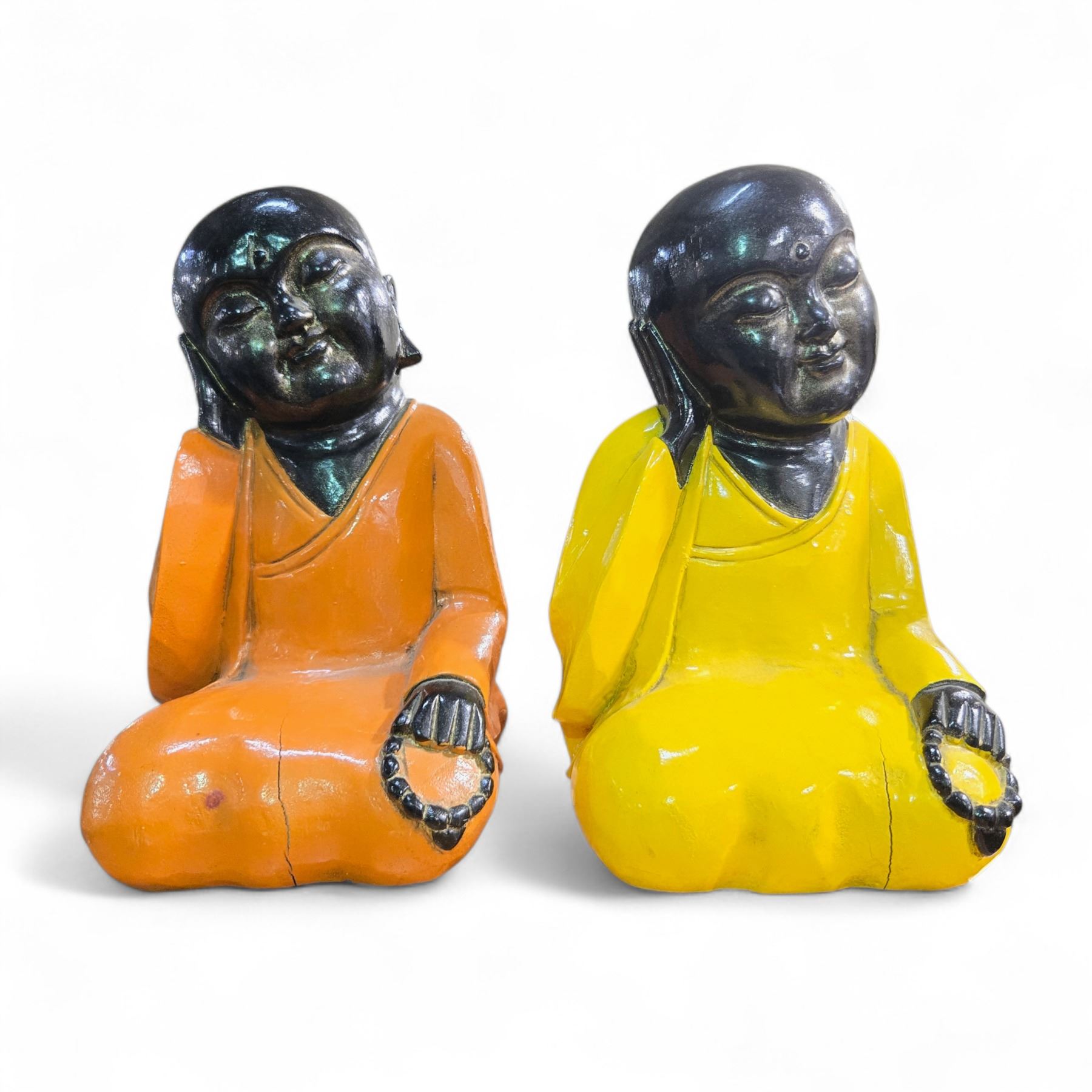 Pair of Hand Carved & Painted Wood Baby Buddha Statues - 7" x 7" x 13" tall