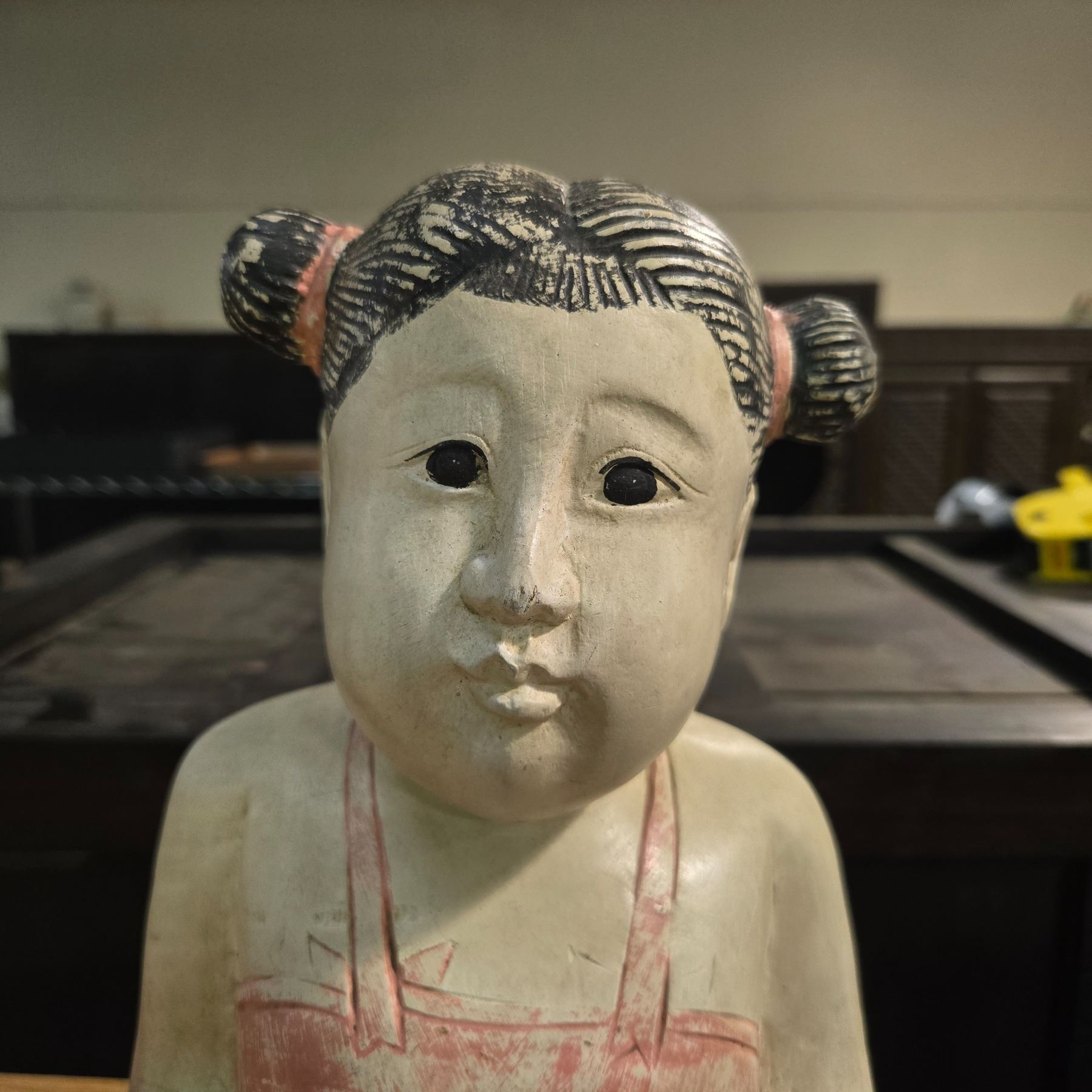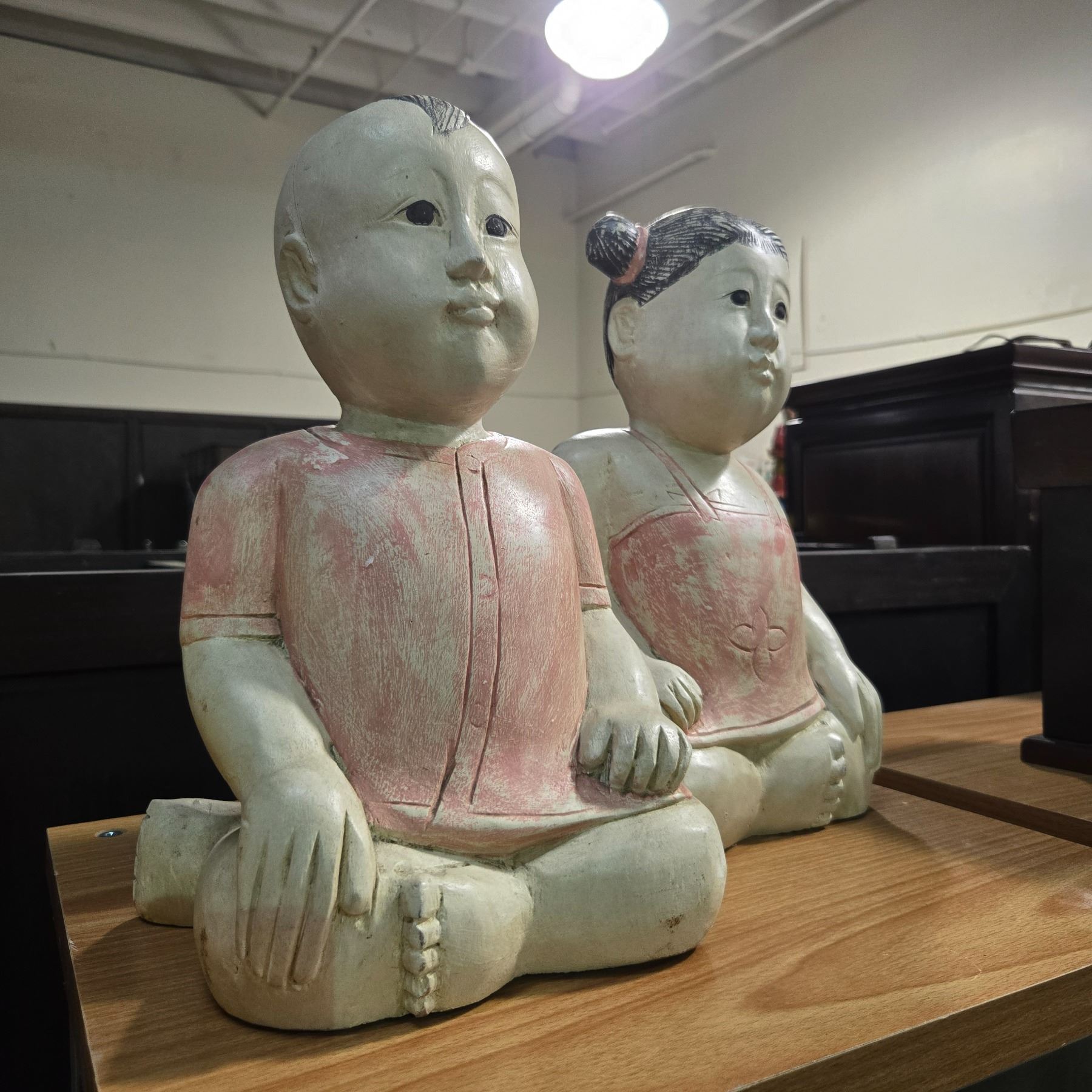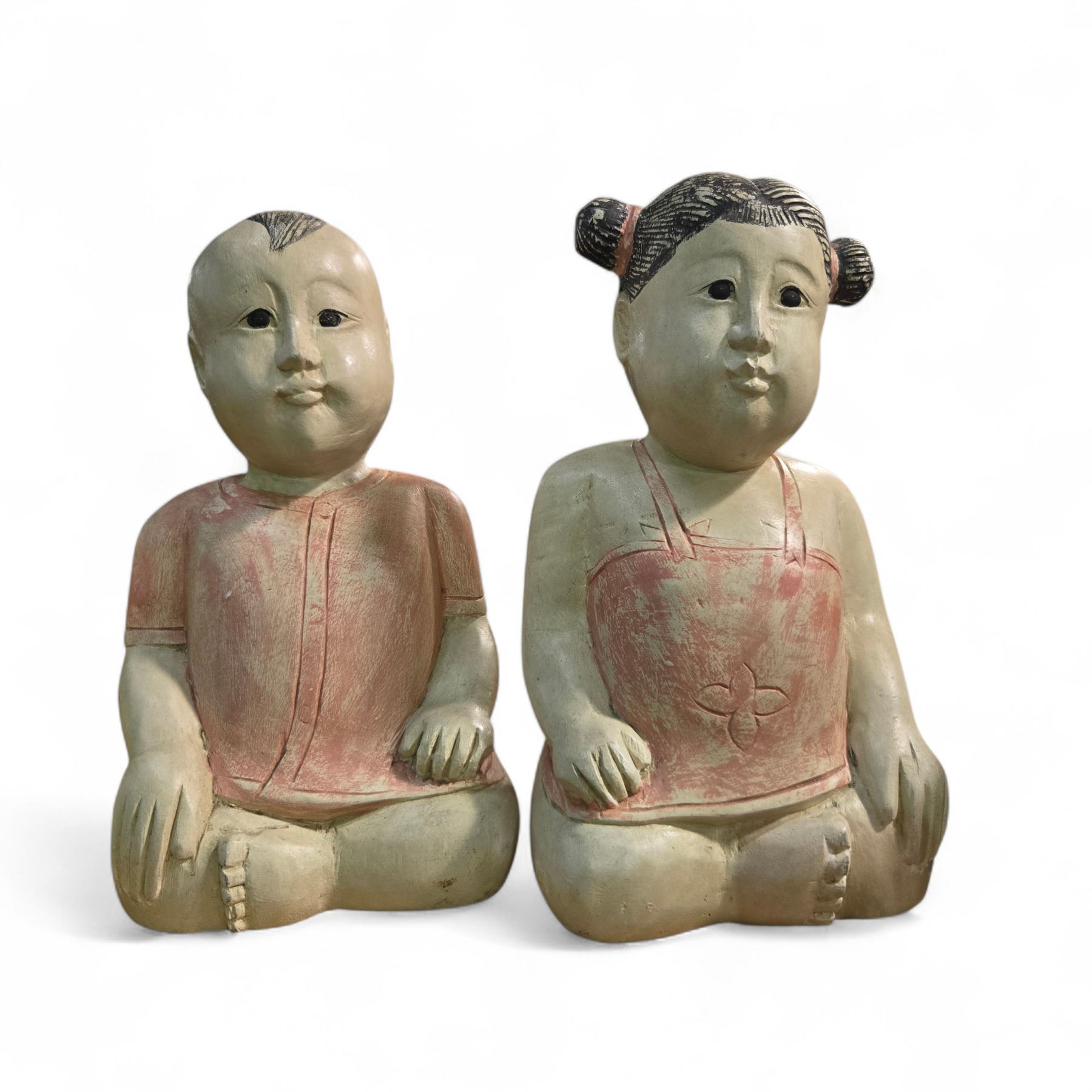 Pair of Hand Carved & Painted Wood Good Luck Baby Boy & Girl Statues - Each is 14" tall x 8" wide