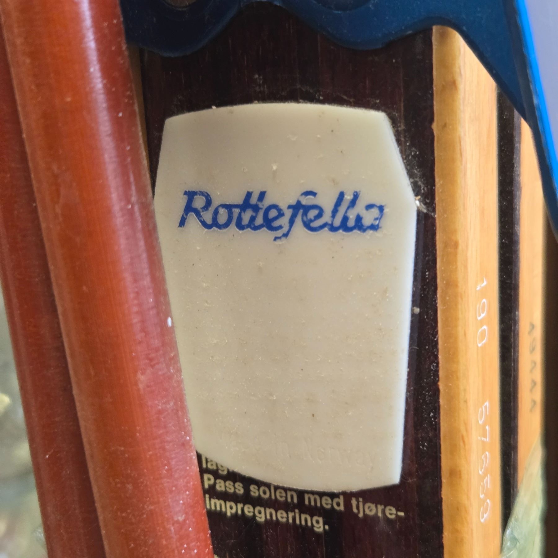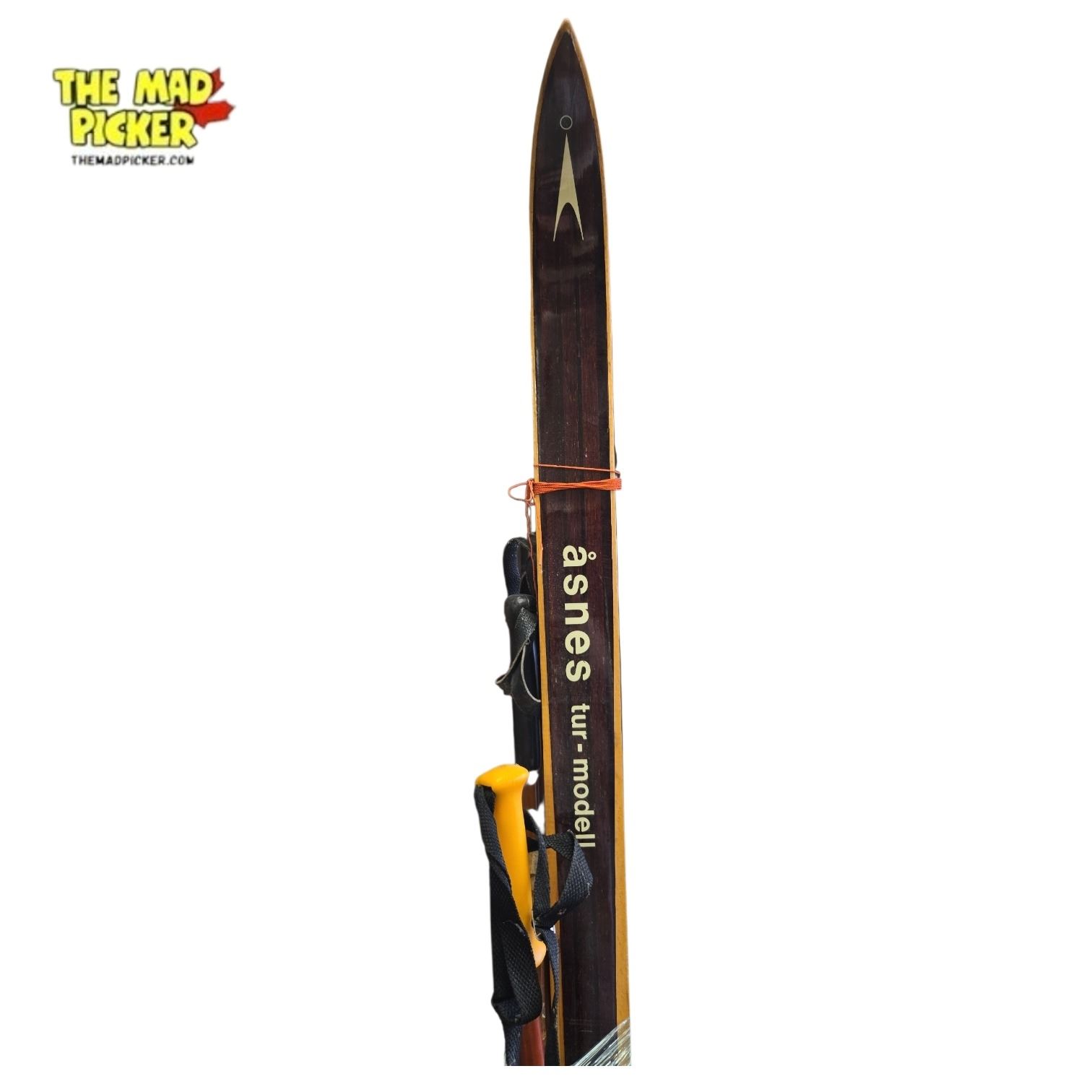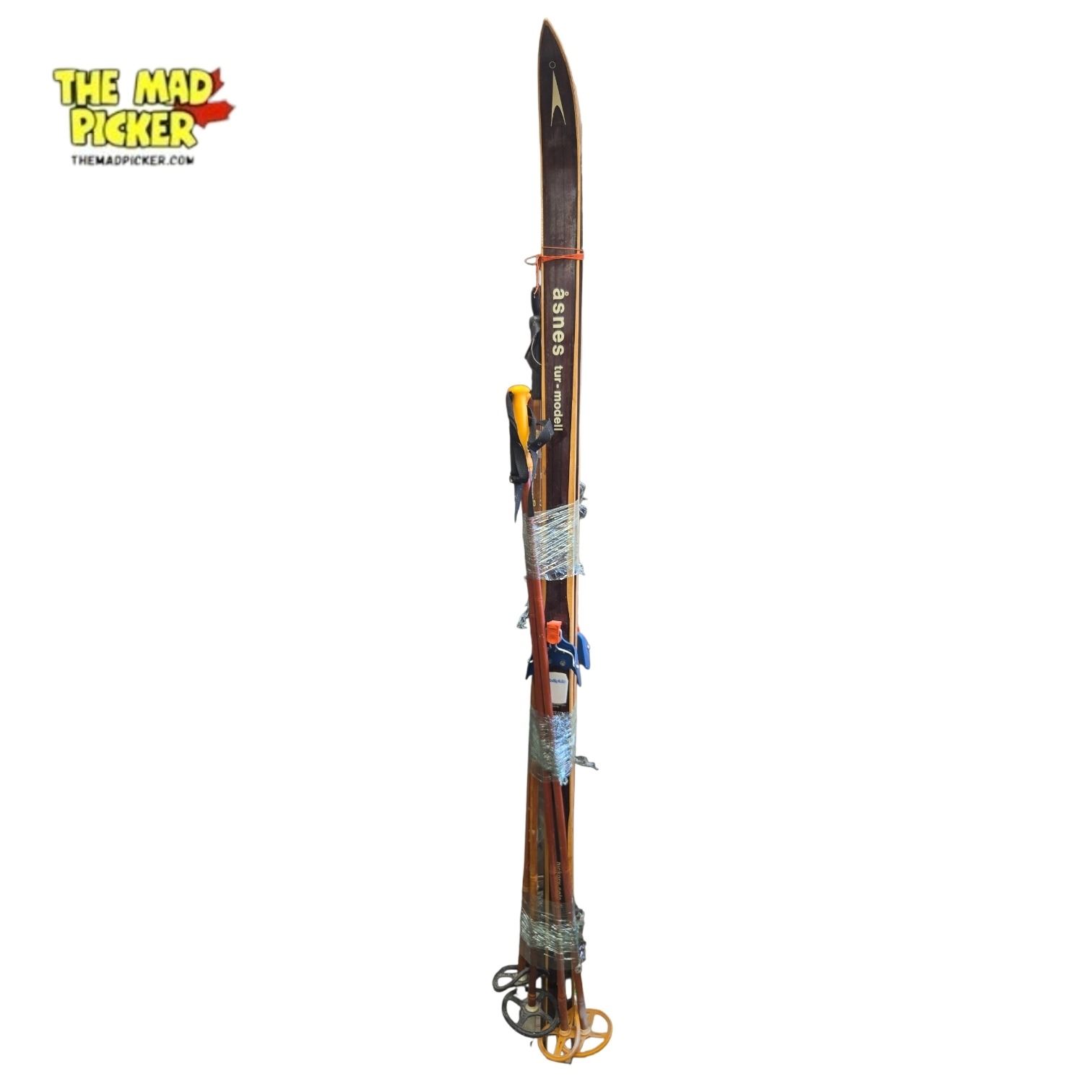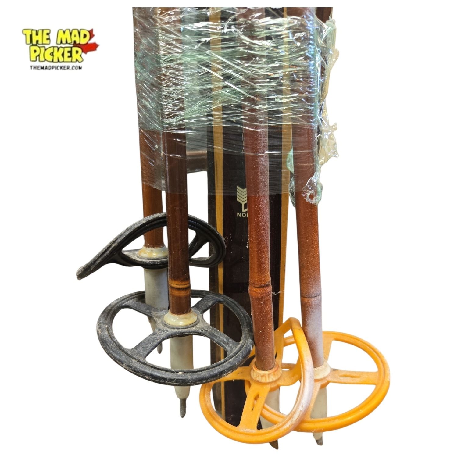 Pair of vintage Tur-Modell skis crafted with hickory soles, made in Norway. Features Rottefella Telemark ski bindings. Likely mid-20th century production, showcasing traditional Norwegian craftsmanship. Ideal for display or study of historical ski design and construction.