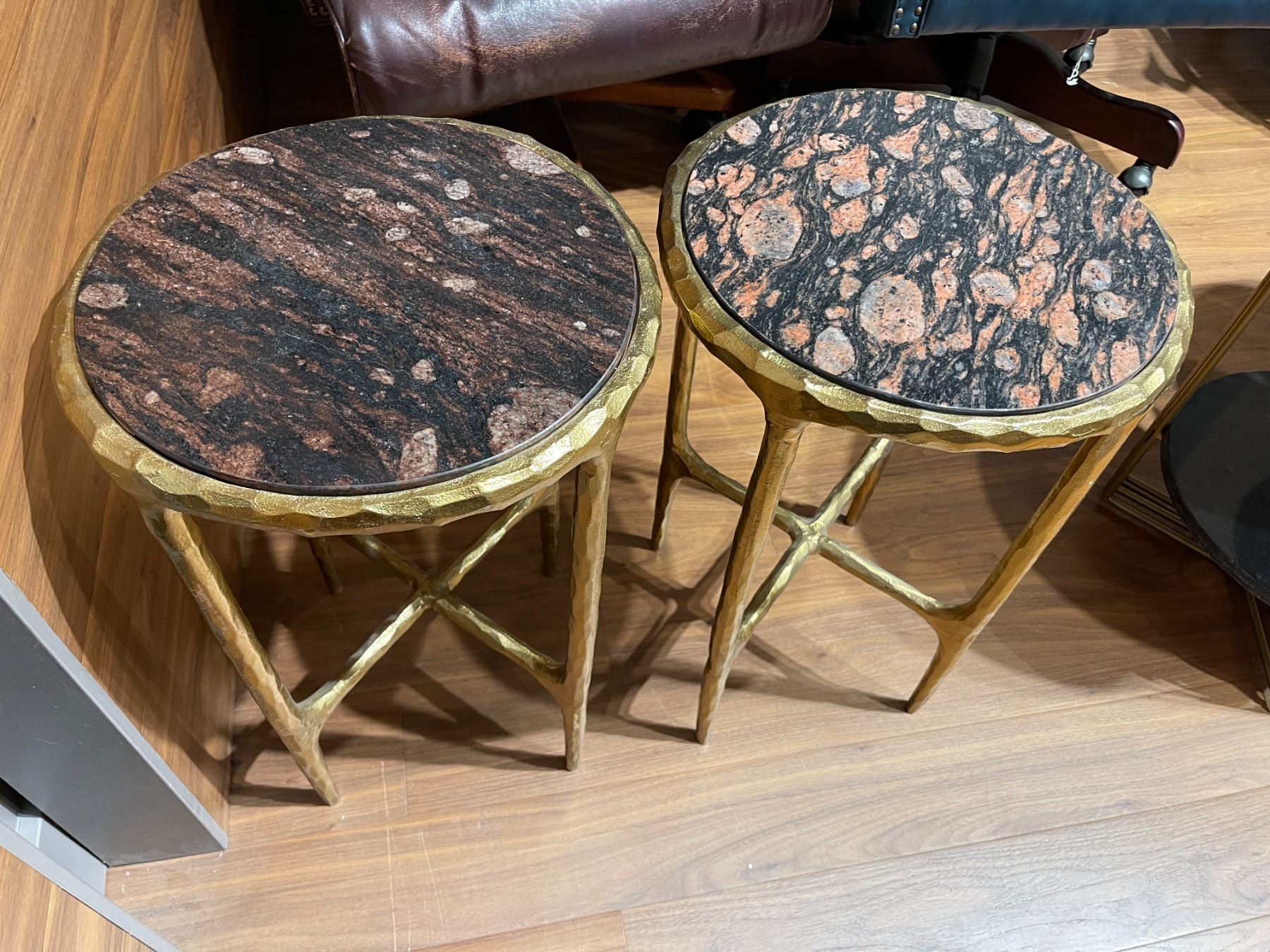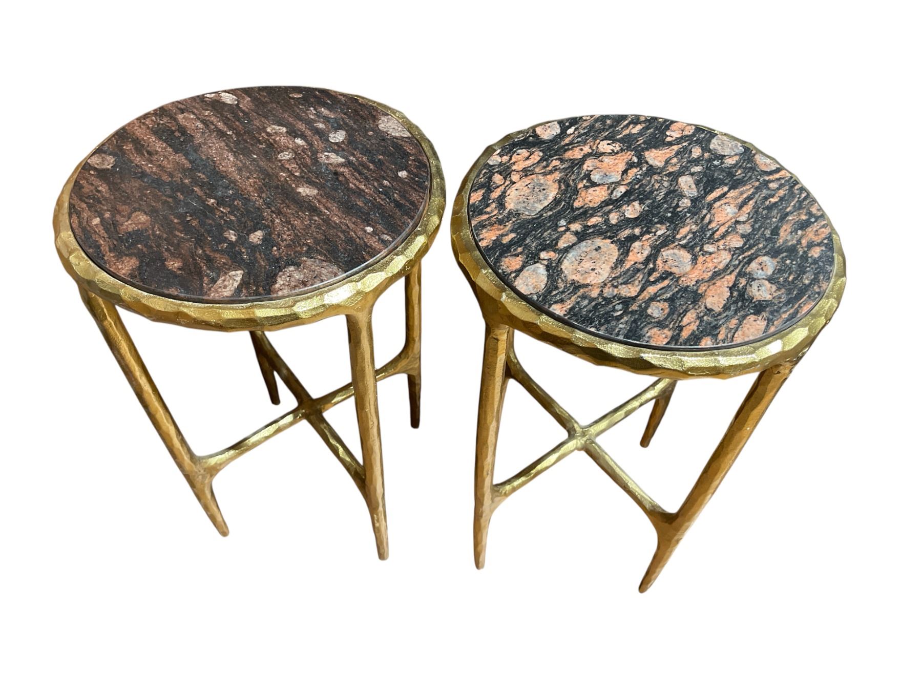 Pair of Marble Topped Accent Tables with Golden Metal Frames (22" tall x 15" diameter)