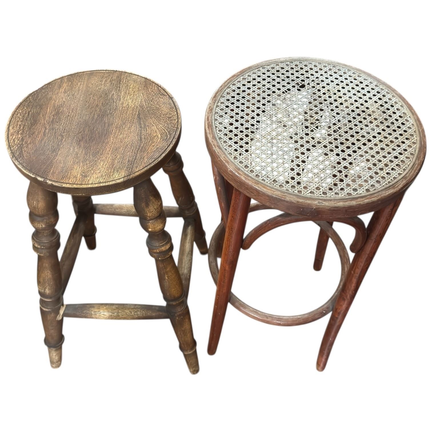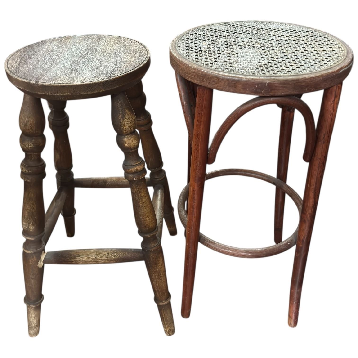 This pair of mismatched bar stools includes one wood spindle stool measuring 29-Inch tall and one bentwood frame stool with a rattan seat measuring 30-Inch tall. Both feature unique designs and sturdy constructions. Item is as pictured.