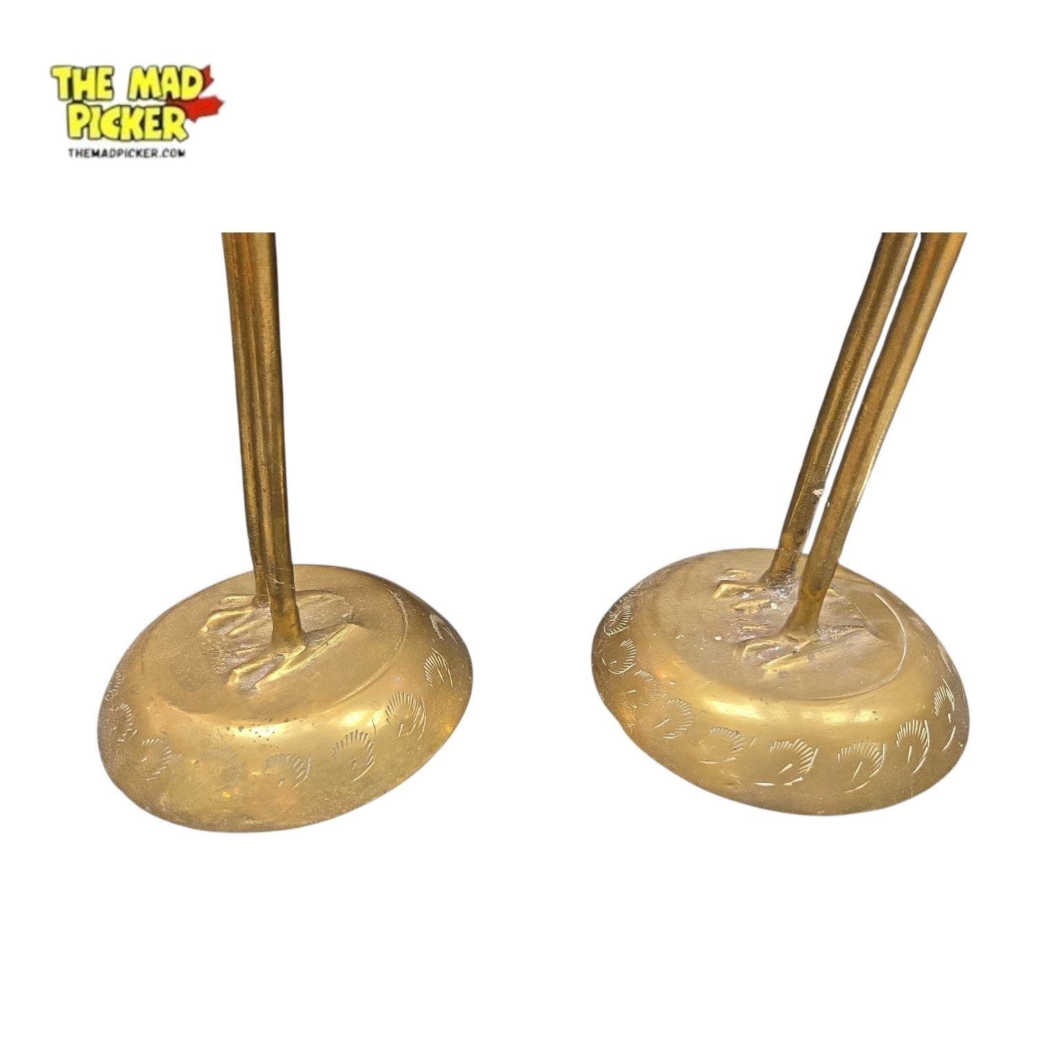 Pair of vintage brass crane sculptures, 17 inches tall, often linked to mid-century modern or Hollywood Regency decor. Crafted from cast brass or aluminum with a gold finish, featuring detailed elongated forms. Likely from the 1970s, possibly of Italian or Korean origin. Nature-inspired decorative accents.