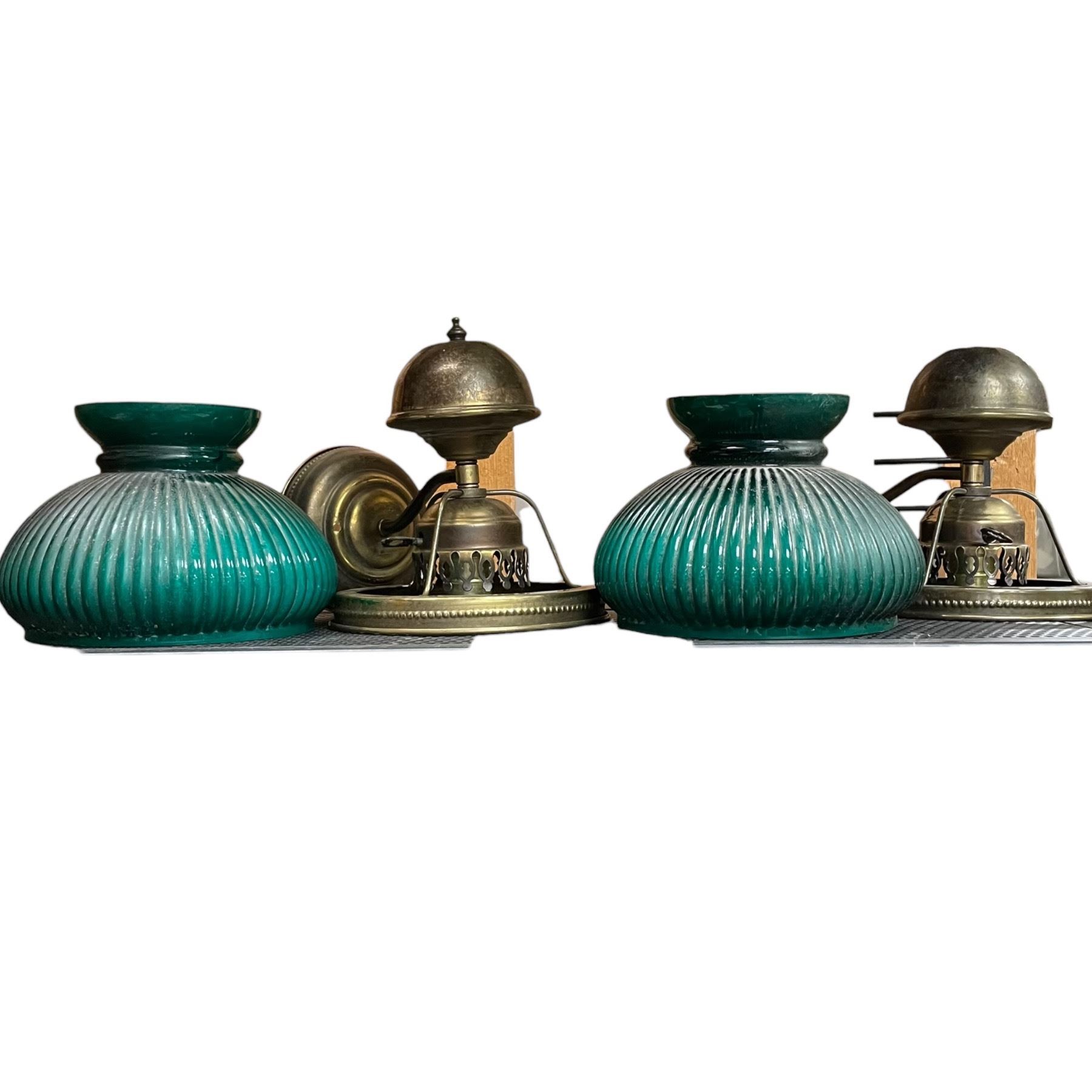 Pair of Vintage Brass Wall Mounted Lamps with Green Ribbon Shades 14" Tall