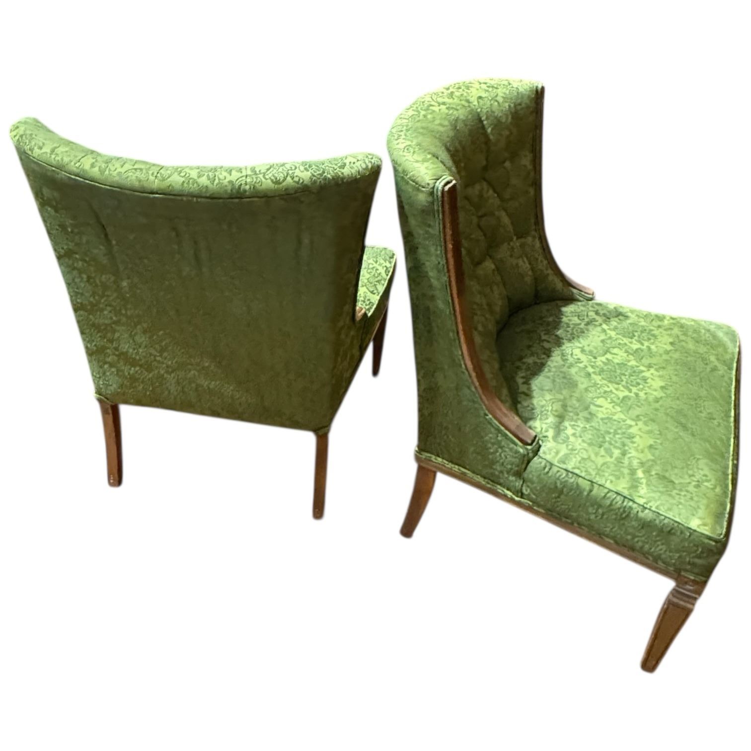 Pair of Vintage Button Back Parlour Chairs with Green Jacquard Upholstery