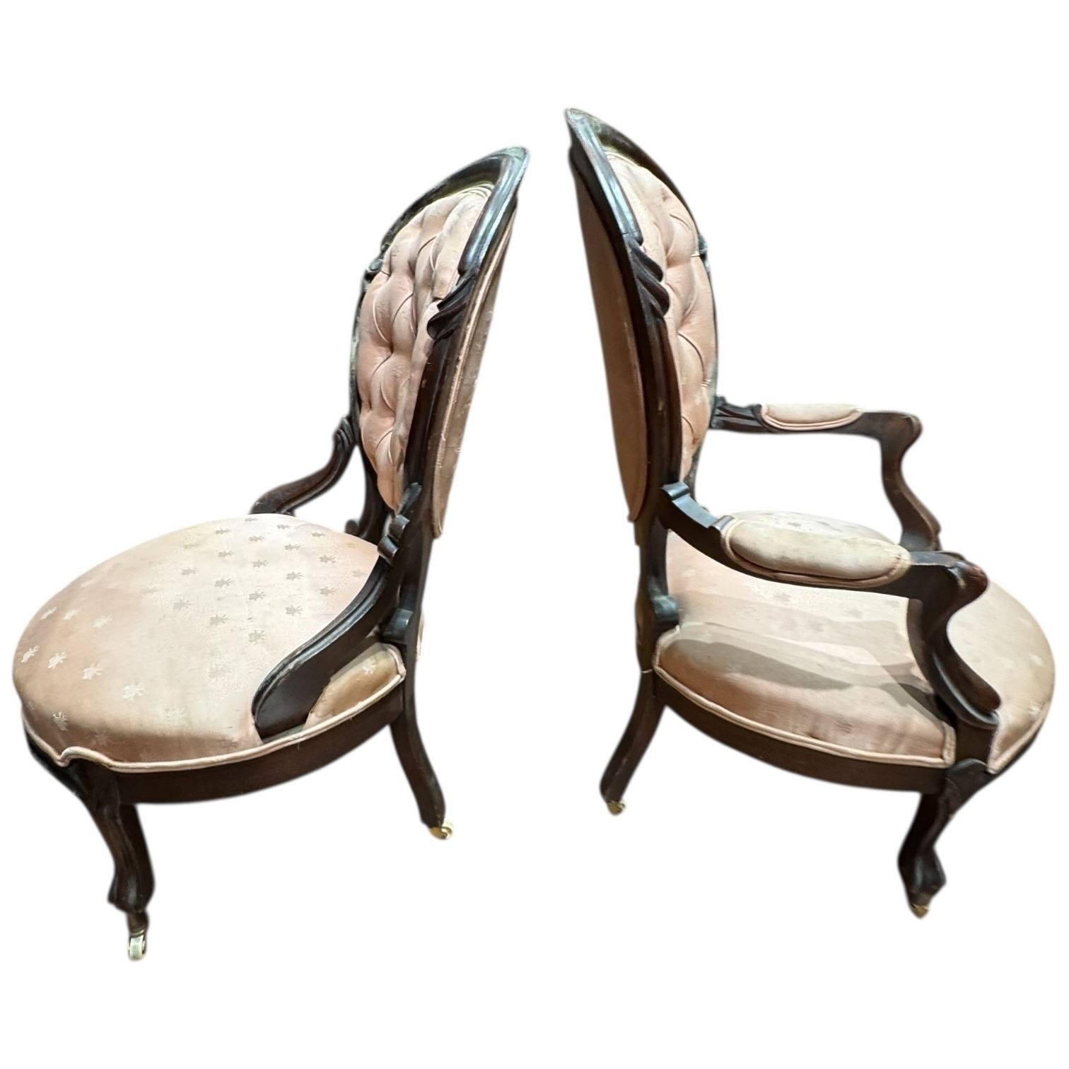 Pair of Vintage Cameo Back Mahogany Chairs with Pink Bumble Bee Upholstery