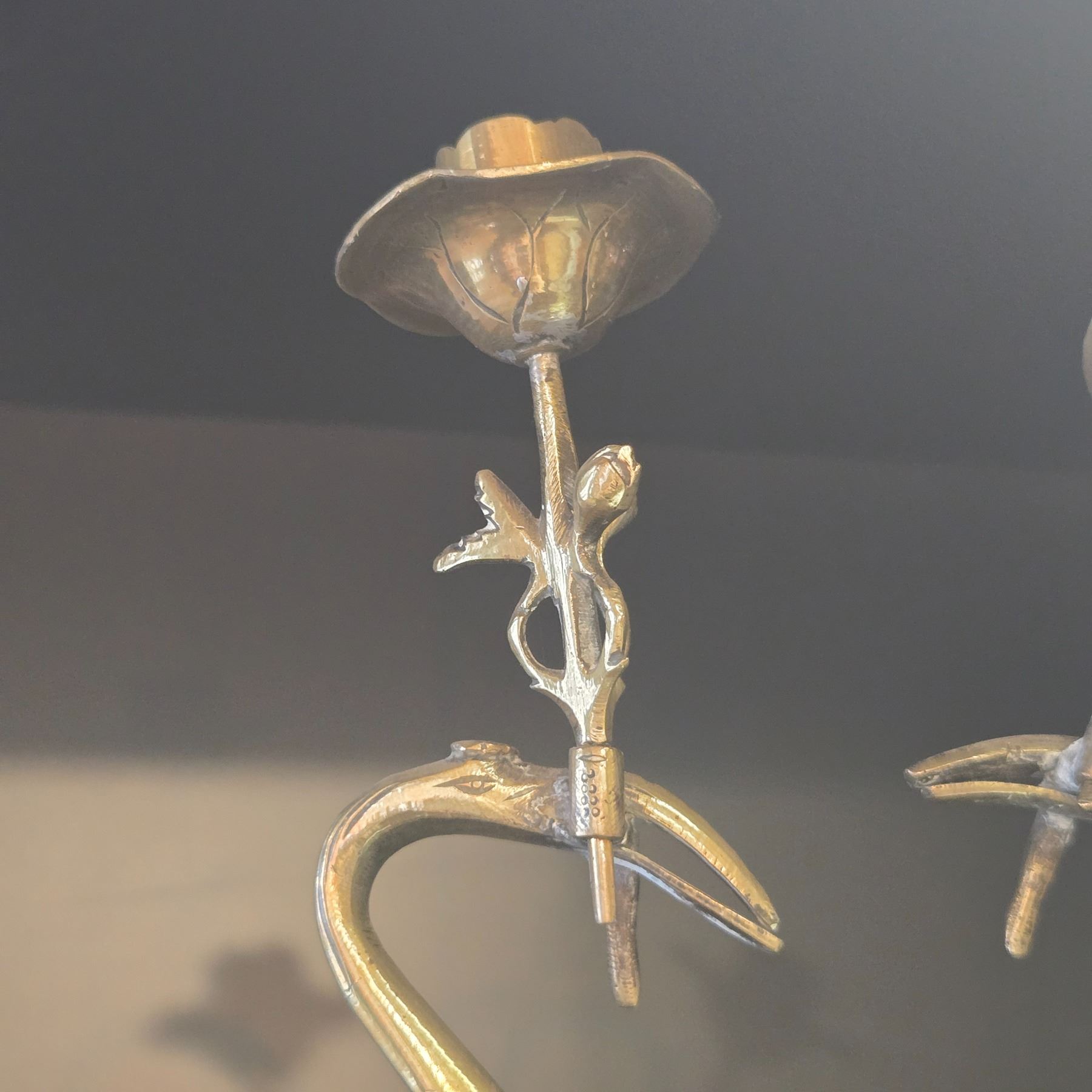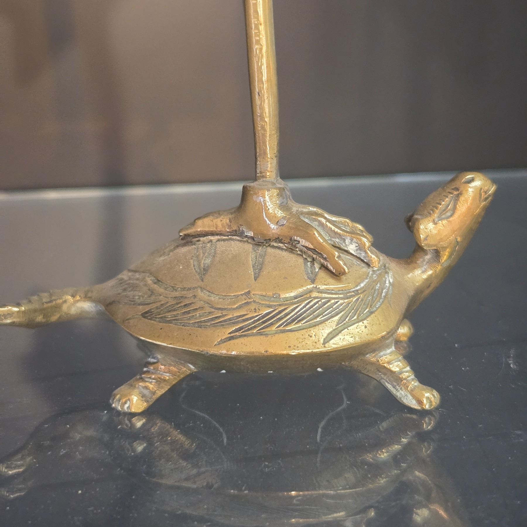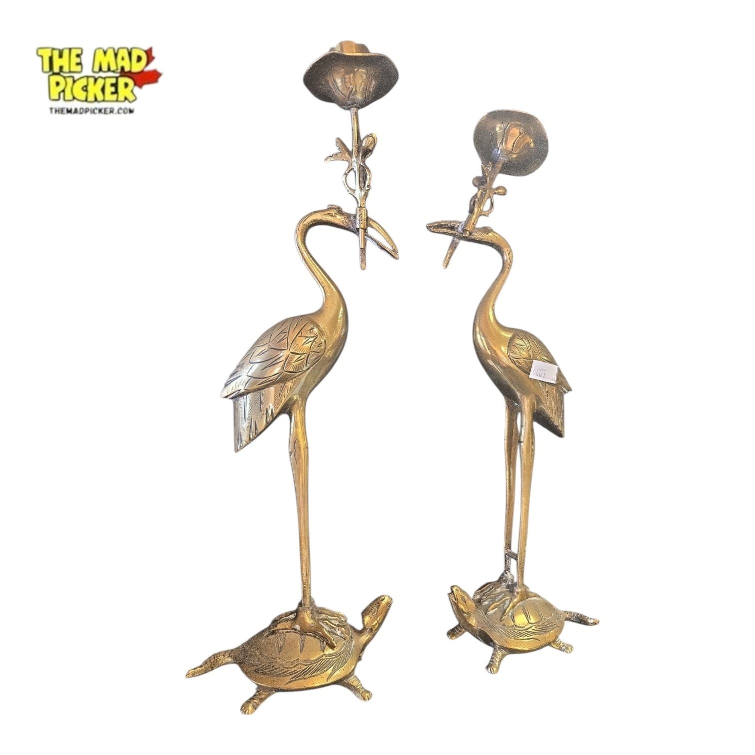Pair of vintage Japanese brass candlesticks, 13 inches tall, in Tsurukame style. Featuring crane (tsuru) and turtle (kame) motifs representing longevity and fortune in Buddhist symbolism. Traditionally used as altar tools or decorative objects. Crafted in brass with intricate detailing. Condition: Good.