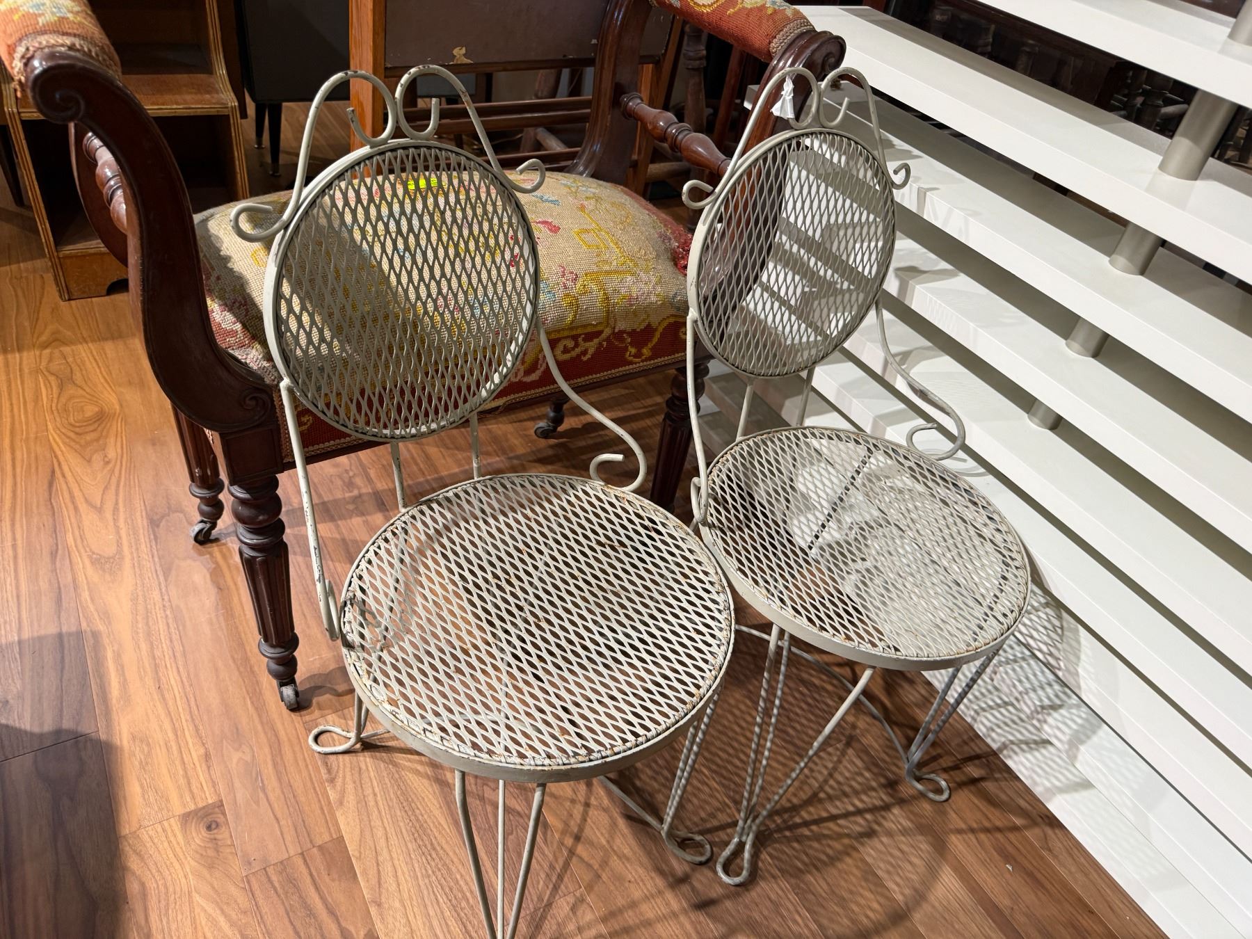 Pair of metal patio chairs designed in an ice cream parlour style. Each chair measures 33-Inch in height. Features ornate metalwork detailing on the backrests and legs. Suitable for outdoor or indoor seating. Item is as pictured.