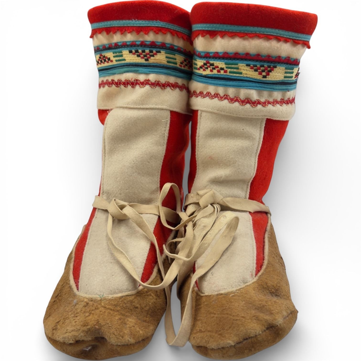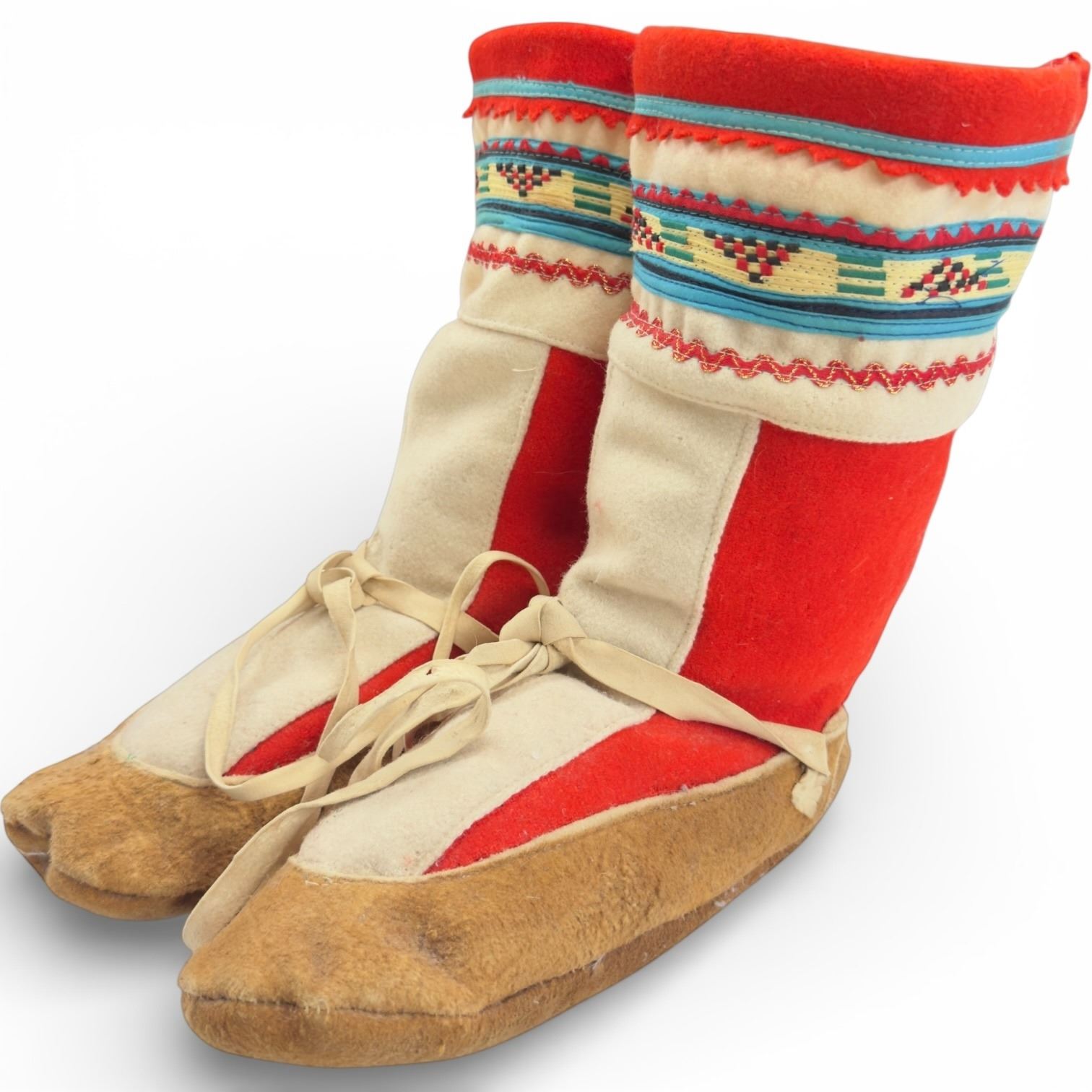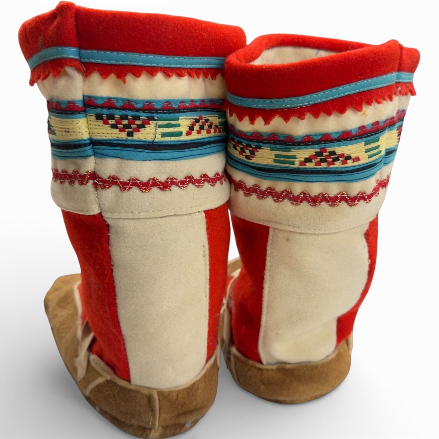 Pair of Vintage Mid-20th Century Athabascan Felt & Fabric Mukluk Boots with Leather Soles (11" long sole)