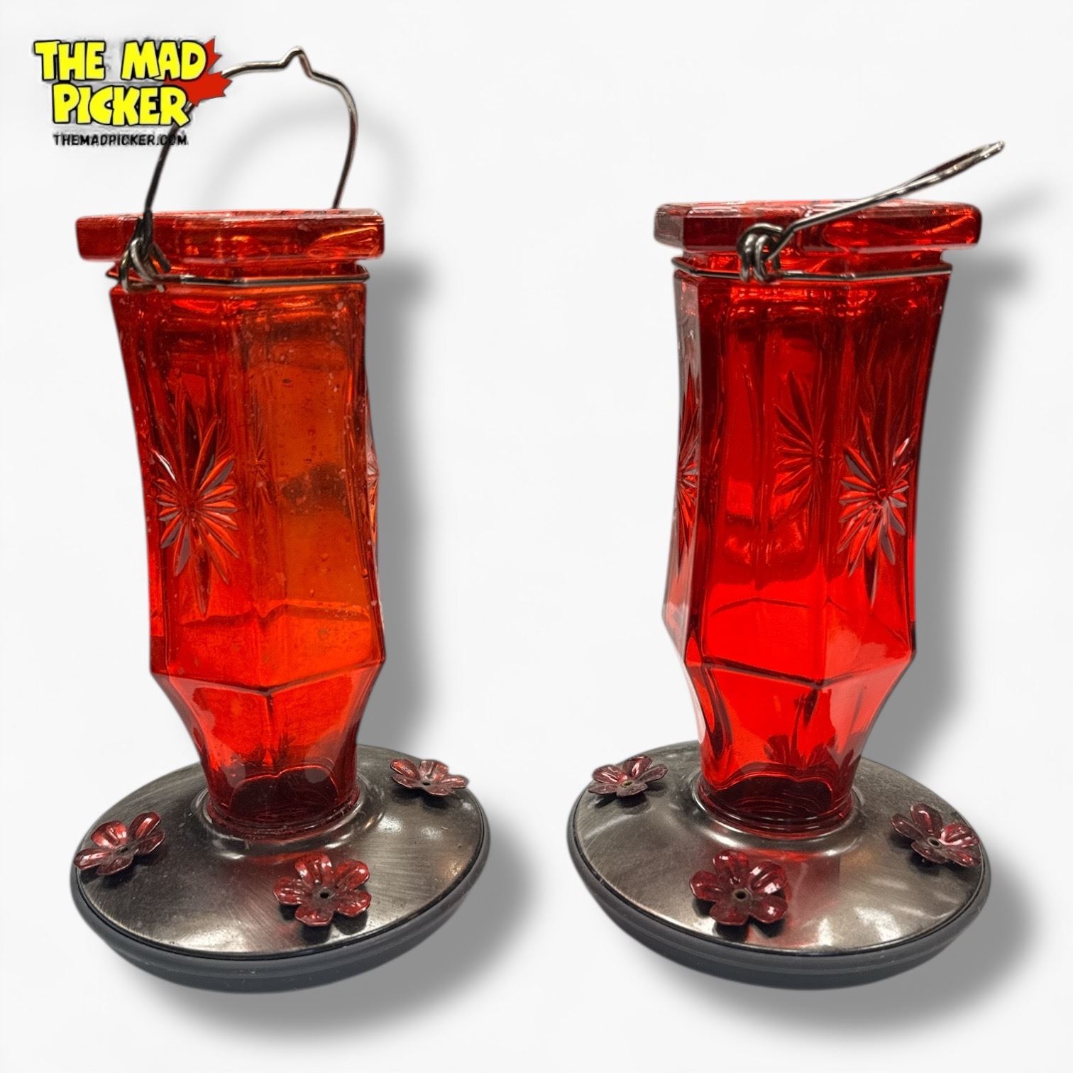 Pair of vintage hummingbird feeders featuring red glass reservoirs with metal bases. Designed for outdoor use, these feeders attract hummingbirds with their vibrant color. Likely mid-20th century production. Each feeder includes hanging hardware for easy installation.