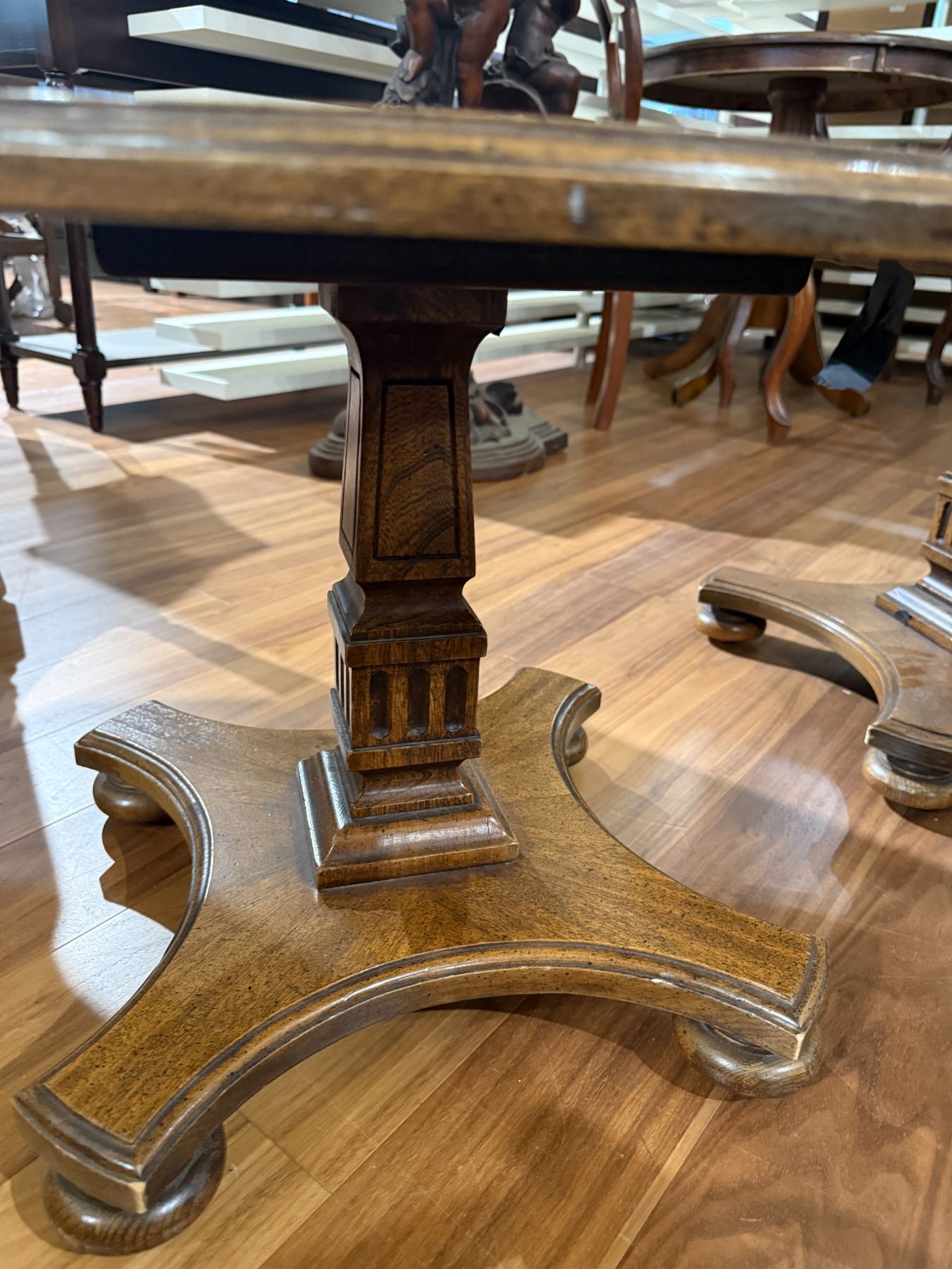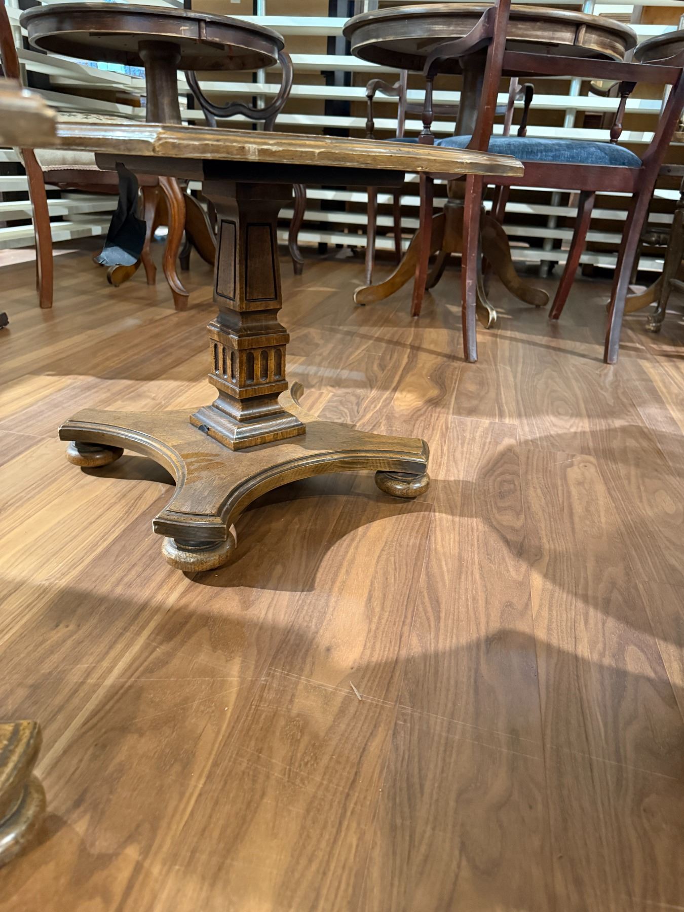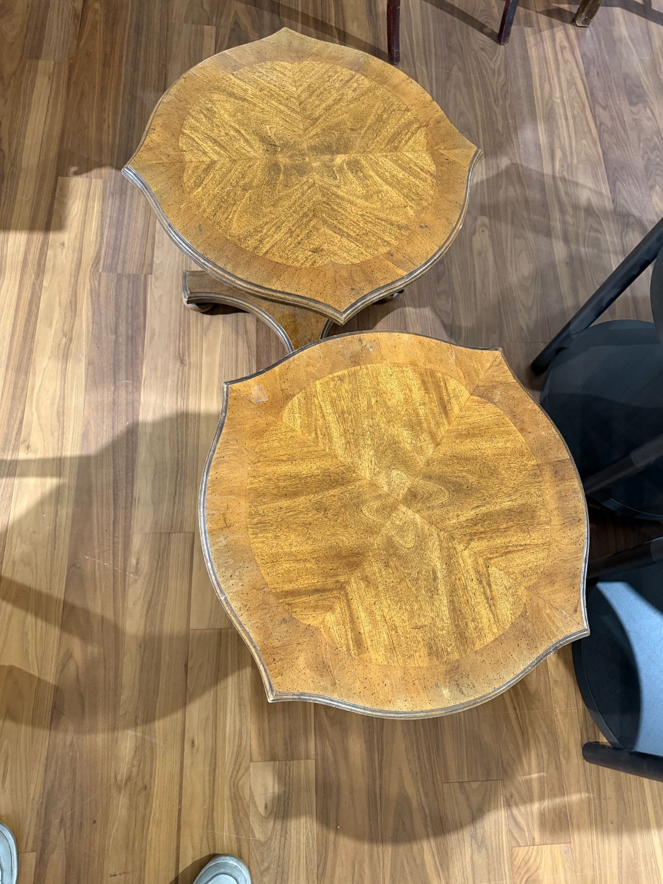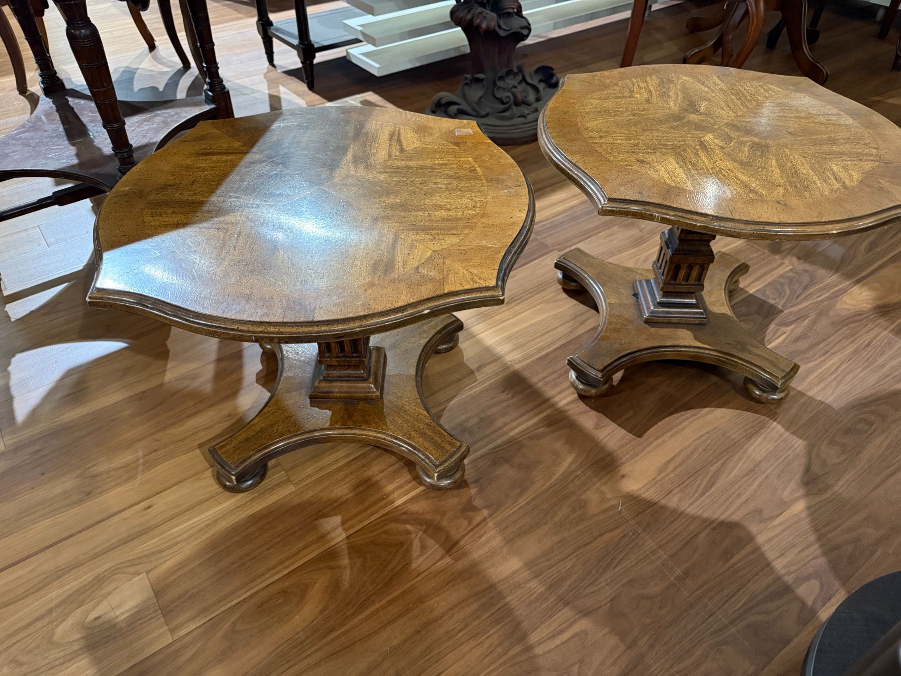 Pair of vintage wood side tables featuring scalloped edges. Each table measures 22-Inch length, 22-Inch width, and 16.5-Inch height. Classic design suitable for various decor settings. Item is as pictured.