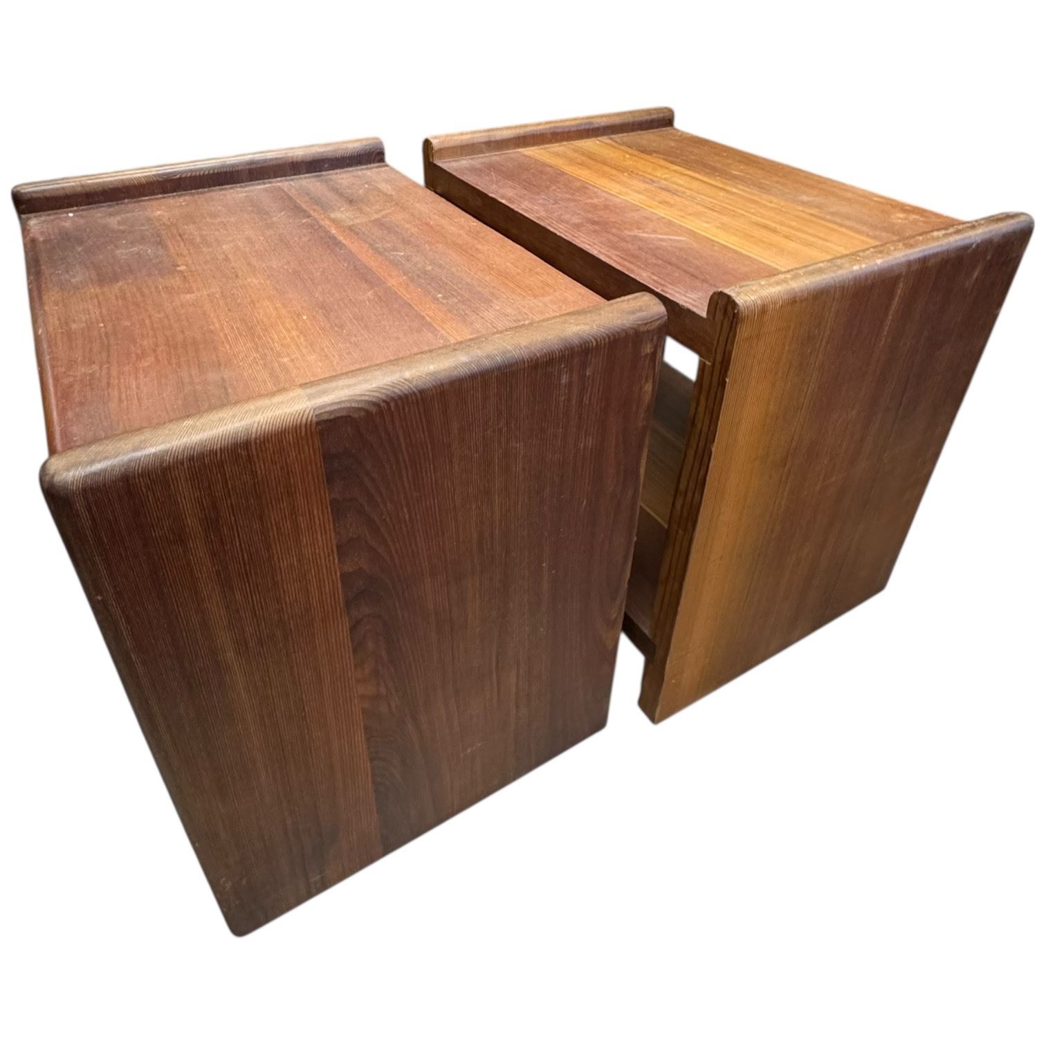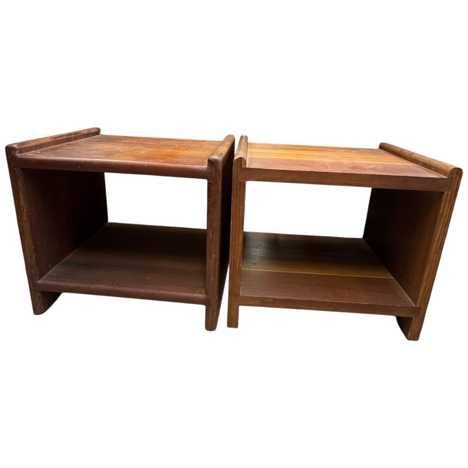 Pair of vintage solid wood side table night stands with dimensions of 20.5-Inch length, 14.5-Inch width, and 19-Inch height. Constructed from durable solid wood, suitable for use as bedside or living room accent tables. Item is as pictured.