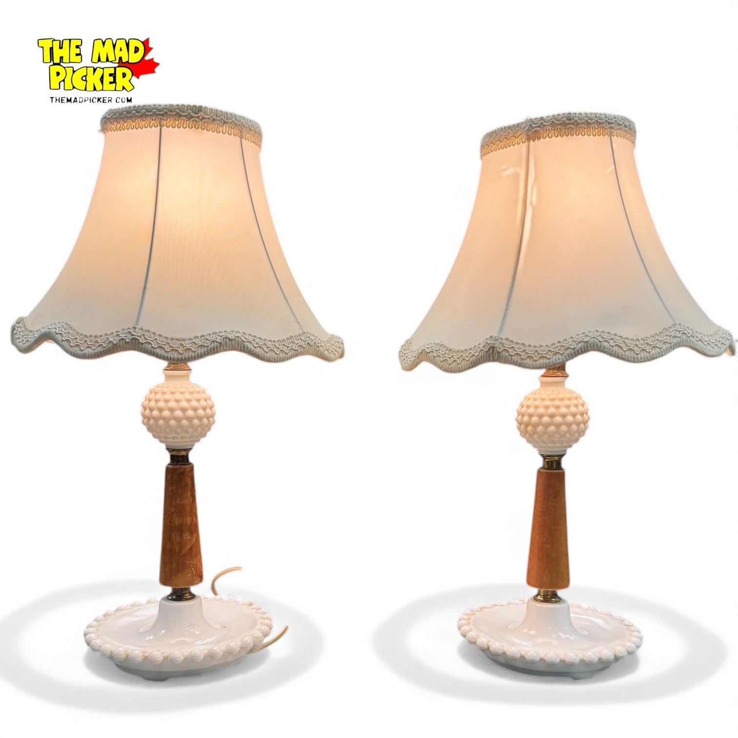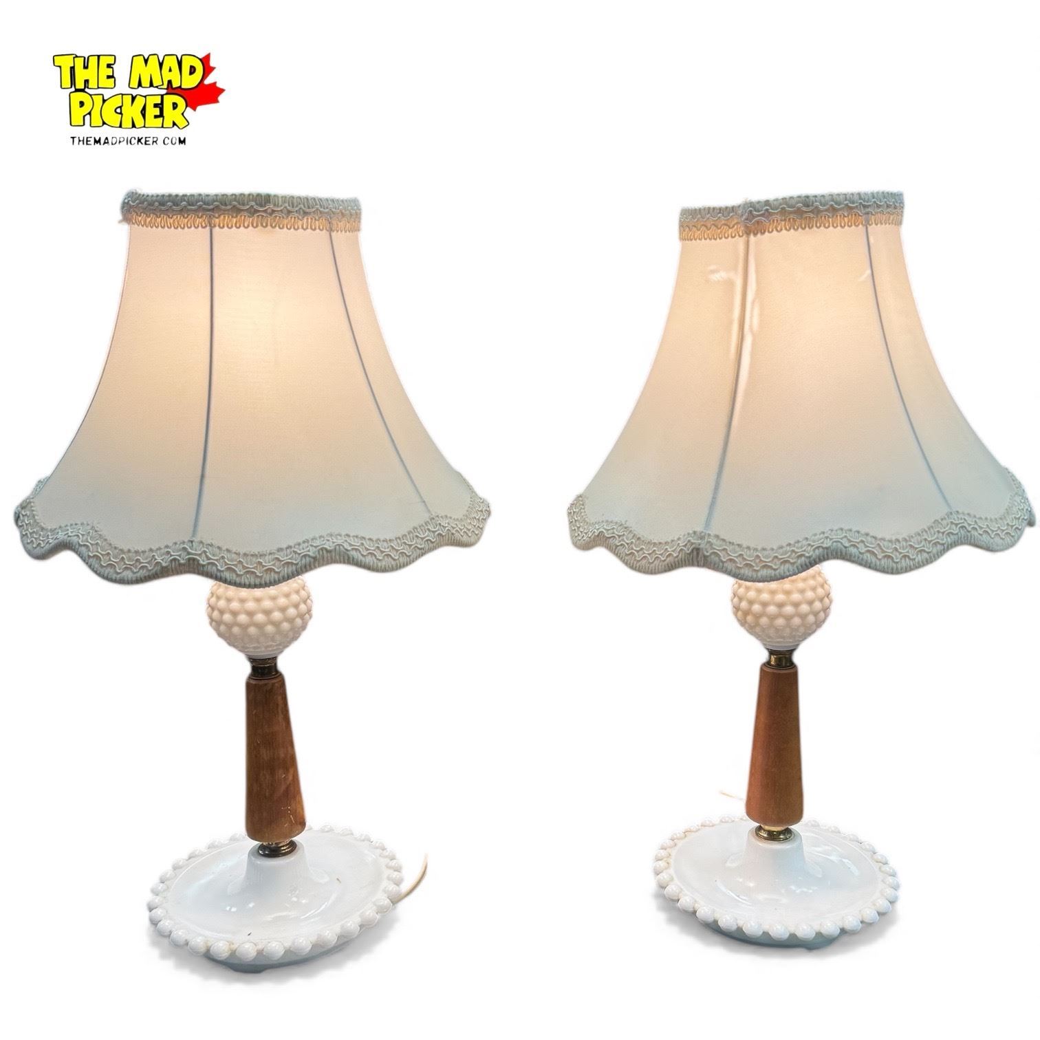 Pair of Vintage White Hobnail mile Glass Table Lamps w Wood Stem and Fabric Shade 17" Tall