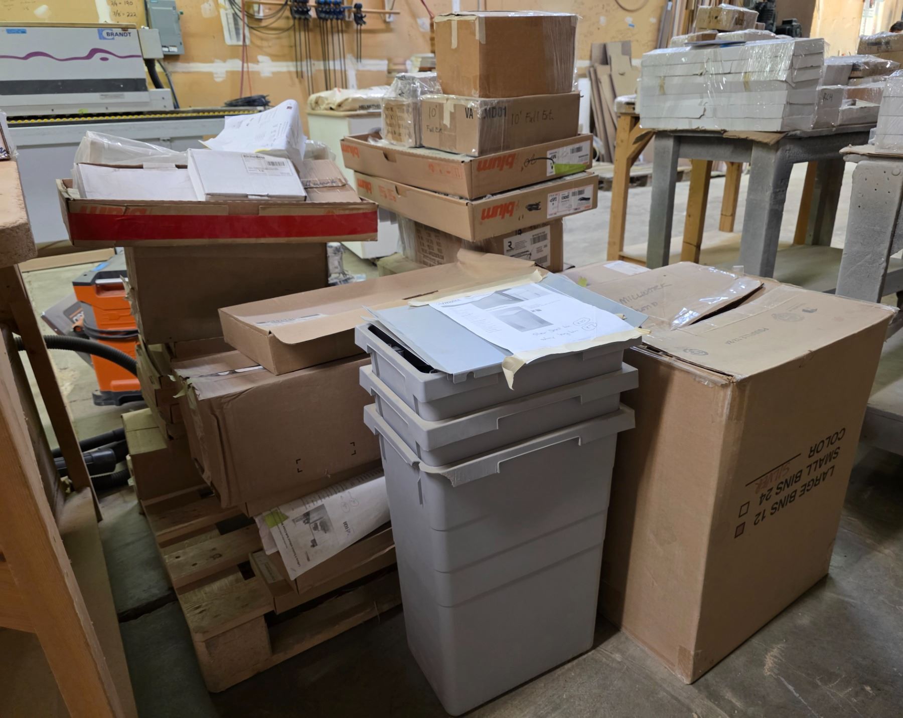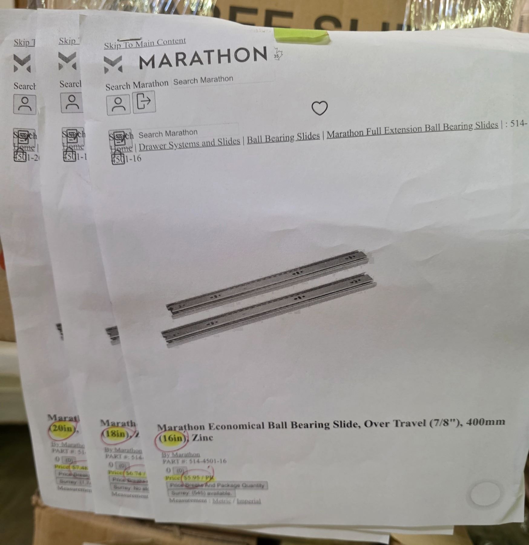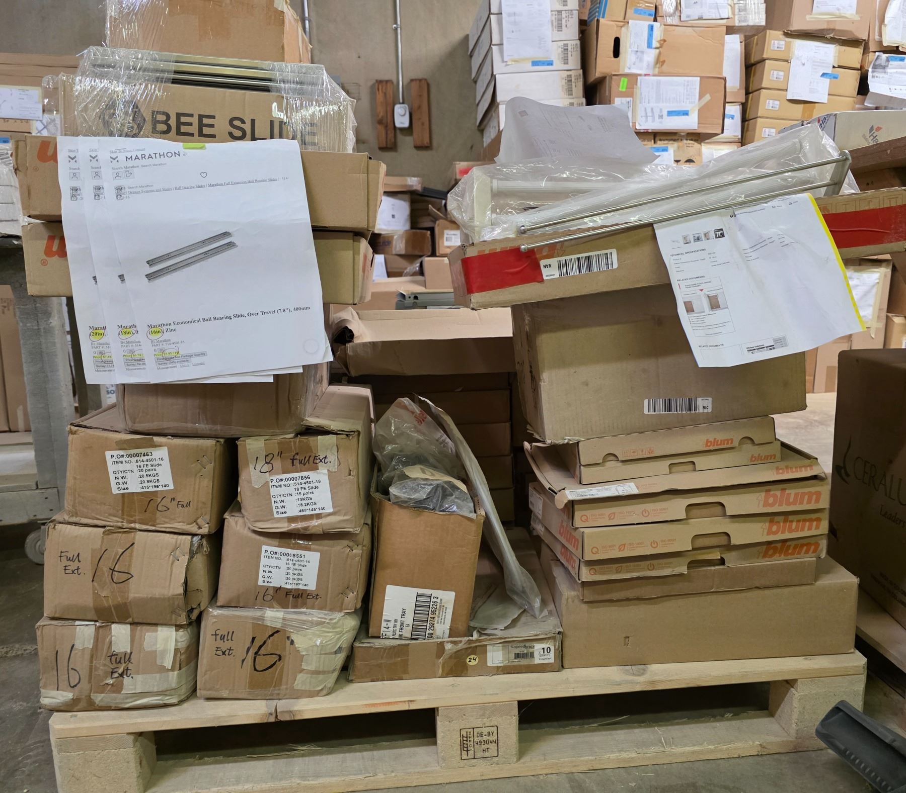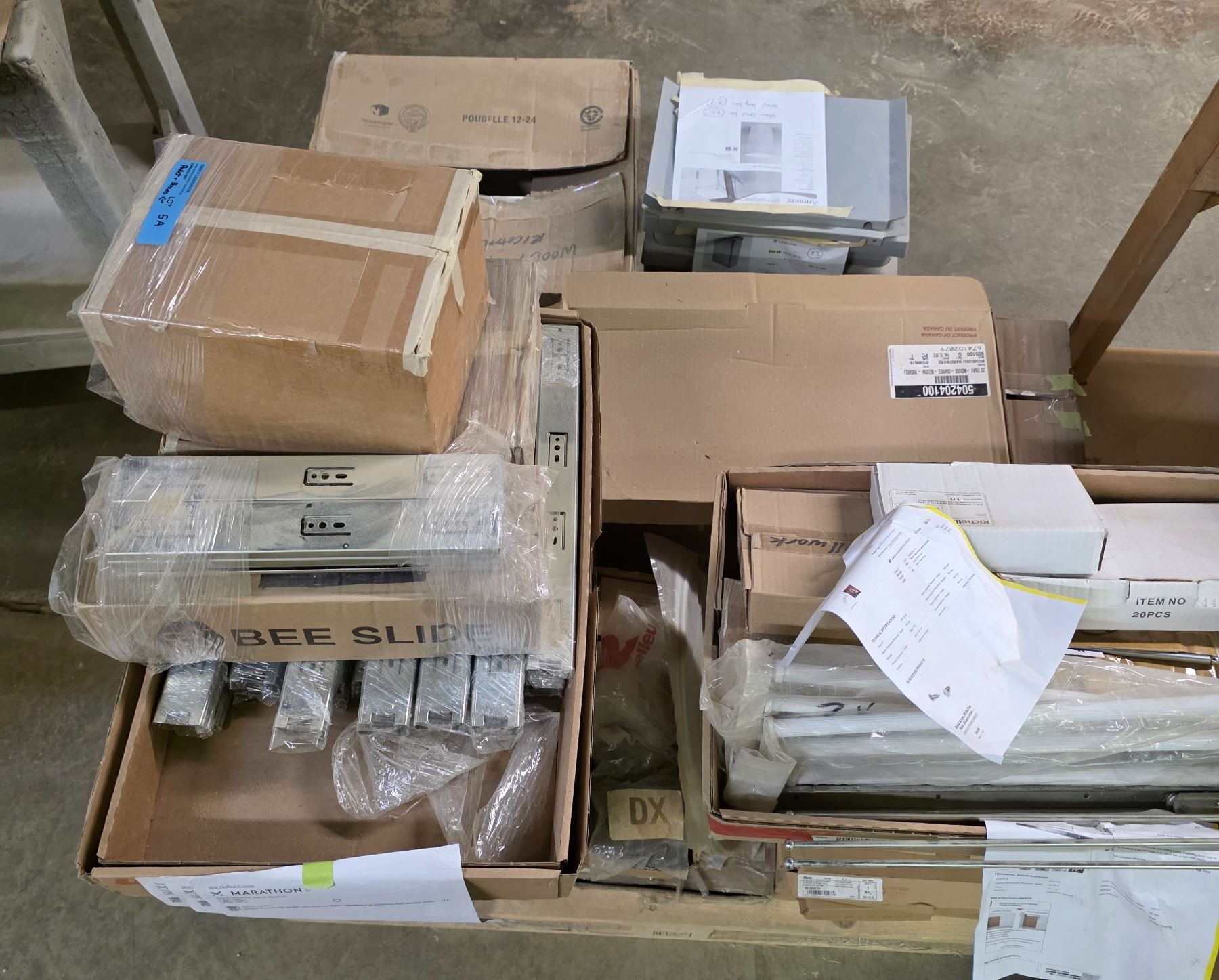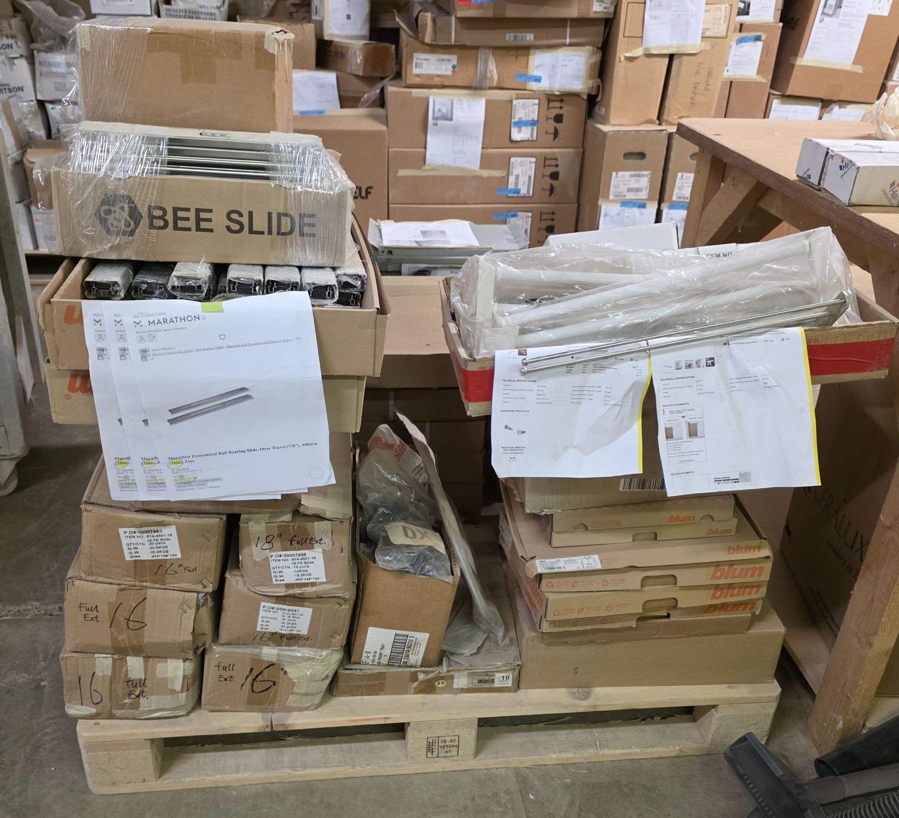 Pallet - Assorted Accuride & Blum drawer slides, fasteners, Kessebohmer Freefold hardware, etc. - Approx. Wholesale Value: $3,000++