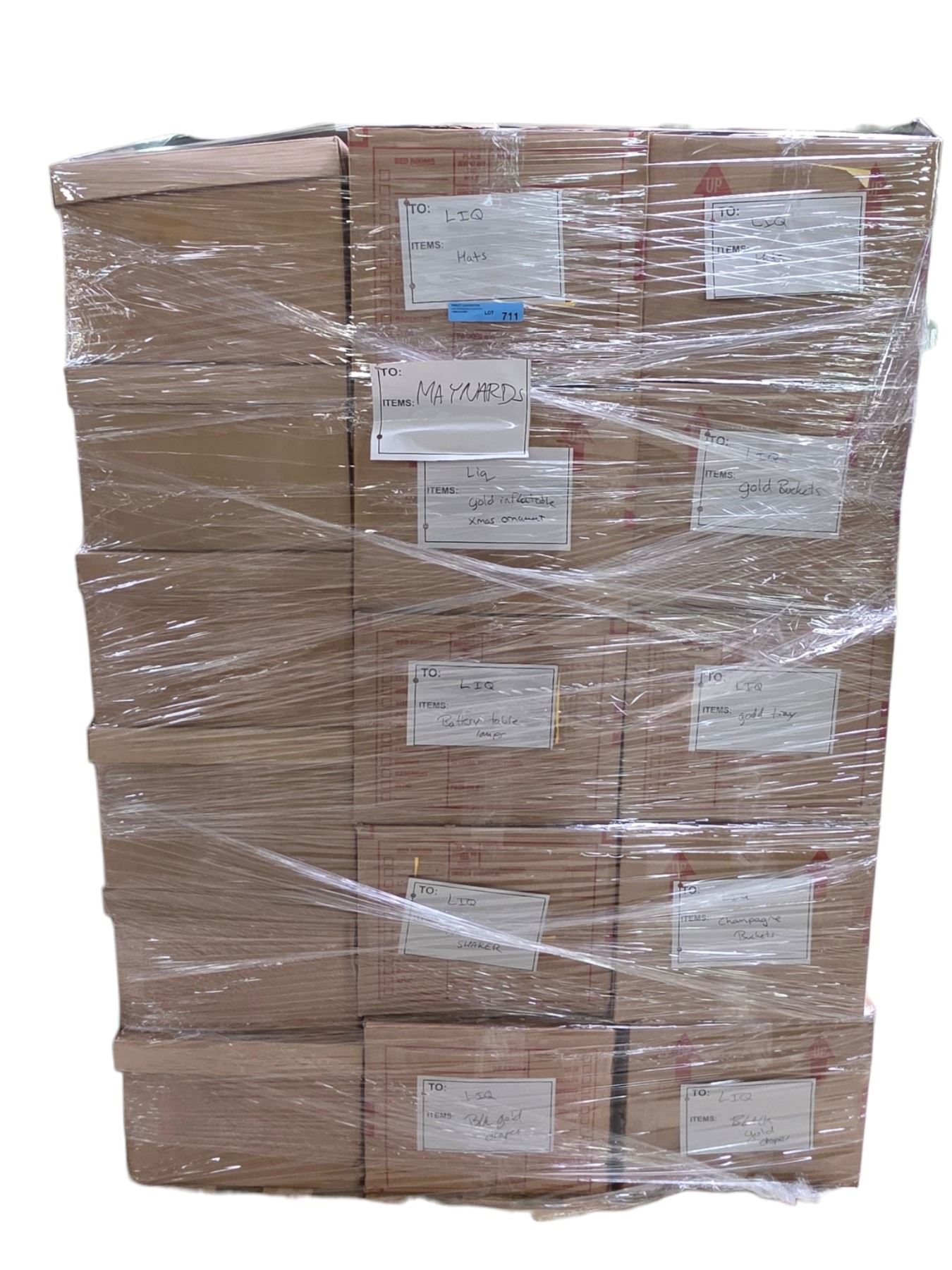 Pallet of Labeled Set Dec Boxes Containing Hats, Gold Buckets, Barware, Decor & Assorted Household Items
