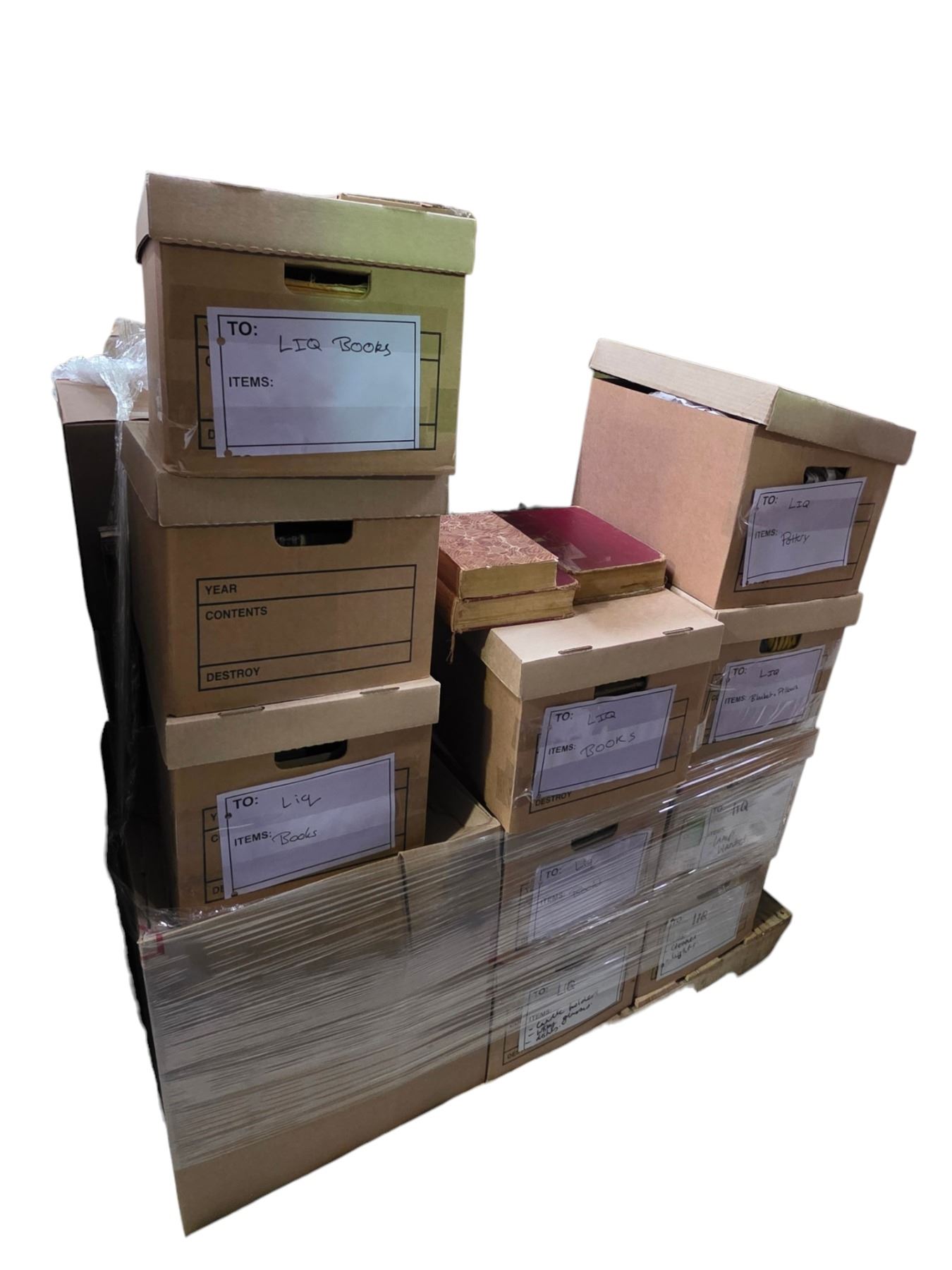 Pallet of Labeled Storage Boxes Containing Books, Antique Books, Candle Holders, Fans, Pillows, Ligh