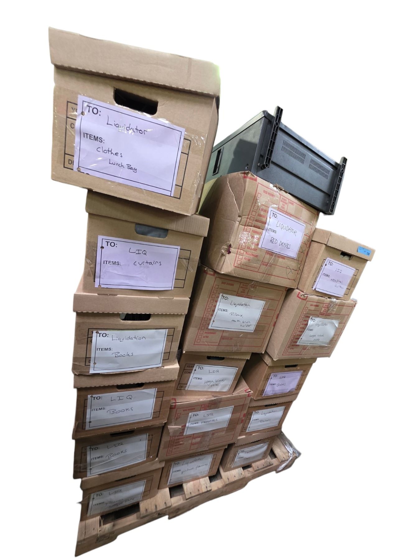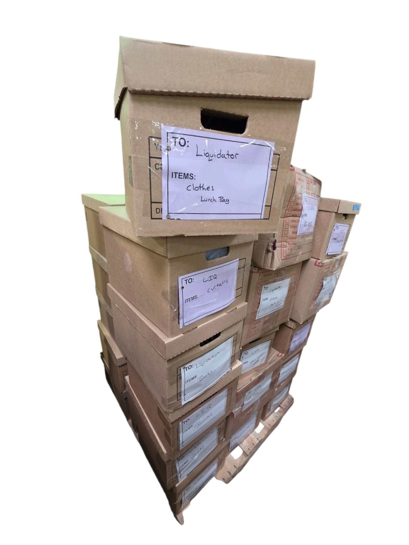 Pallet of Labelled Set Dec Boxes Containing Clothing, Curtains, Books & Misc. Household Items