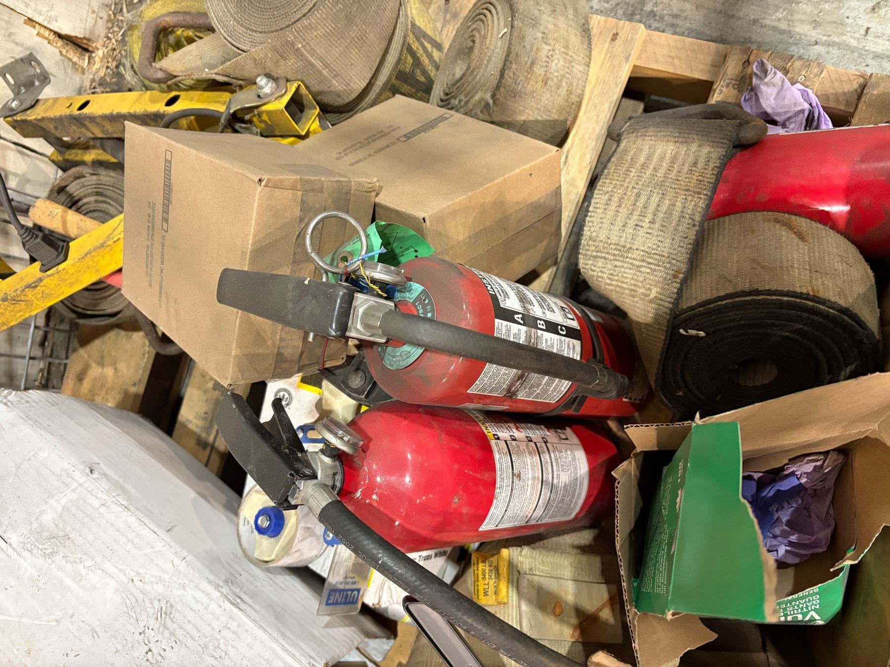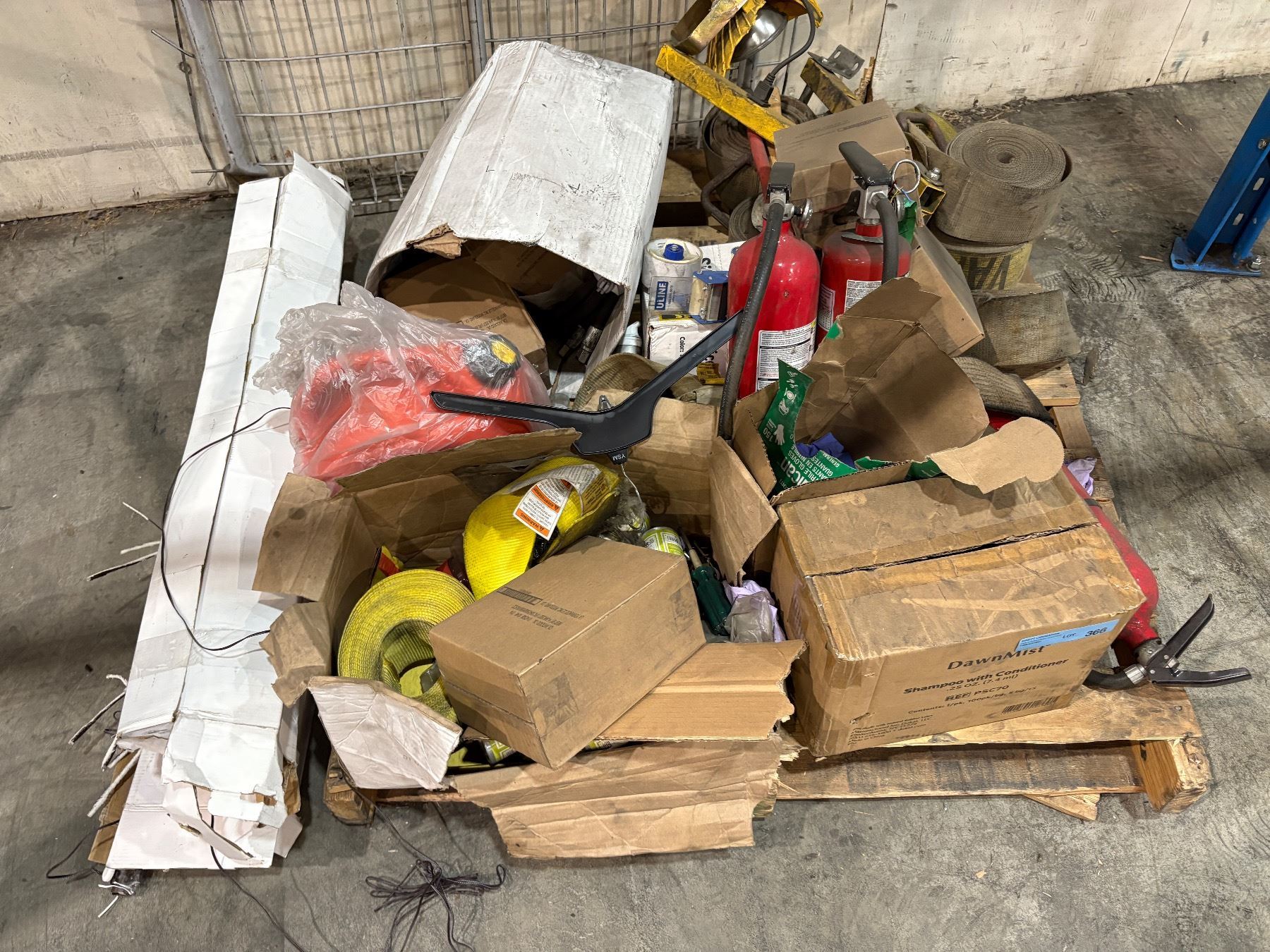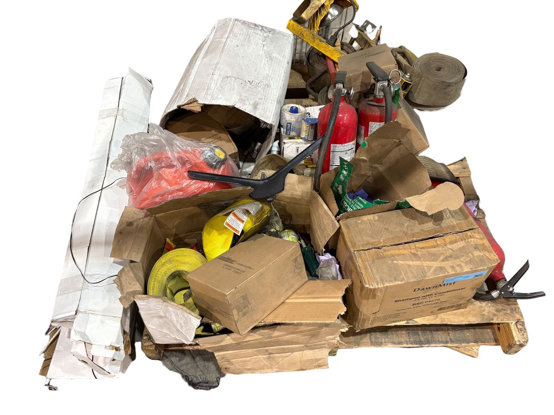Pallet of Misc - Fire Extinguishers, Gas Can, Shampoo, Work Light, Etc.